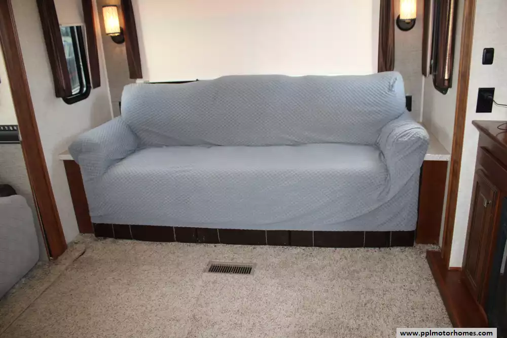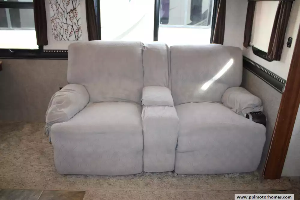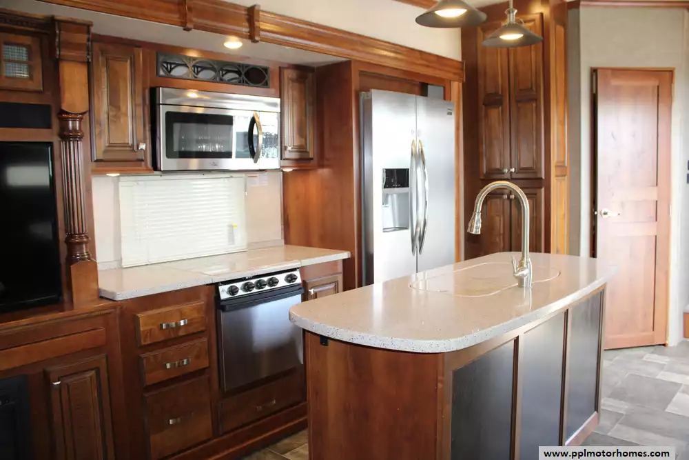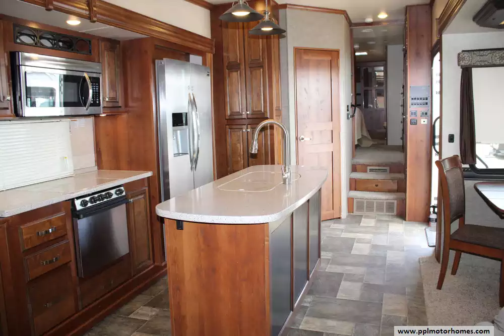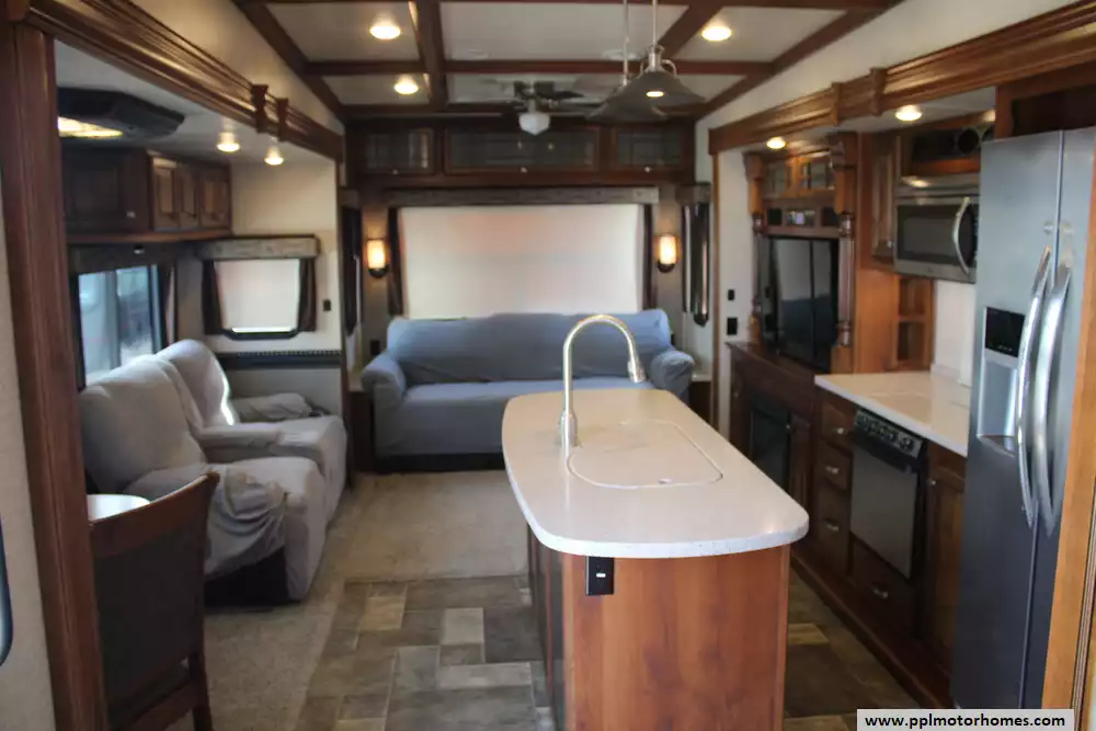 The 2016 Heartland Bighorn 3875FB is a luxury fifth-wheel RV designed for extended stays and full-time living, offering a spacious residential-style layout with high-end amenities. Measuring about 41 feet 7 inches in length and featuring three slide-outs, it provides a roomy interior highlighted by a rear living area with sofa seating and reclining theater seats, a central kitchen with solid-surface countertops and a mid-size refrigerator, and a unique front bathroom layout that includes a large master bath plus a convenient half bath, allowing it to sleep up to four people comfortably.