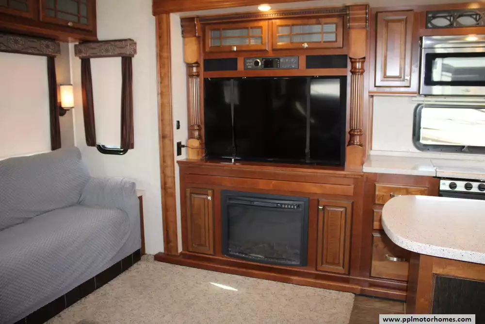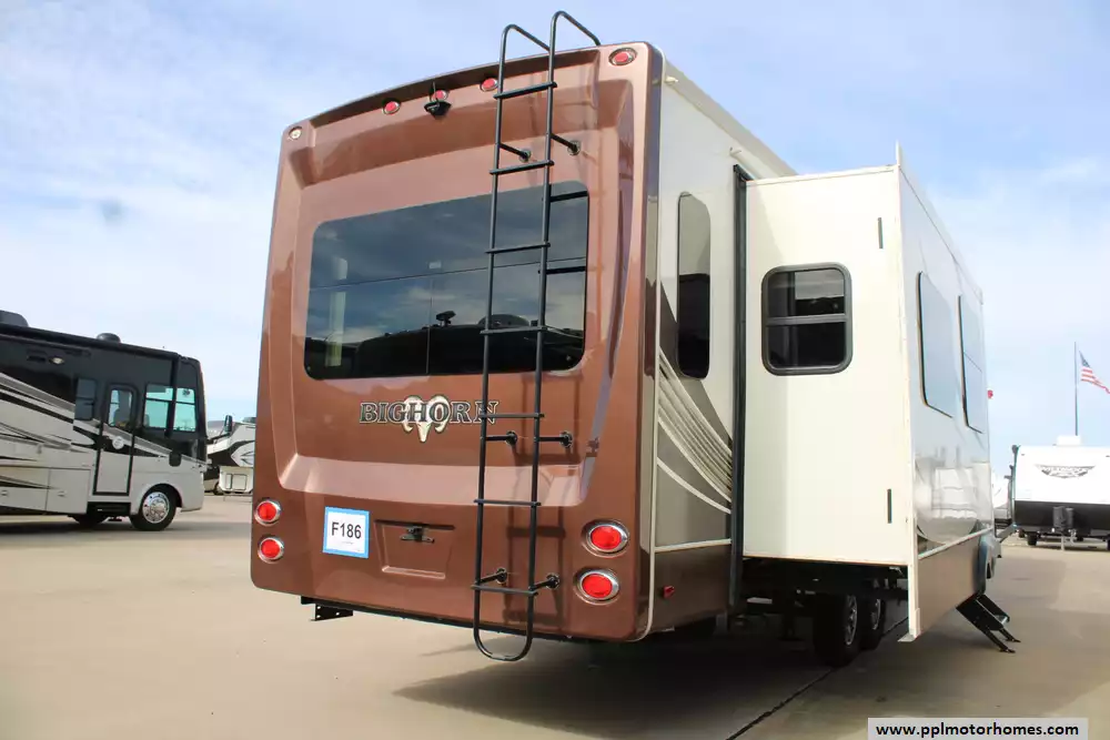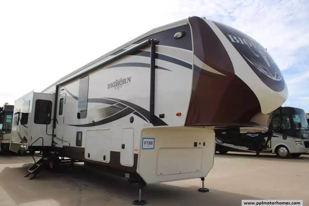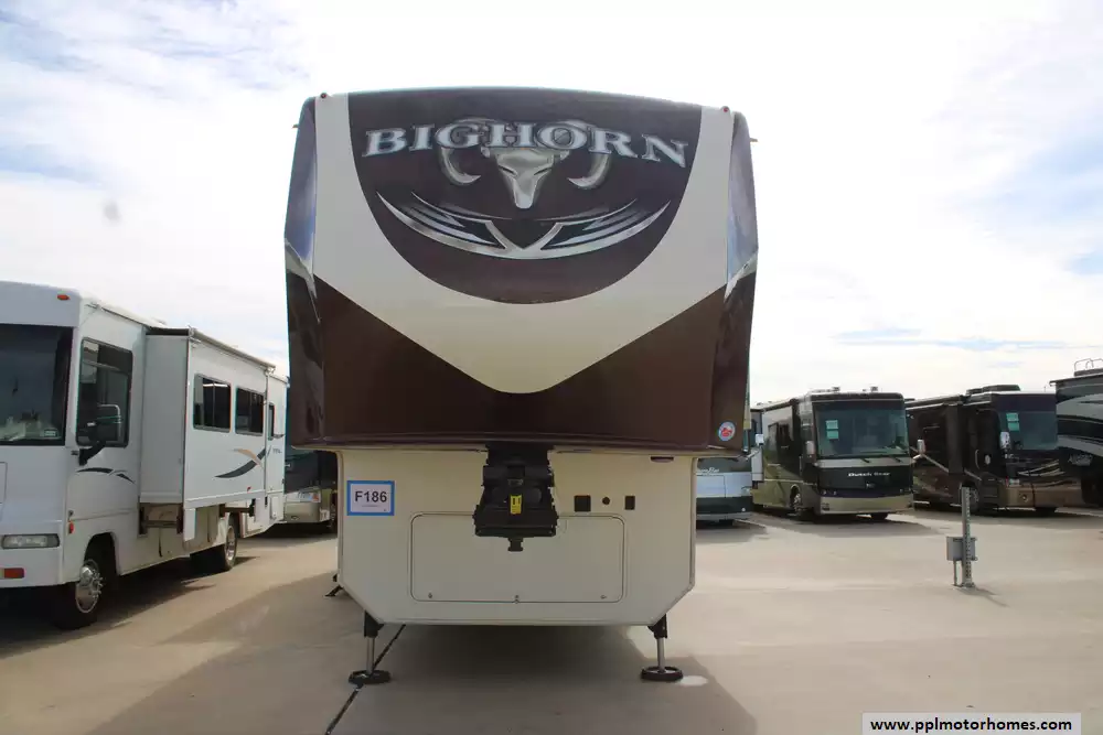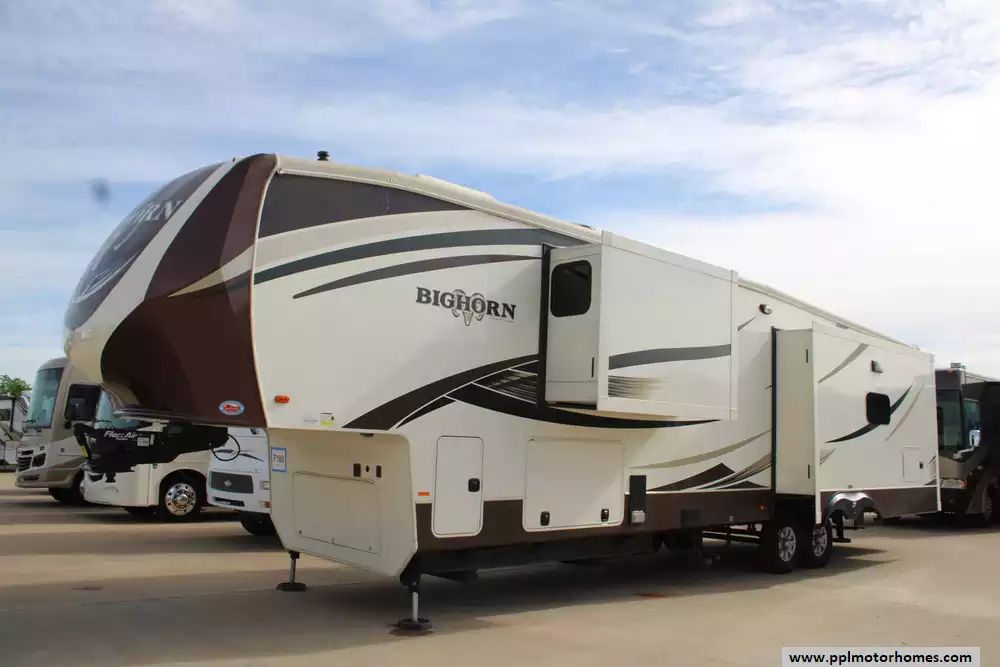Built with aluminum framing and fiberglass sidewalls, it emphasizes durability and insulation, complemented by features like dual air conditioners (30,000 BTU), a 42,000 BTU furnace, and generous holding tank capacities for extended trips. Additional touches such as optional theater seating, fireplace, washer/dryer prep, and upscale cabinetry make the Bighorn 3875FB a well-appointed choice for RVers seeking comfort, space, and residential convenience on the road.