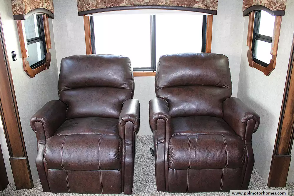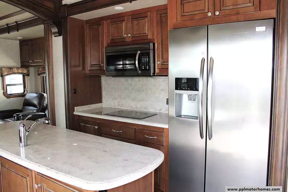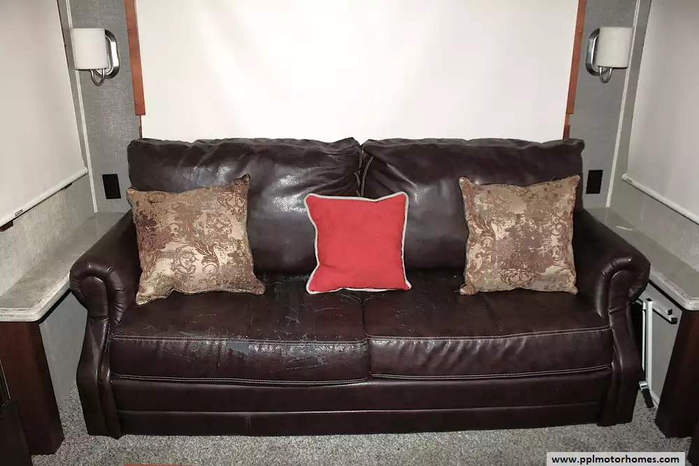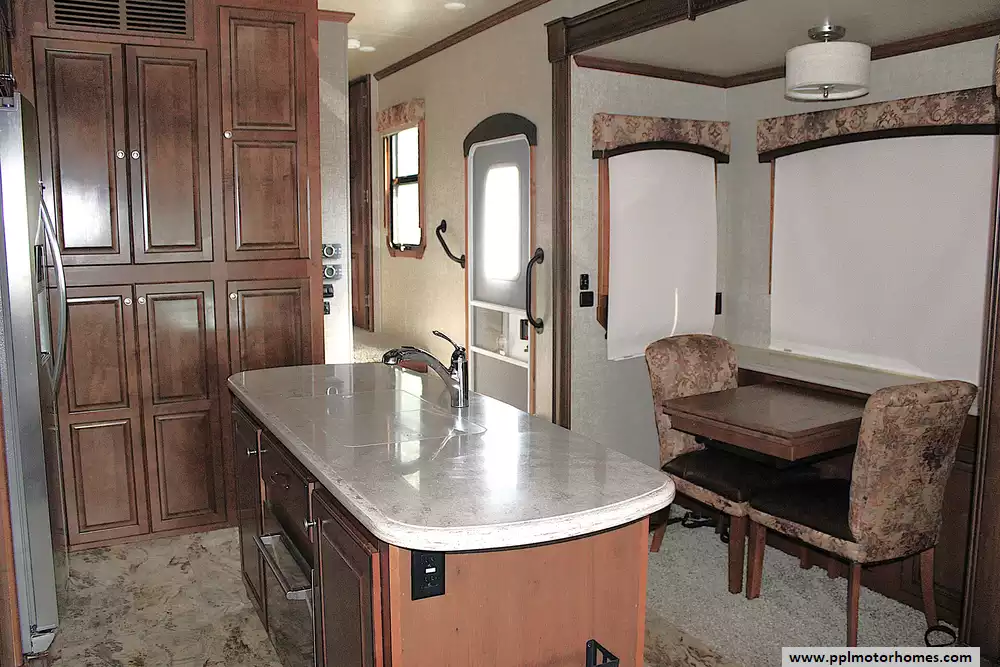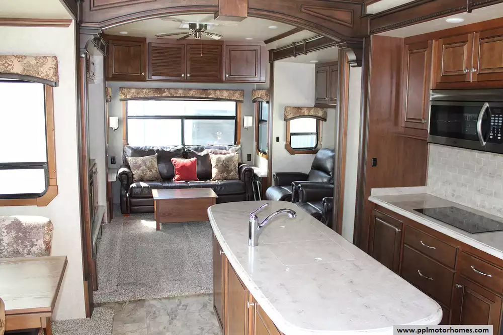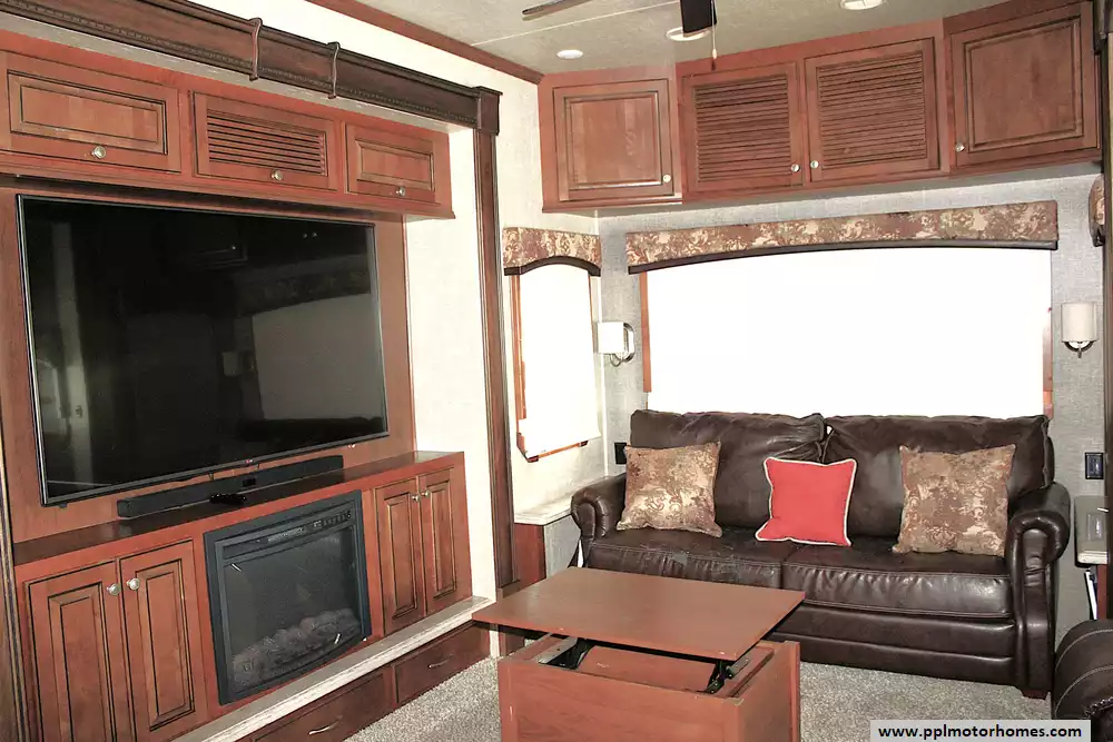 2016 Heartland Landmark Charleston, a high-end fifth wheel designed for comfort, space, and full-time living. The sought-after front living floorplan opens up into a residential-style lounge with opposing sofas, theater seating, a large entertainment center, and a cozy fireplace-perfect for relaxing after a long day. The spacious kitchen features solid surface countertops, a center island, abundant cabinetry, and a residential refrigerator, giving you all the conveniences of home on the road. With five slide-outs, this unit offers an incredibly open and inviting interior that truly stands out.
