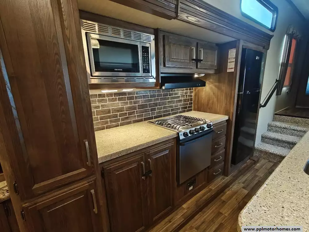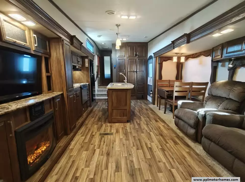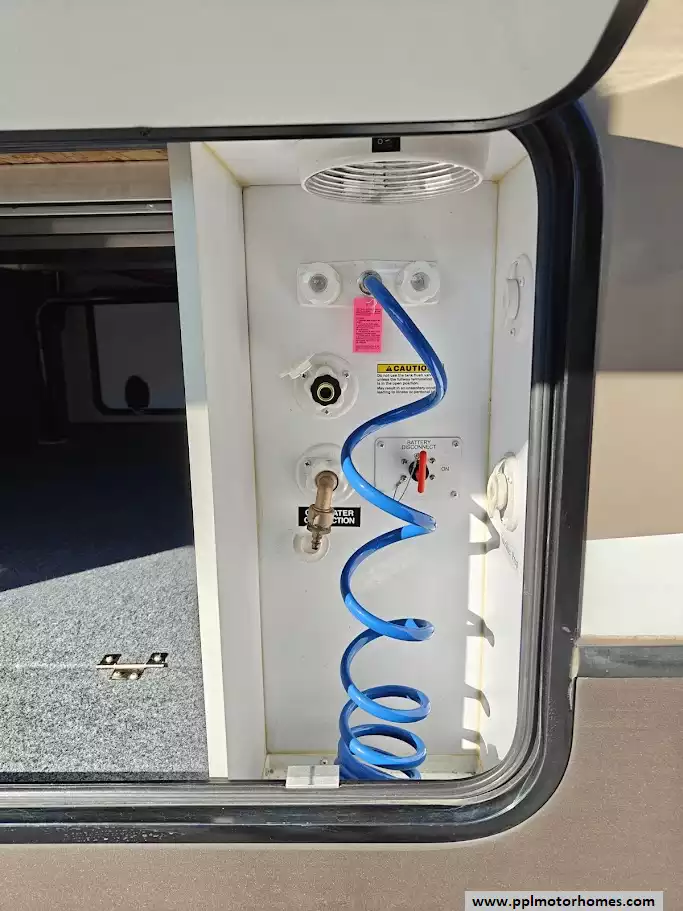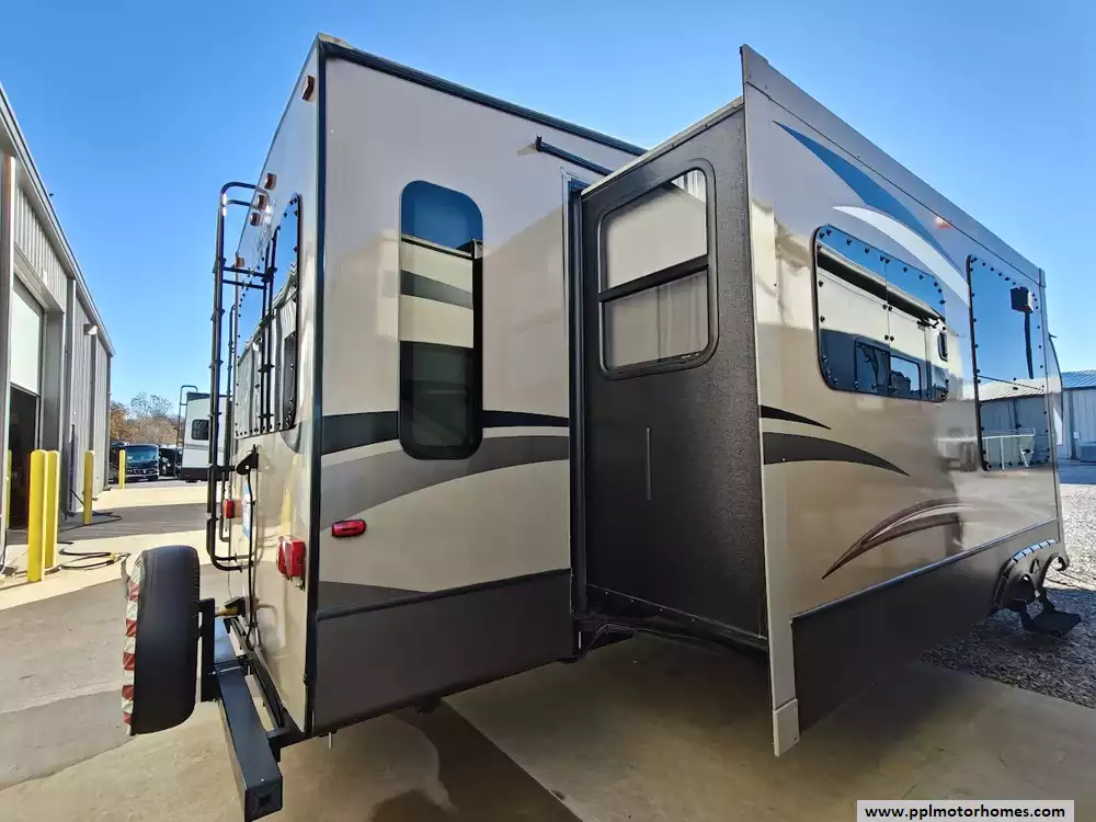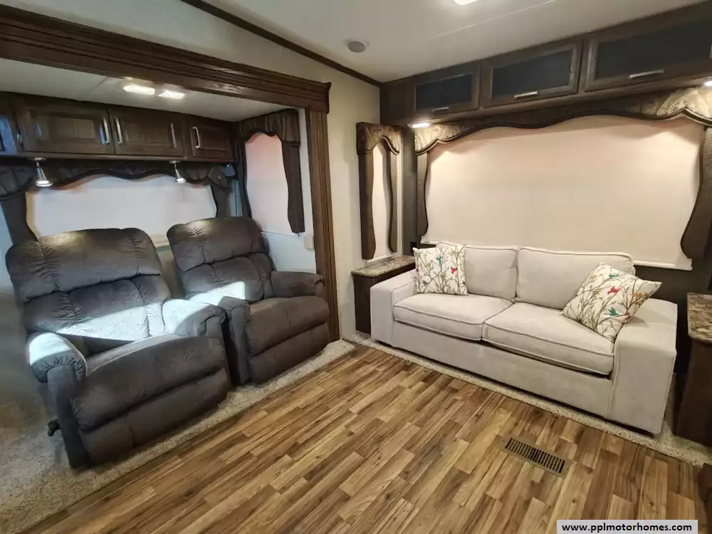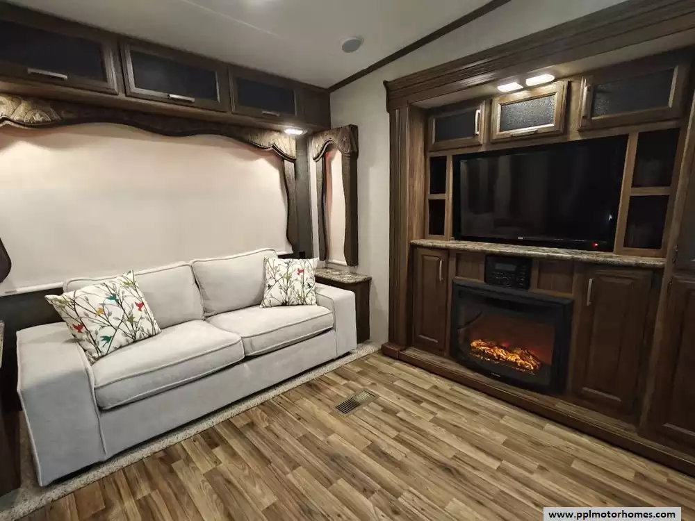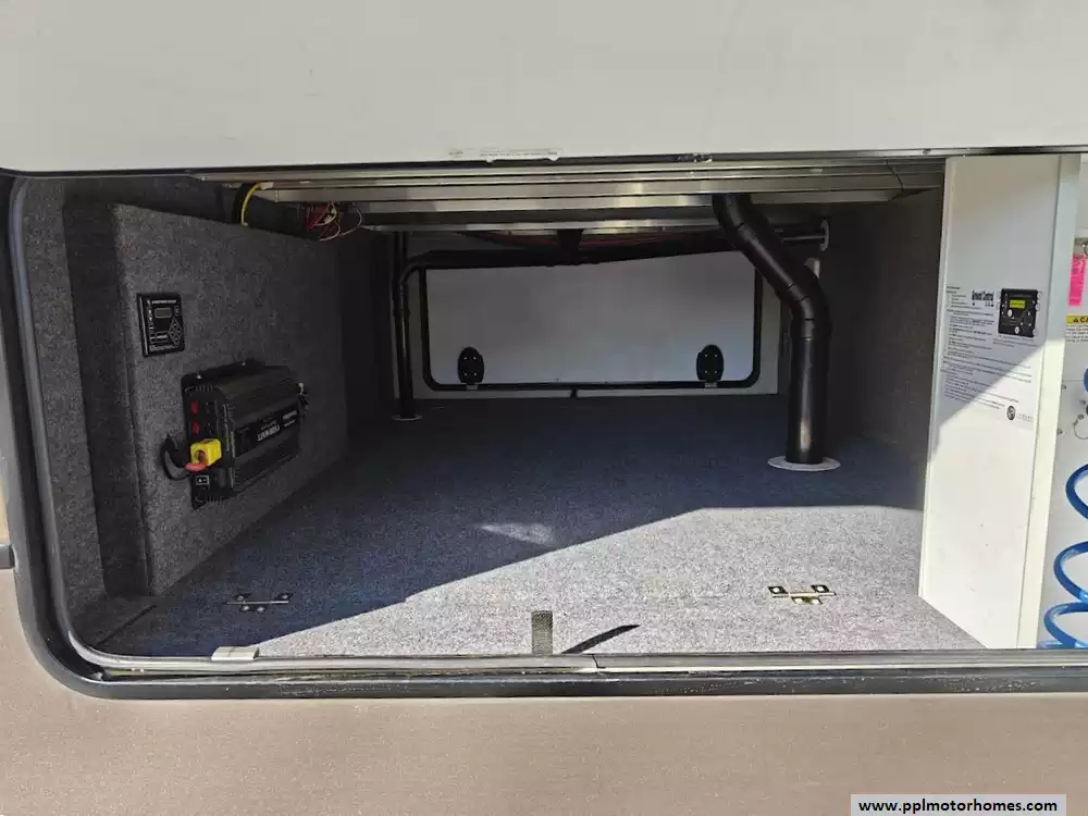 Outside the RV boasts a large, well-lit "XL pass-through storage" compartment at the front, featuring slam-latch baggage doors for secure closure. The fifth wheel is equipped with a four-point electric auto-leveling system, making setup at the campsite quick and easy. The underbelly area is fully enclosed and heated as part of its desing for all-season camping. The extra insulation helps keep the interior floor of the RV warmer, which is especially noticeable in colder weather. The owner has also added a 1500 watt inverter and skies the under side of the slides to help prevent water damage
