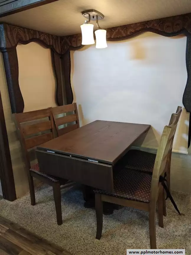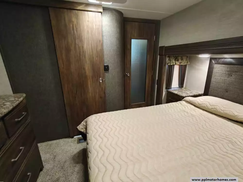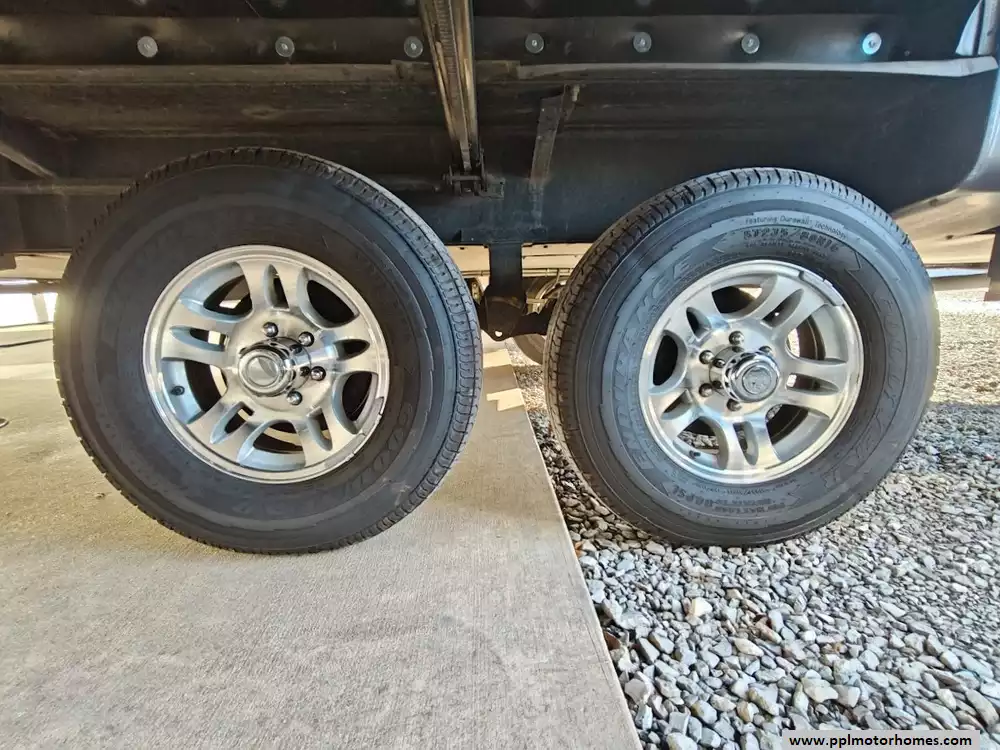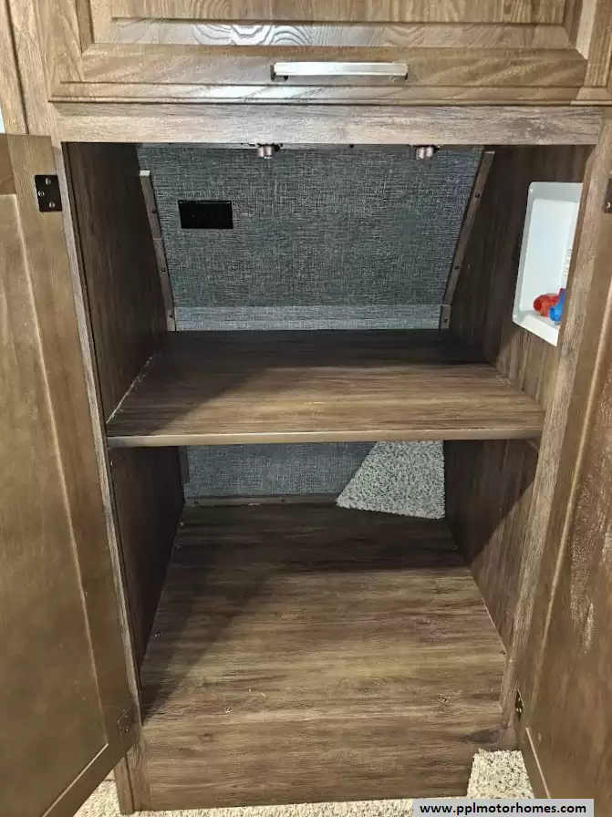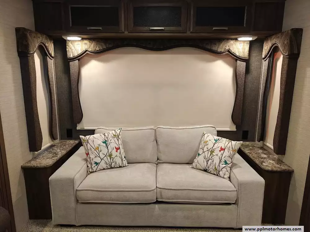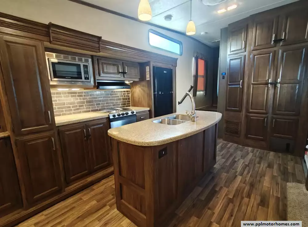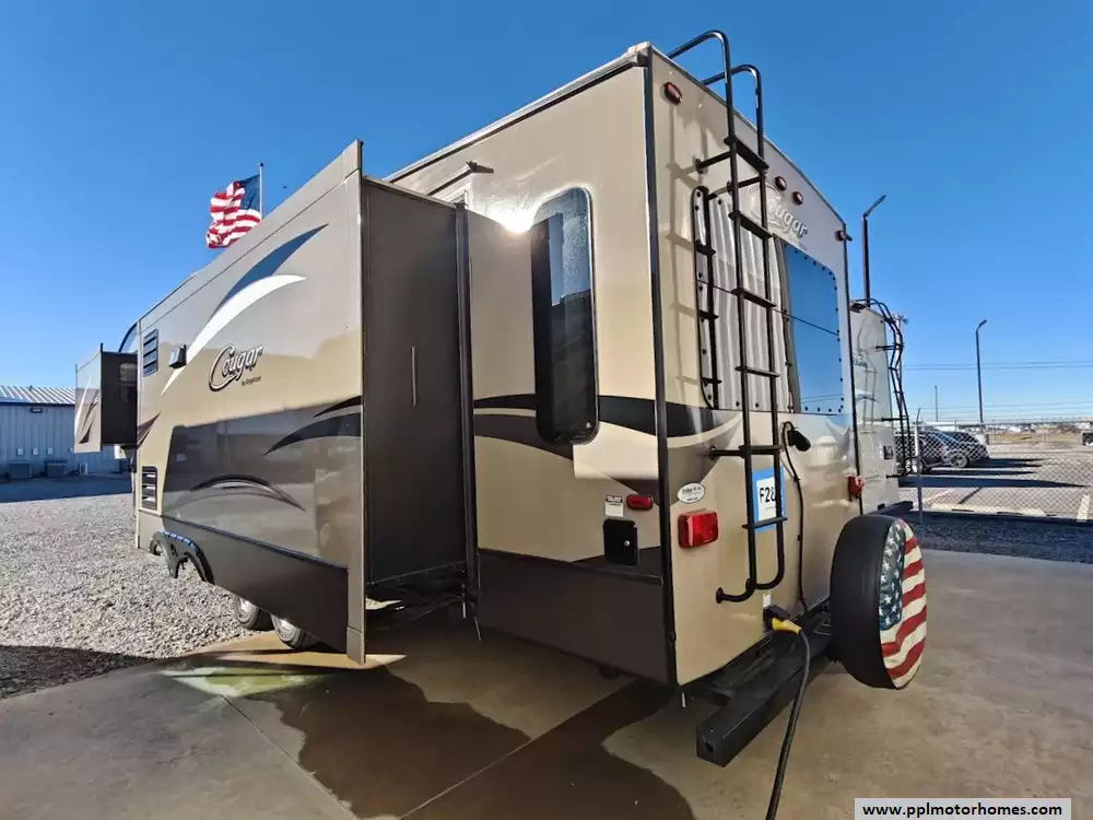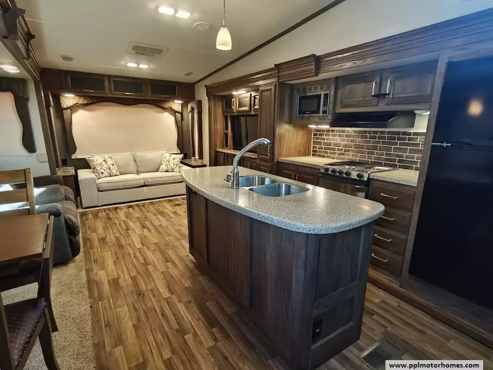 Outside the RV boasts a large, well-lit "XL pass-through storage" compartment at the front, featuring slam-latch baggage doors for secure closure. The fifth wheel is equipped with a four-point electric auto-leveling system, making setup at the campsite quick and easy. The underbelly area is fully enclosed and heated as part of its desing for all-season camping. The extra insulation helps keep the interior floor of the RV warmer, which is especially noticeable in colder weather. The owner has also added a 1500 watt inverter and skies the under side of the slides to help prevent water damage