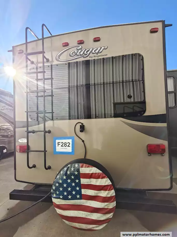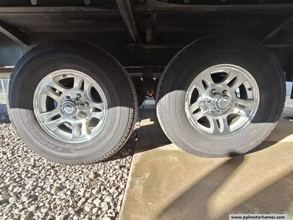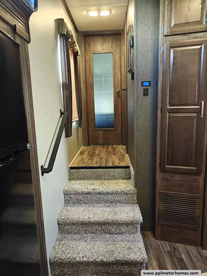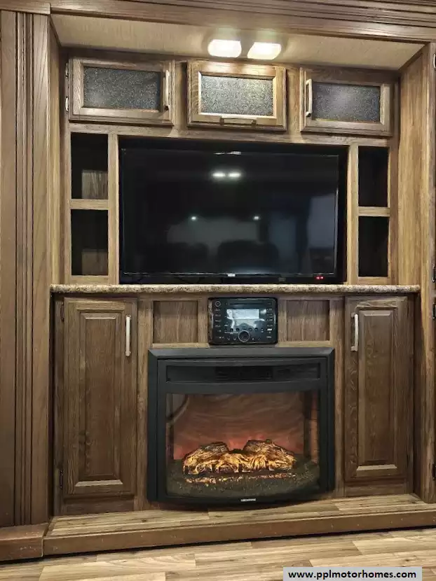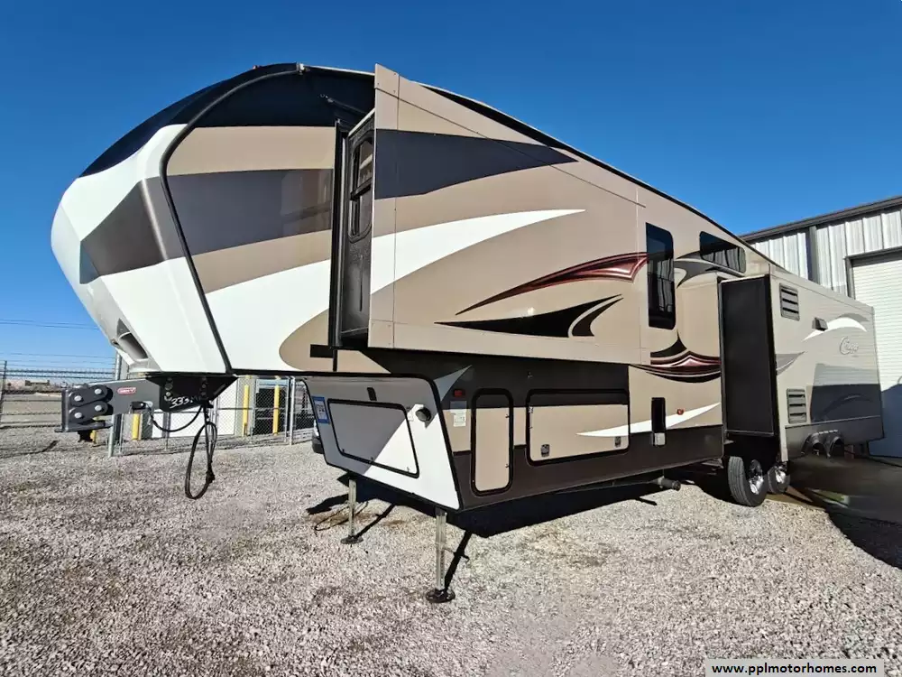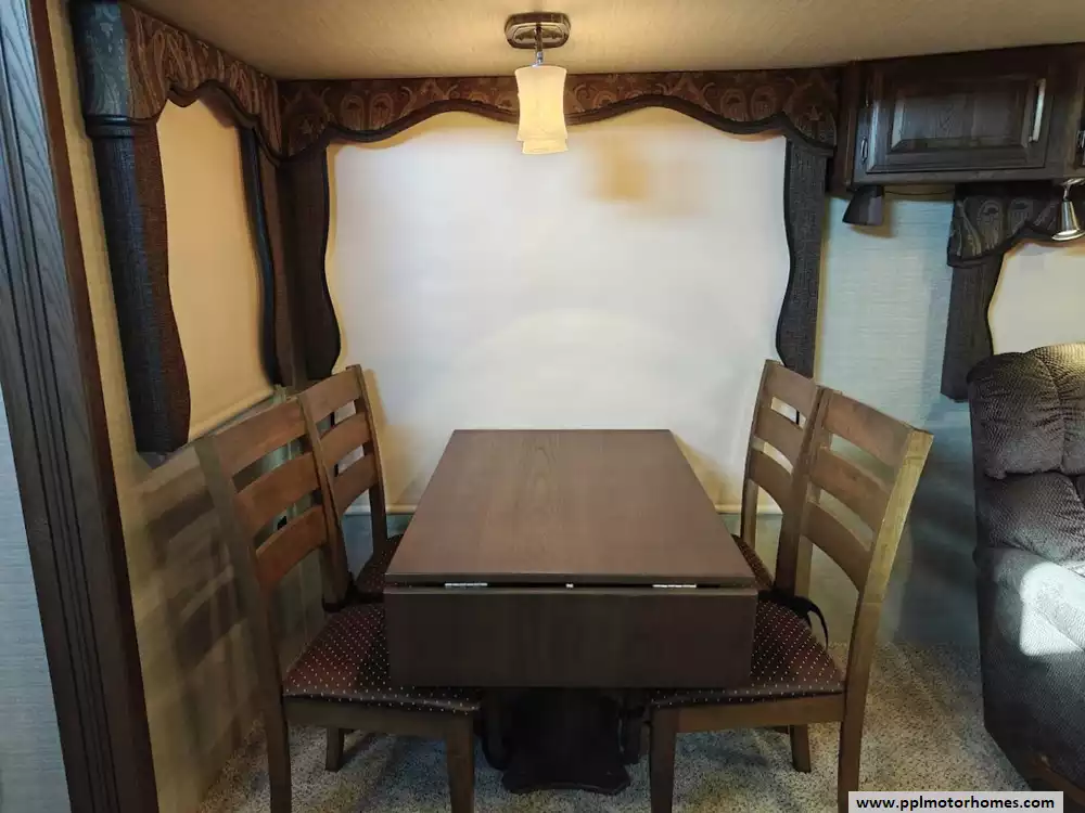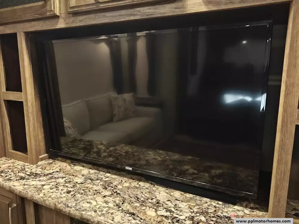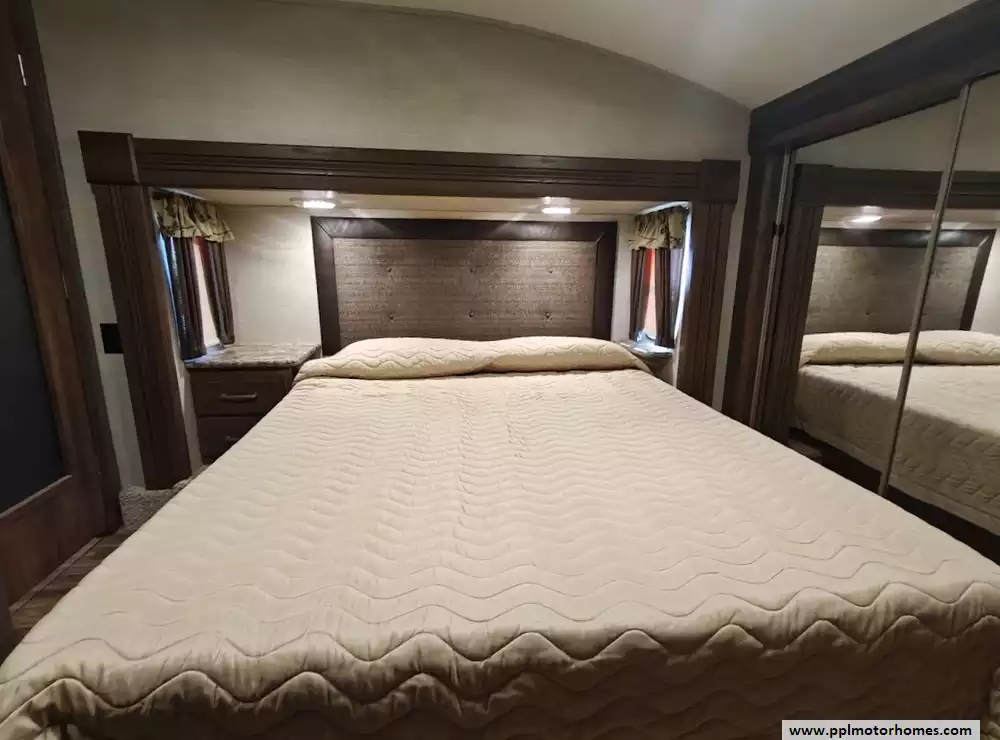 Outside the RV boasts a large, well-lit "XL pass-through storage" compartment at the front, featuring slam-latch baggage doors for secure closure. The fifth wheel is equipped with a four-point electric auto-leveling system, making setup at the campsite quick and easy. The underbelly area is fully enclosed and heated as part of its desing for all-season camping. The extra insulation helps keep the interior floor of the RV warmer, which is especially noticeable in colder weather. The owner has also added a 1500 watt inverter and skies the under side of the slides to help prevent water damage