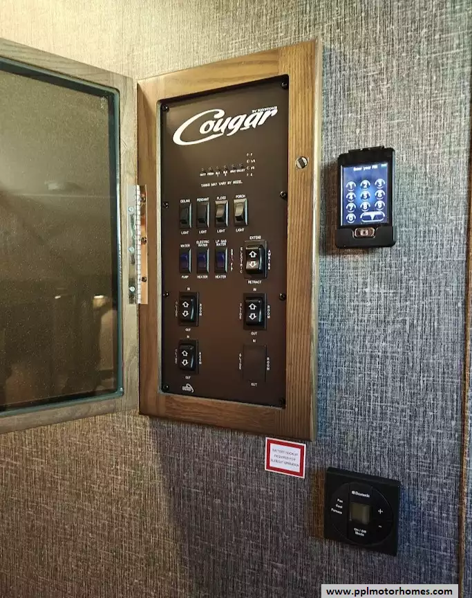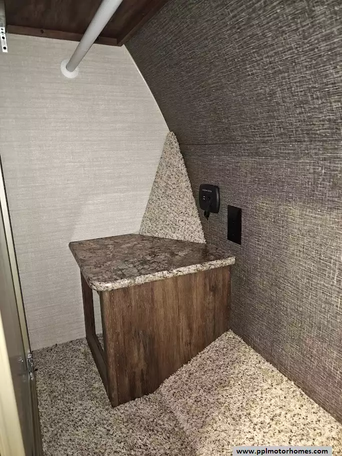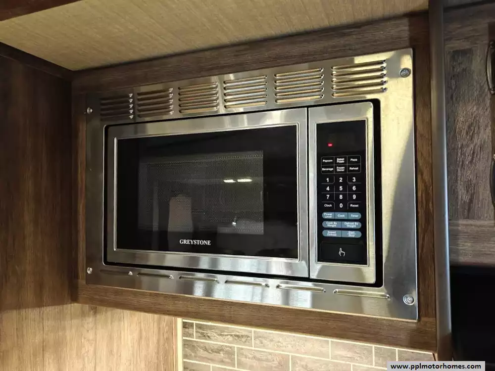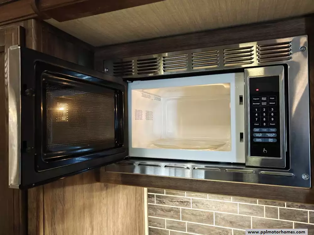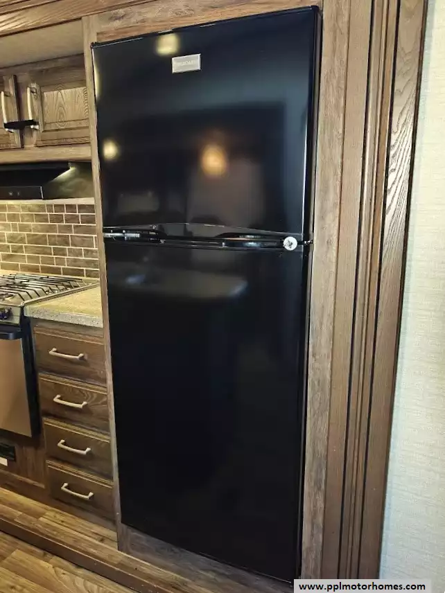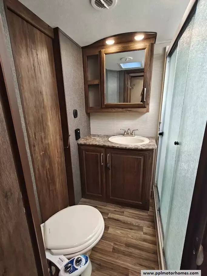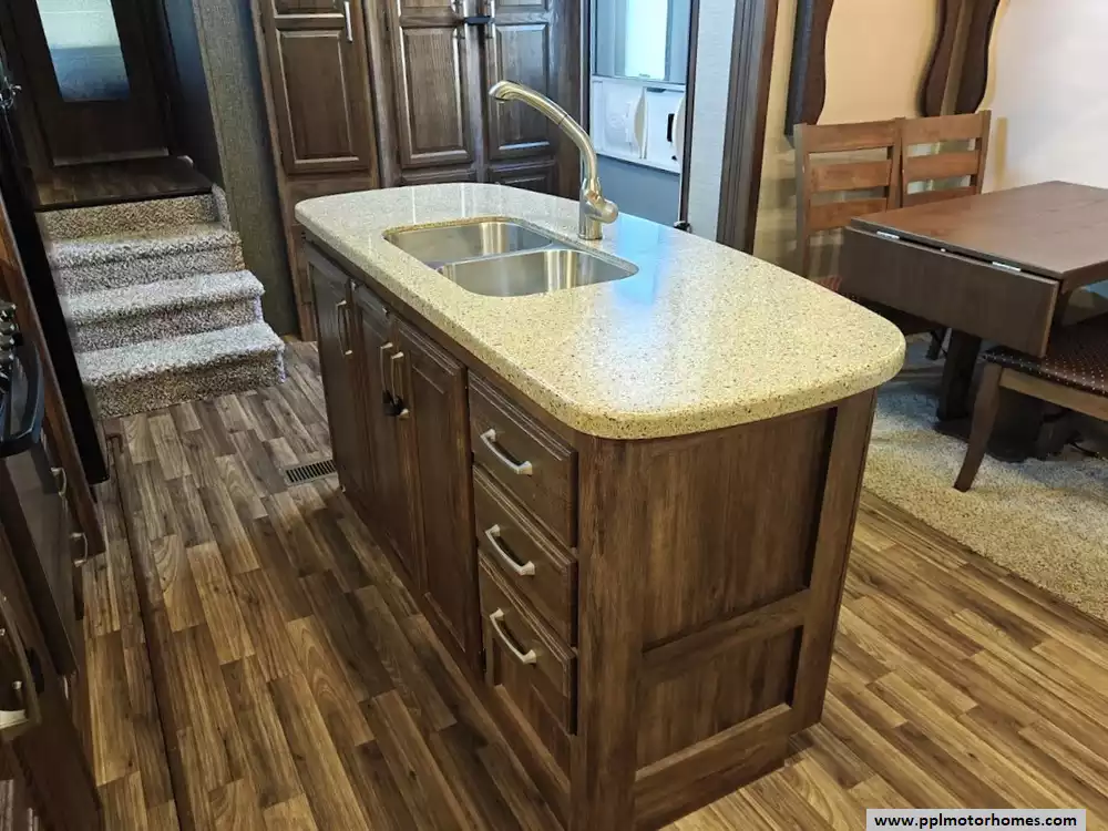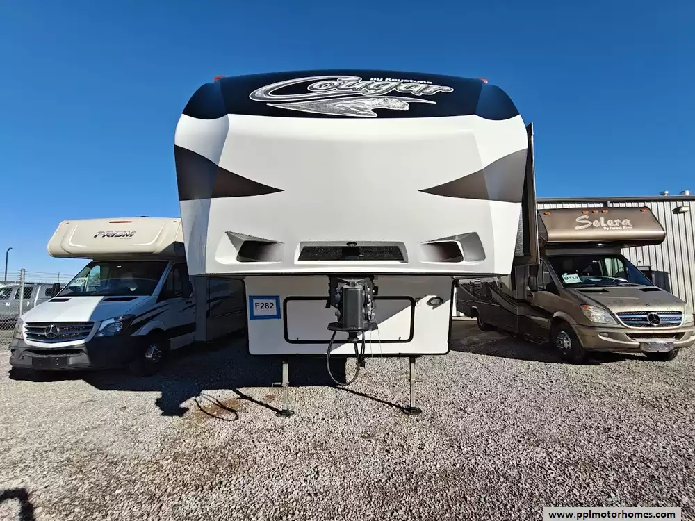Outside the RV boasts a large, well-lit "XL pass-through storage" compartment at the front, featuring slam-latch baggage doors for secure closure. The fifth wheel is equipped with a four-point electric auto-leveling system, making setup at the campsite quick and easy. The underbelly area is fully enclosed and heated as part of its desing for all-season camping. The extra insulation helps keep the interior floor of the RV warmer, which is especially noticeable in colder weather. The owner has also added a 1500 watt inverter and skies the under side of the slides to help prevent water damage