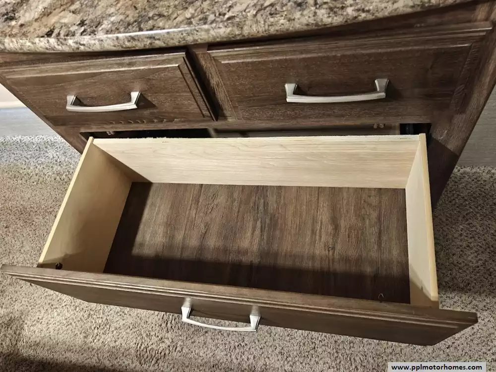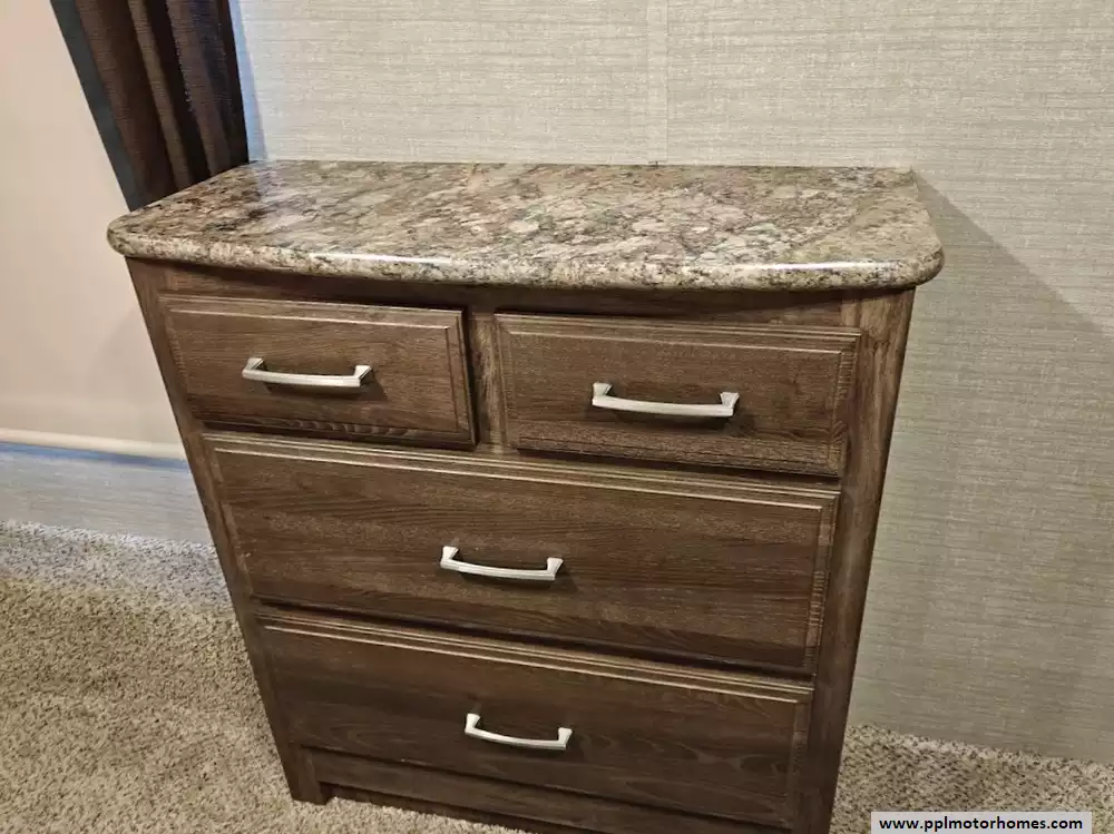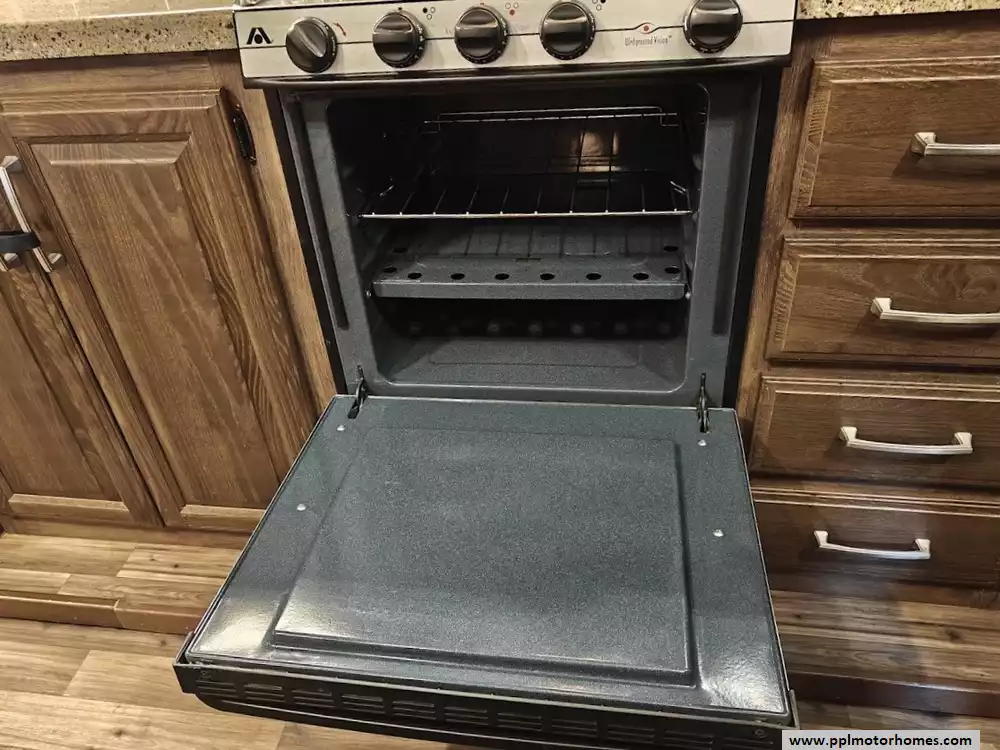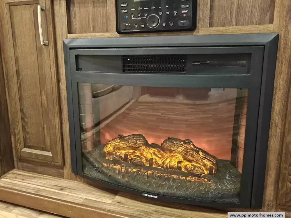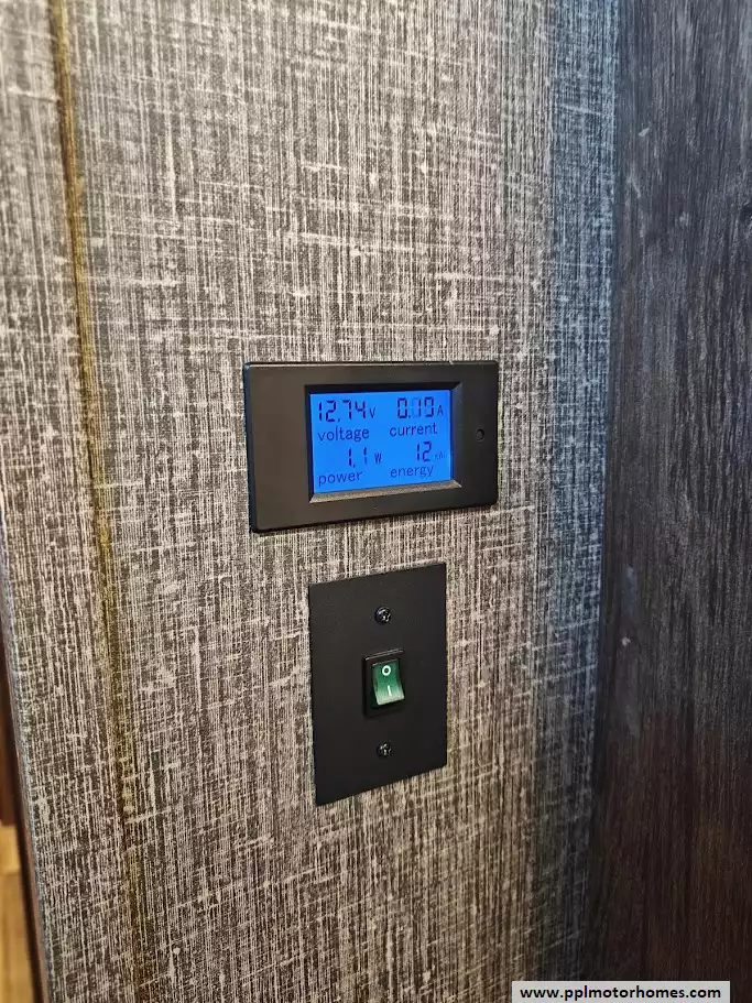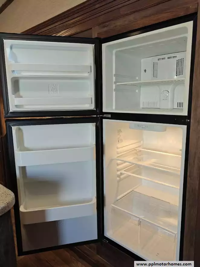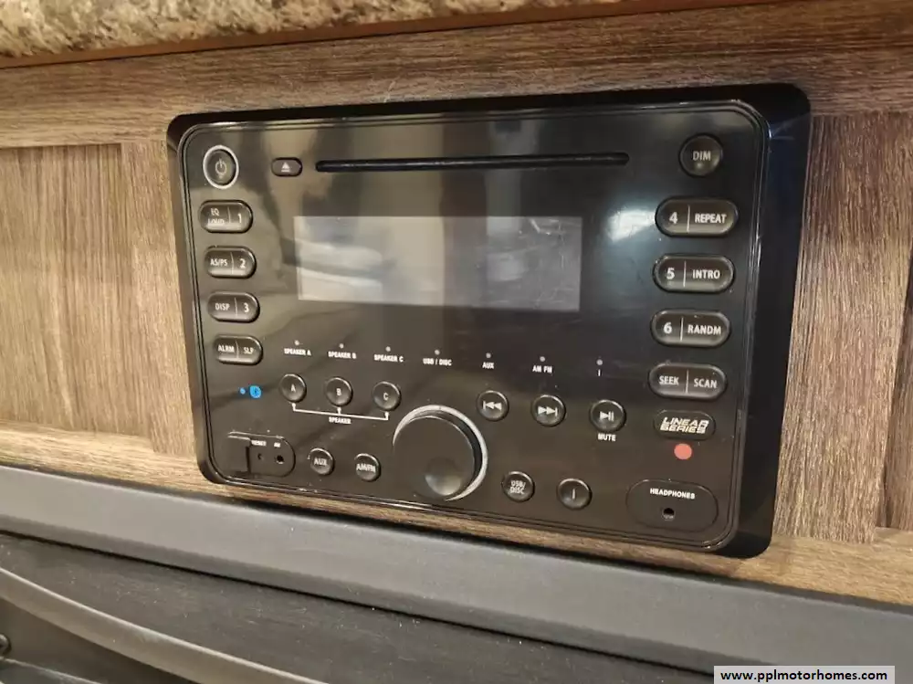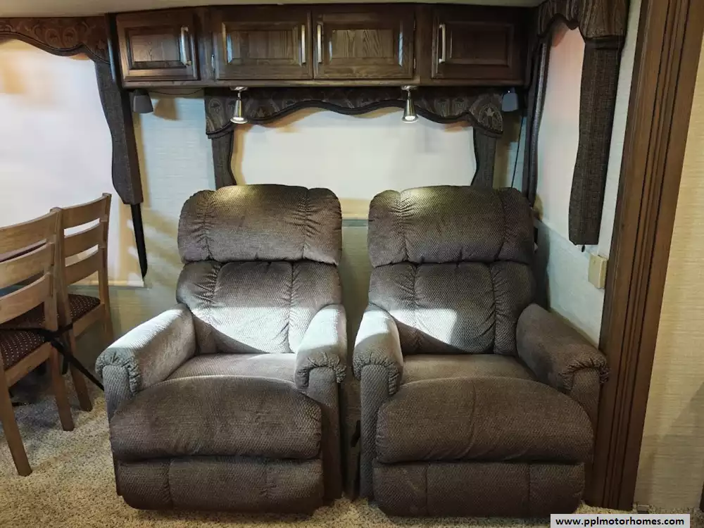 Outside the RV boasts a large, well-lit "XL pass-through storage" compartment at the front, featuring slam-latch baggage doors for secure closure. The fifth wheel is equipped with a four-point electric auto-leveling system, making setup at the campsite quick and easy. The underbelly area is fully enclosed and heated as part of its desing for all-season camping. The extra insulation helps keep the interior floor of the RV warmer, which is especially noticeable in colder weather. The owner has also added a 1500 watt inverter and skies the under side of the slides to help prevent water damage