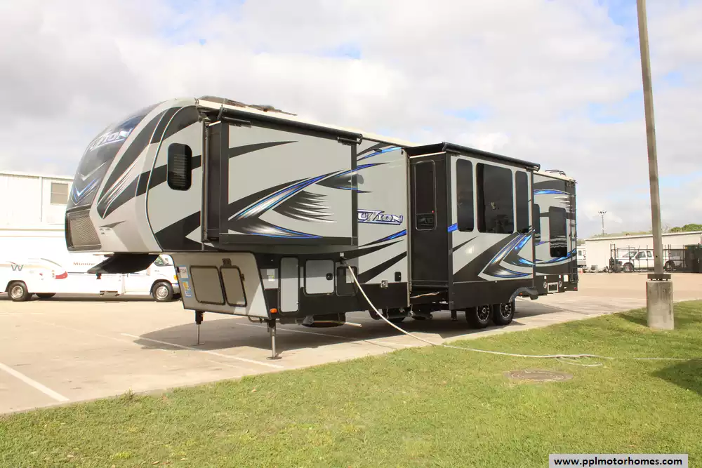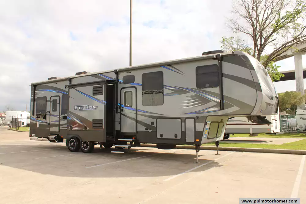 This 2016 Fuzion 345 epitomizes the pinnacle of luxury and versatility in the world of recreational vehicles.This sleek and stylish fifth-wheel toy hauler was designed to provide adventurers with the ultimate combination of comfort,functionality,and performance,making it a standout choice for those seeking the ultimate road-tripping experience.Features Include...3 Slide-outs, Onan Gas Generator, 3 Ducted Air Conditioners, 4 Door Gas/110v Norcold Refrigerator, Automatic Main Awning, Washer/Dryer Connections,Floating Patio,Heat/Massage Theatre Seats, Heated Tanks, Outside Speakers, 3 TVs, DVD Player, Outside Shower,Filling Station, Fireplace, Microwave, 3 Burner Range,and Oven.Sleek lines and aerodynamic contours not only enhanced its visual appeal but also improved fuel efficiency and towing stability.It welcomes occupants into a world of luxury and refinement.