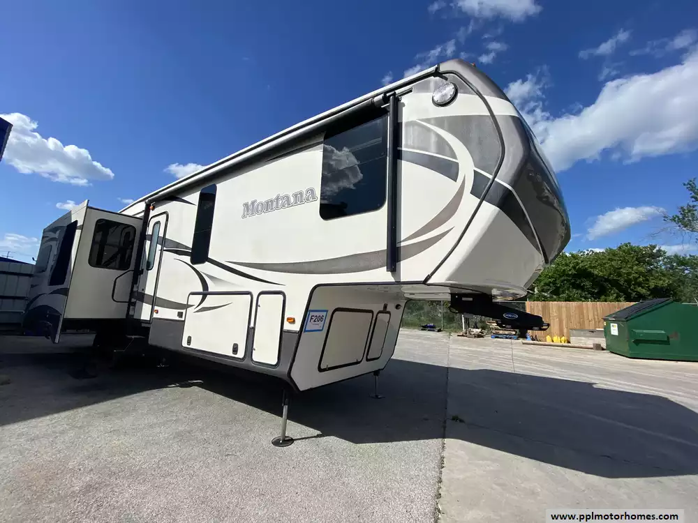 This 2016 Montana by Keystone 3611RL has a Hydraulic Landing Gear, 3 Slide-outs, 2 Ducted Air Conditioners, Residential Samsung Refrigerator, In-Fridge Ice Maker, Automatic Main Awning, Washer/Dryer Connections, Heated Tanks, 2 TVs, DVD Player, Outside Shower, Fireplace, Convection Microwave, 3 Burner Range, Oven