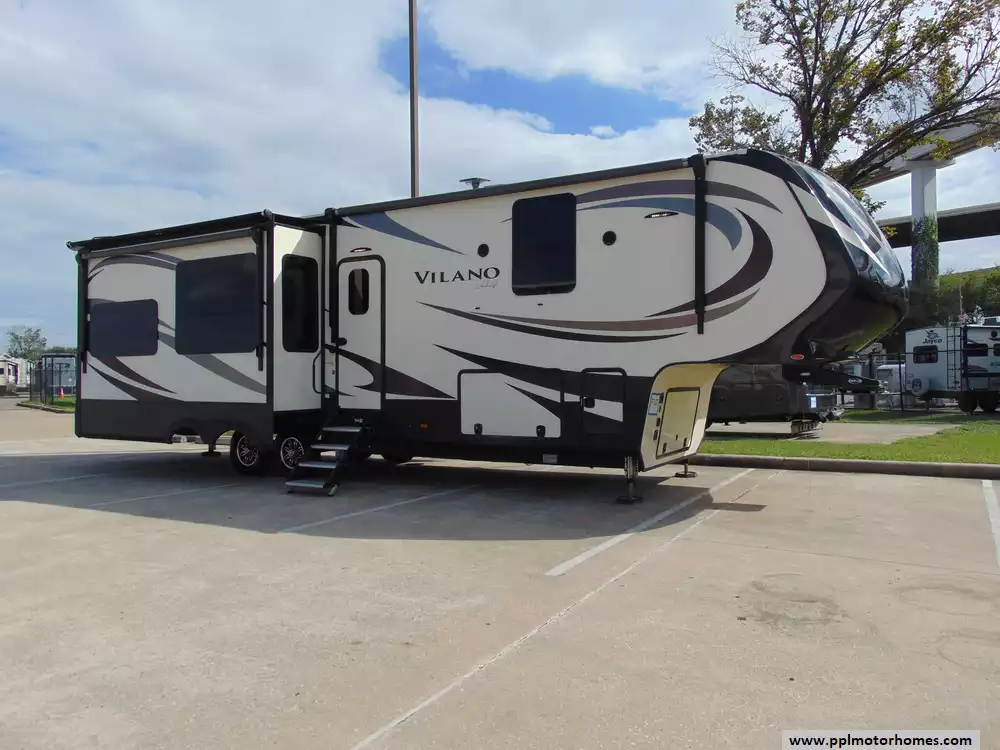 This 2016 Vilano 365RL is a luxurious fifth wheel,designed for full-time RVers or those looking for a high-end travel experience.Features Include...3 Slide-outs, 2 Ducted Air Conditioners, Microwave, 110v Residential Lg Refrigerator, In-Fridge Ice Maker, Automatic Main Awning And Window/Slide Awnings, Washer/Dryer,Solid Steps,Auto Leveling,Upgrade Suspension Cre 3000,Back Up and Side View Camera and Monitor,Lifetime RV Armour Roof, Dishwasher, Satellite Dish & Receiver, Outside Speakers, 2 TVs, Outside Shower,and 3 Burner Range.It offers a spacious layout and a host of premium amenities, making it a perfect choice for those who value comfort, style,and durability while on the road.