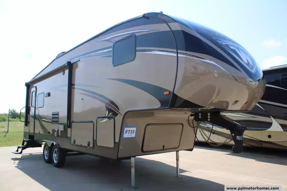 The 2016 Winnebago Voyage 27RLS is a well-balanced fifth-wheel offering comfortable accommodations for up to six travelers thanks to a single slide-out that expands the living space. Built with an aluminum body and fiberglass sidewalls, it comes with a 14 ft power awning, front and rear power leveling jacks, and features a 13,500 BTU A/C and a 30,000 BTU furnace for climate control. Equipped with a full bathroom (featuring a corner shower, sink, medicine cabinet, and toilet) and a front private bedroom complete with a queen bed, wardrobe, and overhead storage, it strikes a practical balance between privacy and communal space. With 50 gallons of freshwater capacity, 51 gallons of grey water, and 25 gallons of black water storage, along with propane tanks totaling 14.2 gal (approx. 60 lbs), it's designed for mid-length trips with dependable utility. This model artfully blends compact convenience with a thoughtfully laid-out interior, making it a solid choice for couples or small families seeking both comfort and efficiency on the road.