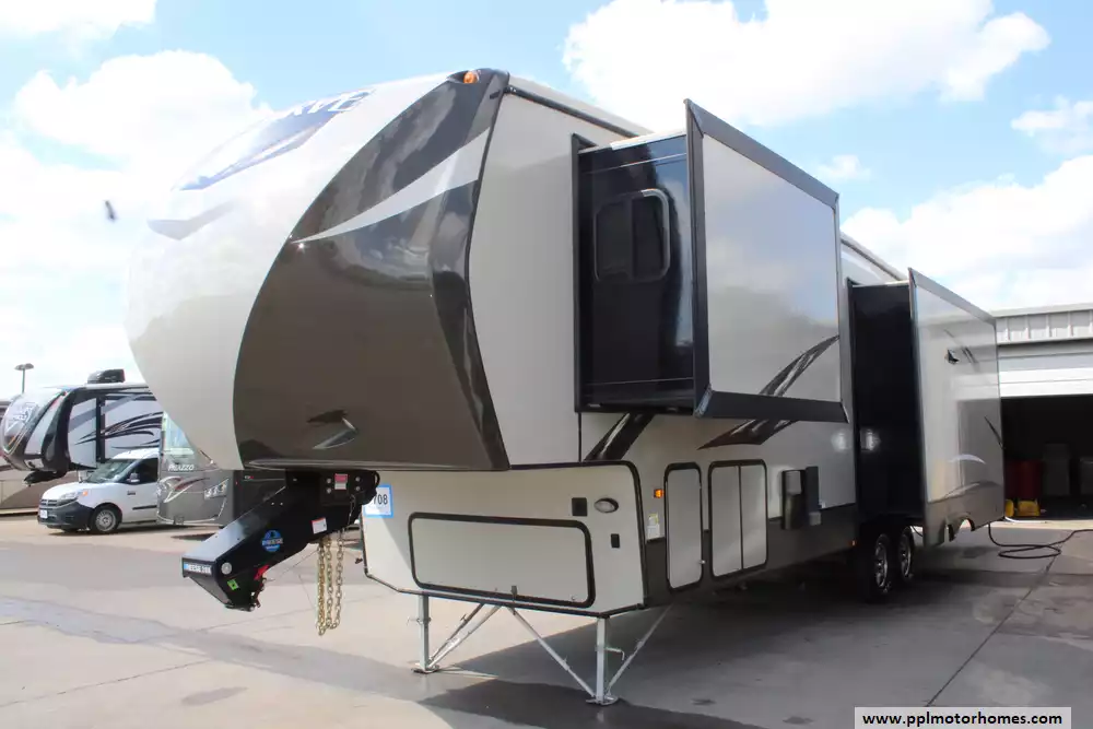 The 2017 CrossRoads ReZerve 32IK (RFZ32IK) is a triple-slide, rear-living fifth wheel designed to maximize comfort and usable space. Inside, you'll find opposing slides that open up the living area to host a sofa, theater seating, and a dinette across from an entertainment center and kitchen with an island and double sink. The full bath is conveniently placed midship, while the front master suite includes a queen bed slide-out, dresser, and a full-width wardrobe. Amenities are generous, this model was among those requiring the HP package, so it comes standard with luxury upgrades like a 48" LED TV, fireplace, ceiling fan, a residential-style refrigerator, inverter, and 50-amp service.