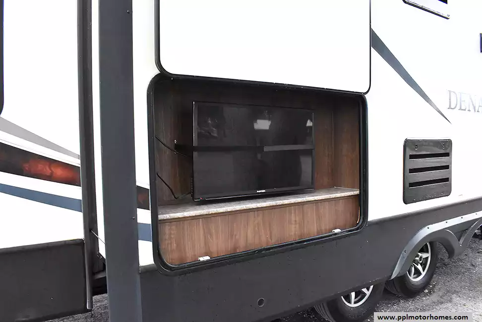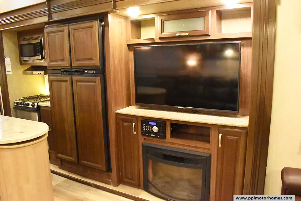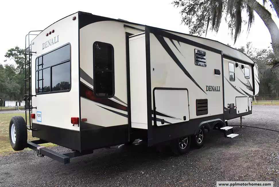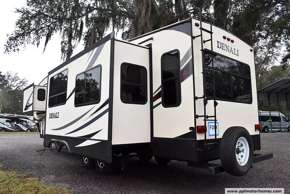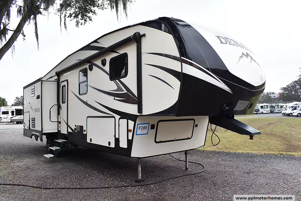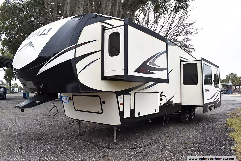 This 2017 Denali 335RLK has an Electric Landing Gear, 3 Slide-outs, 1 Ducted Air Conditioner, 4 Door Gas/110v Norcold Refrigerator, Automatic Main Awning, Washer/Dryer Connections, Outside Speakers, 2 TVs, Outside Shower, Fireplace, Central Vacuum, Microwave, 3 Burner Range