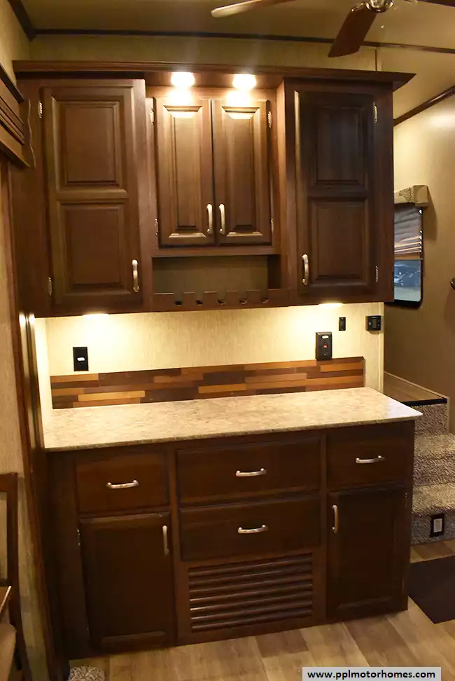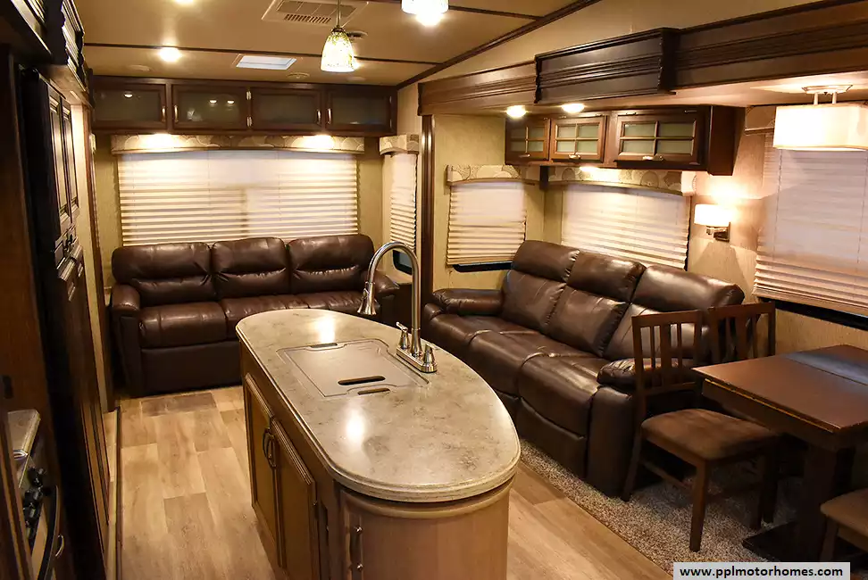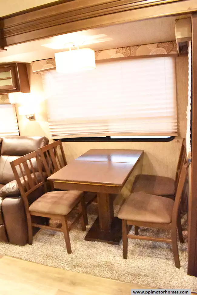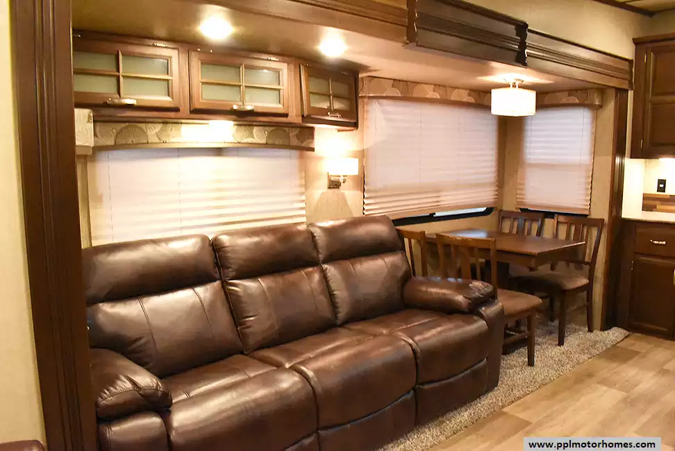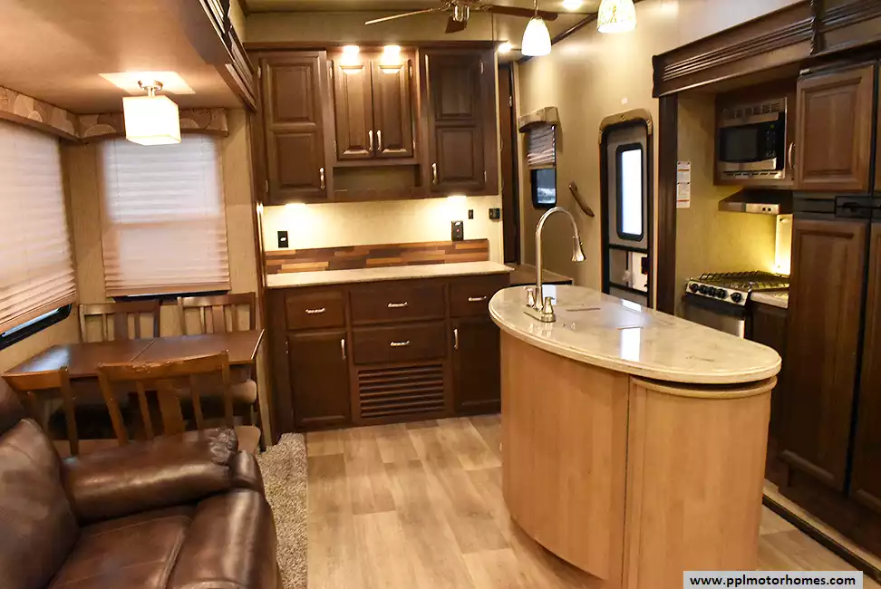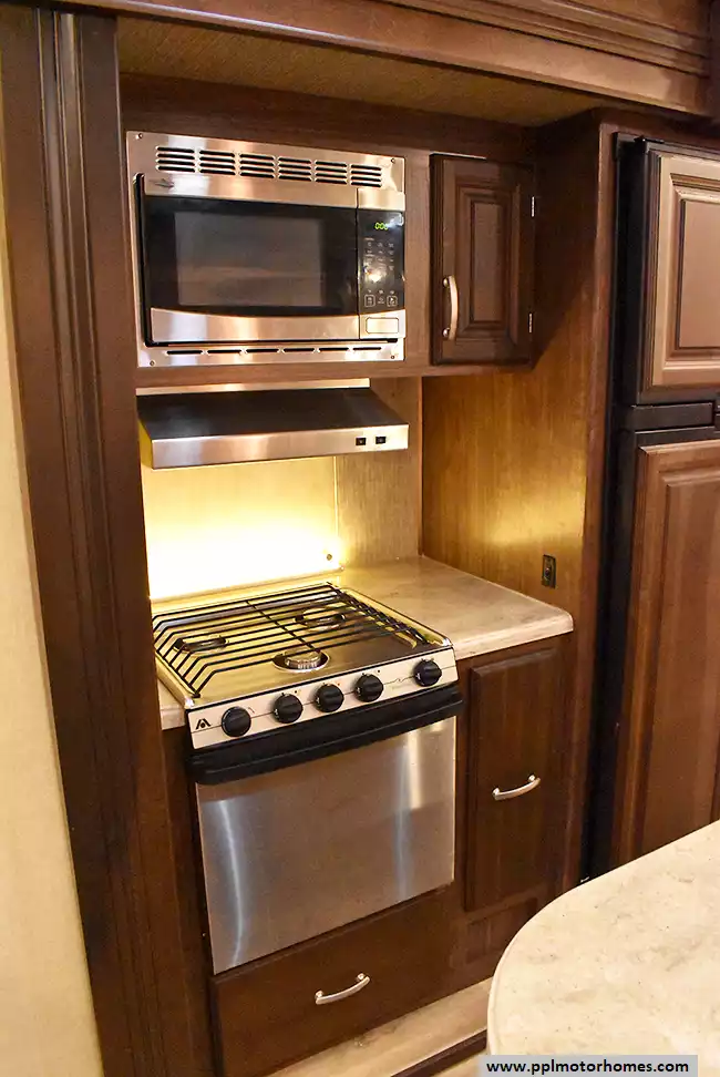 This 2017 Denali 335RLK has an Electric Landing Gear, 3 Slide-outs, 1 Ducted Air Conditioner, 4 Door Gas/110v Norcold Refrigerator, Automatic Main Awning, Washer/Dryer Connections, Outside Speakers, 2 TVs, Outside Shower, Fireplace, Central Vacuum, Microwave, 3 Burner Range