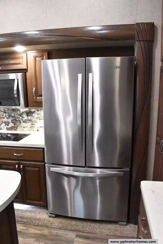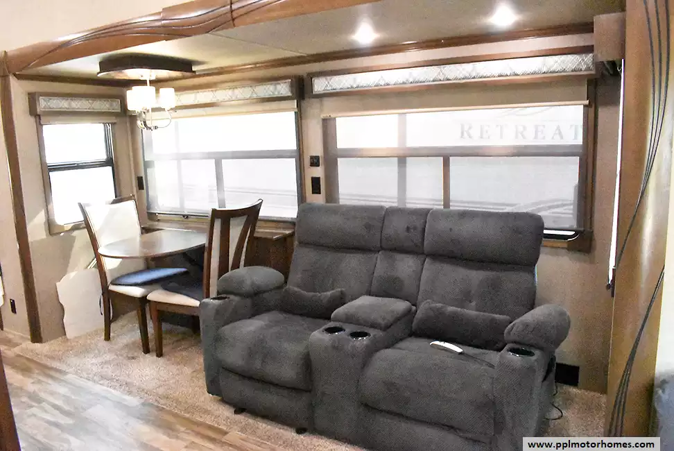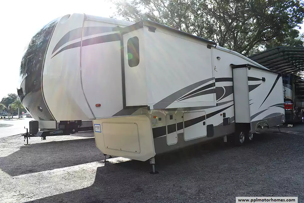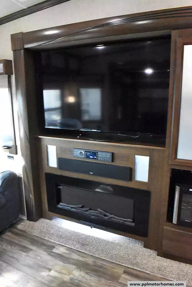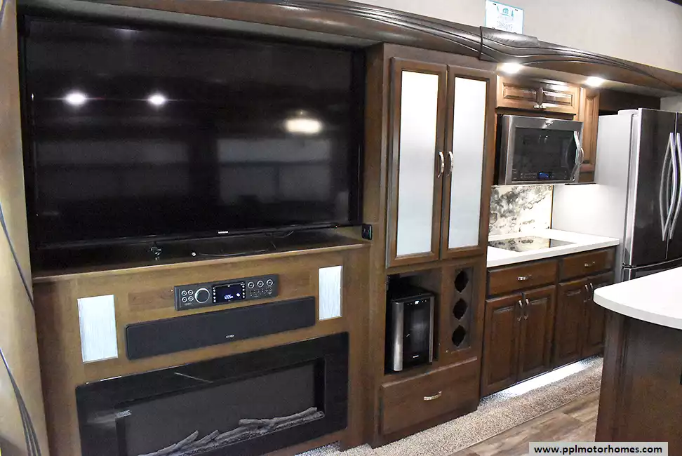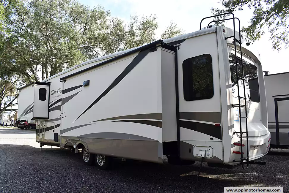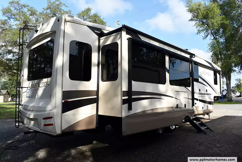 This 2017 Ceder Creek Champagne 38EL has a Hydraulic Landing Gear, 2 Slide-outs, Onan Propane Generator, 3 Ducted Air Conditioners, 110v Residential Whirlpool Refrigerator, Automatic Main Awning And Slide Awning, Washer/Dryer, Dishwasher, Heated Tanks, Outside Entertainment System, 3 TVs, Outside Shower, Fireplace, Central Vacuum, Convection Microwave, 3 Burner Range, Oven