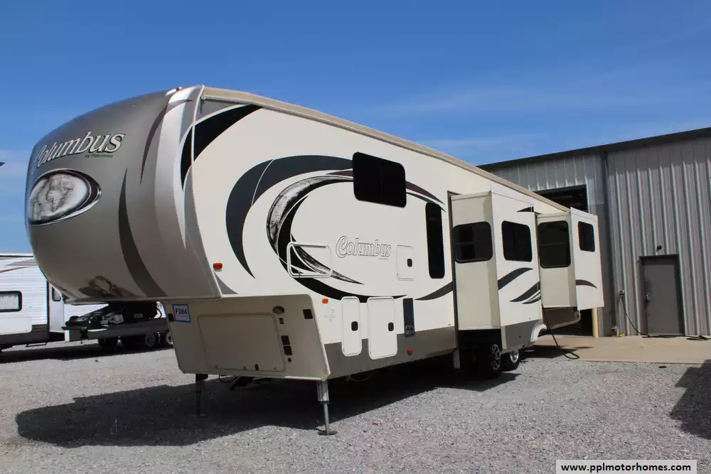 This 2017 Palomino Columbus 386FK has a Hydraulic Landing Gear, 3 Slide-outs, 2 Ducted Air Conditioners, Side by Side 12v Residential Lg Refrigerator, In-Fridge Ice Maker, Automatic Main Awning, Washer/Dryer Connections, Heated Tanks, Satellite Dish, Outside Speakers, 2 TVs, Outside Shower, Fireplace, Convection Microwave, 3 Burner Range, Oven