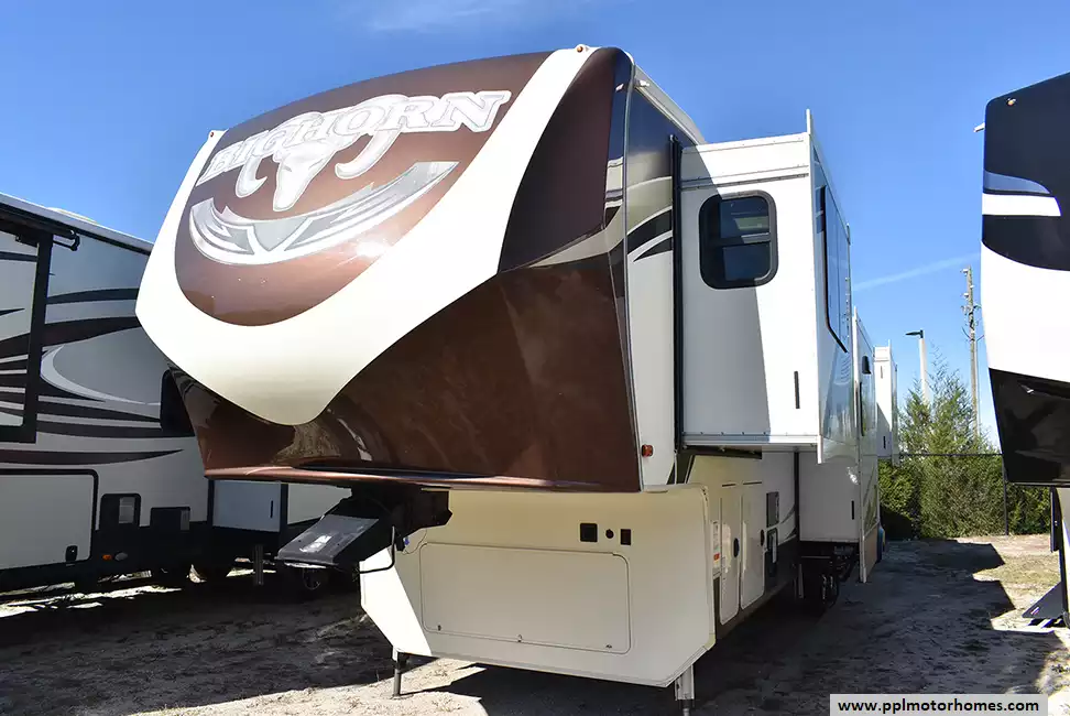 This 2017 Bighorn 3750FL has a Hydraulic Landing Gear, 5 Slide-outs, 2 Ducted Air Conditioners, Double Door Residential Refrigerator, In-Fridge Ice Maker, Automatic Main Awning, Washer/Dryer Connections, Outside Speakers, Outside Shower, Fireplace, Convection Microwave, 3 Burner Range, Oven