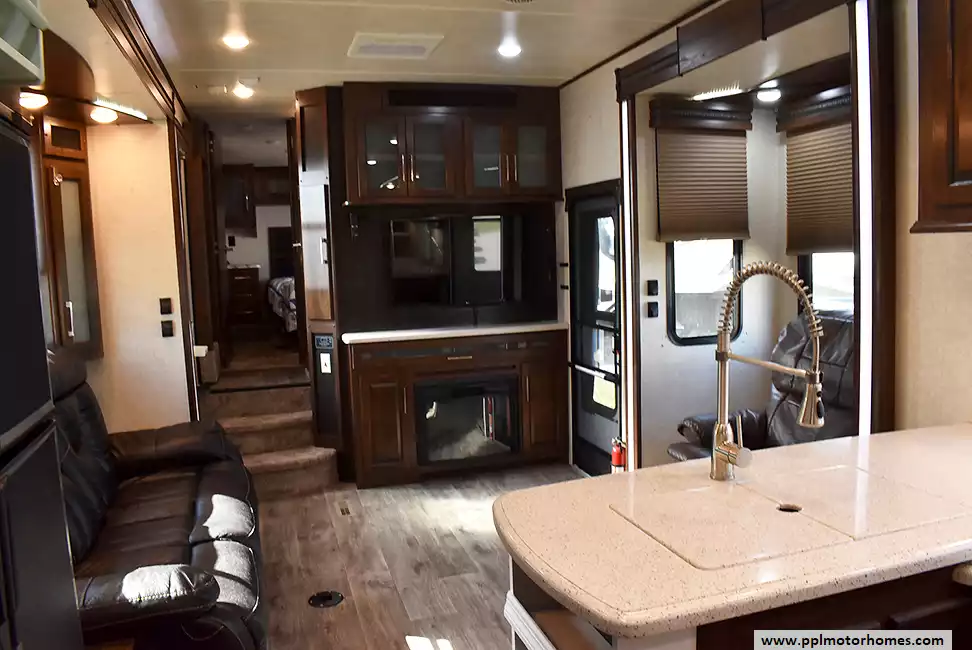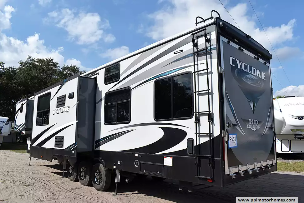 This 2017 Cyclone 4005 has a Hydraulic Landing Gear, 3 Slide-outs, Onan Gas Generator, 3 Ducted Air Conditioners, 4 Door Gas/12v Dometic Refrigerator (Additional Refrigerator Present), Automatic Main Awning, Washer/Dryer Connections, Outside Entertainment System, 4 TVs, Outside Shower, Fireplace, Central Vacuum, Microwave, 3 Burner Range, Oven