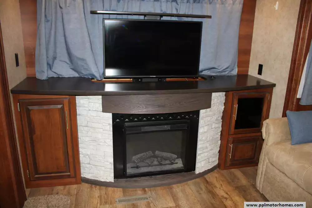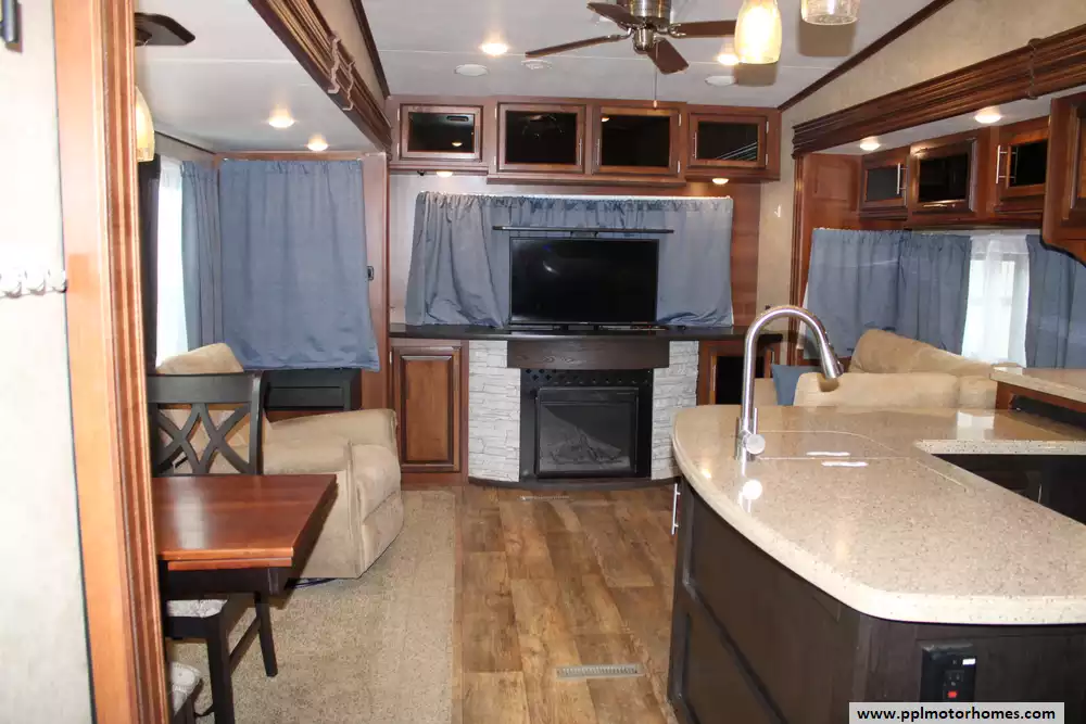 The 2017 Jayco Eagle 327CKTS is a luxurious fifth-wheel designed to sleep up to four, featuring three slide-outs that create an expansive, open living area and well-appointed kitchen. Built on Jayco's TuffShell structure with Climate-Shield insulation and Magnum Truss roofing, it offers four-season durability. The rear living space includes an L-shaped sofa, recliners, theater-style entertainment center with pop-up 48" HDTV and LED fireplace, plus a free-standing dinette. In the front is a private bedroom with a queen bed, roomy walk-in closet, and washer/dryer prep. The fully equipped kitchen boasts a three-burner range, microwave, pantry, Corian solid-surface counters, and stainless-steel sink, complemented by dual USB ports and a 15 k BTU A/C (and has 2nd A/C). A central bathroom features a shower with seat, linen storage, and porcelain toilet. Standard exterior comforts include a 19' electric awning, pass-through storage, marine-grade speakers, tinted frameless windows, rear power jacks, and solar prep. The 327CKTS strikes a strong balance of comfort, functionality, and true home-on-wheels luxury!