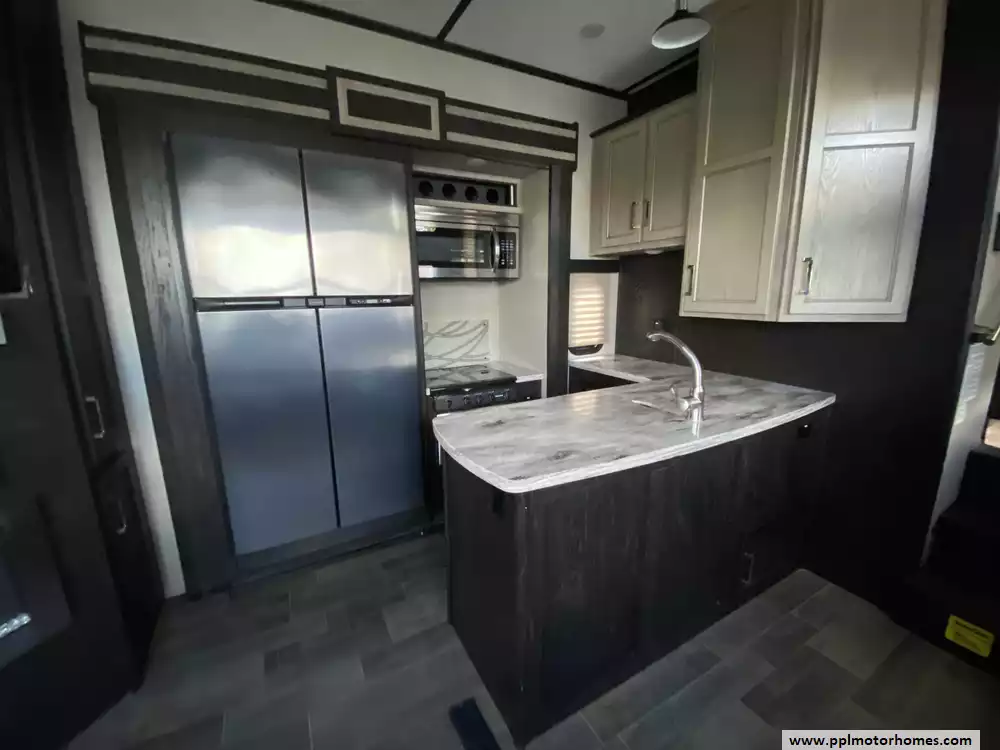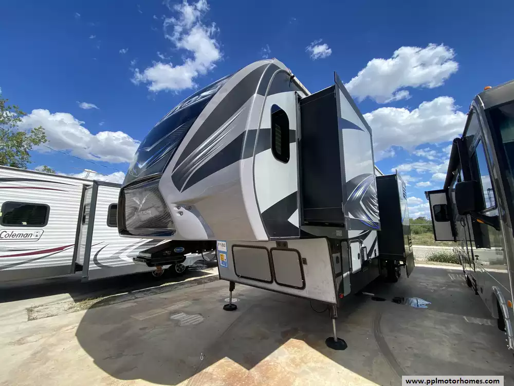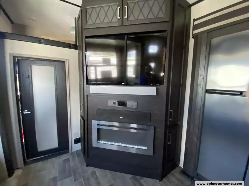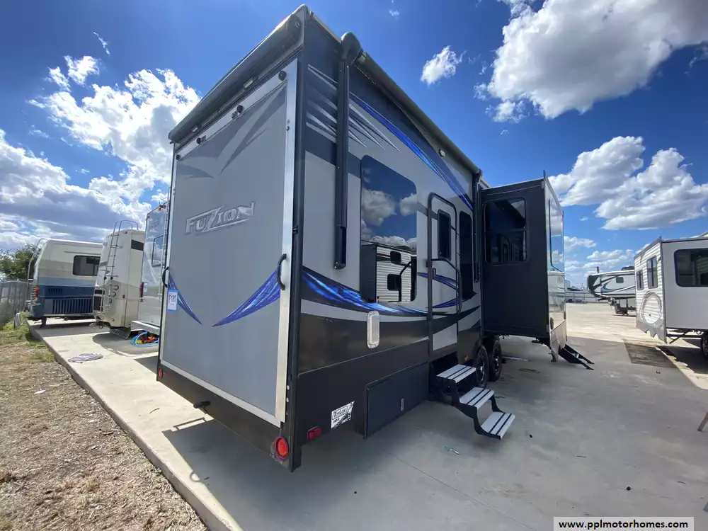 This 2017 Fuzion 371 has a Hydraulic Landing Gear, 3 Slide-outs, Onan Gas Generator, 3 Ducted Air Conditioners, 4 Door Gas/110v Norcold Refrigerator, Automatic Main Awning And Window/Door Awnings, Washer/Dryer Connections, Heated Tanks, Outside Speakers, 3 TVs, DVD Player, Outside Shower, Fireplace, Central Vacuum, Microwave, 3 Burner Range, Oven