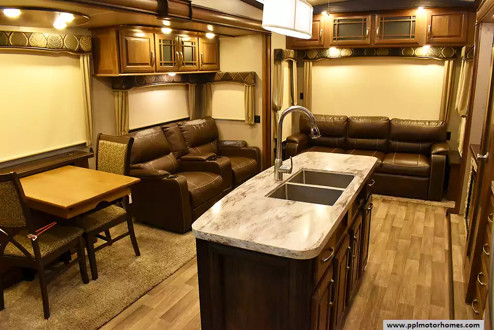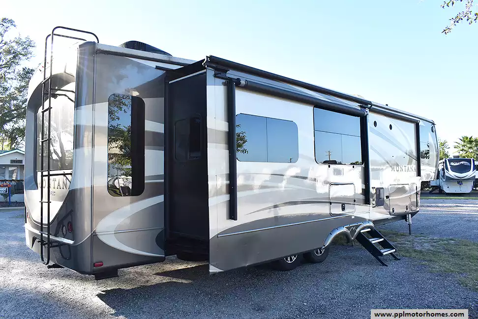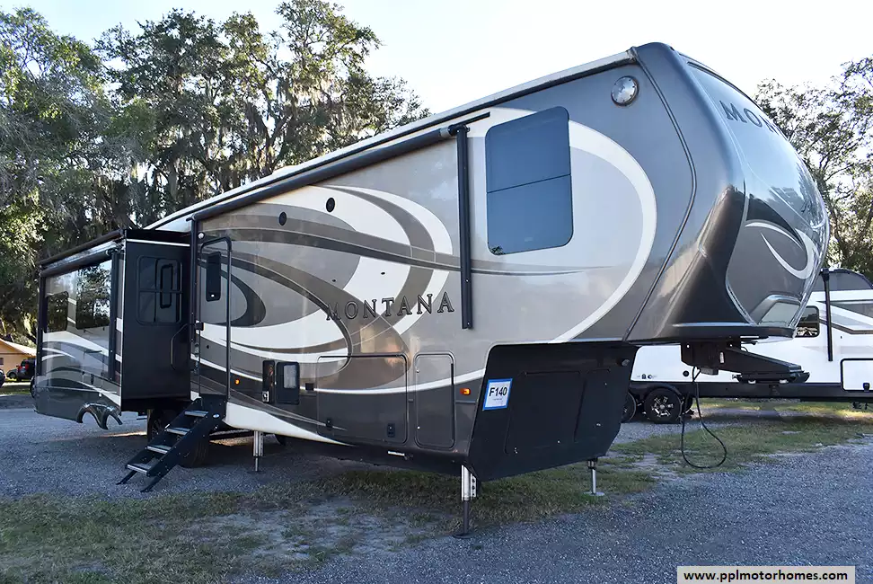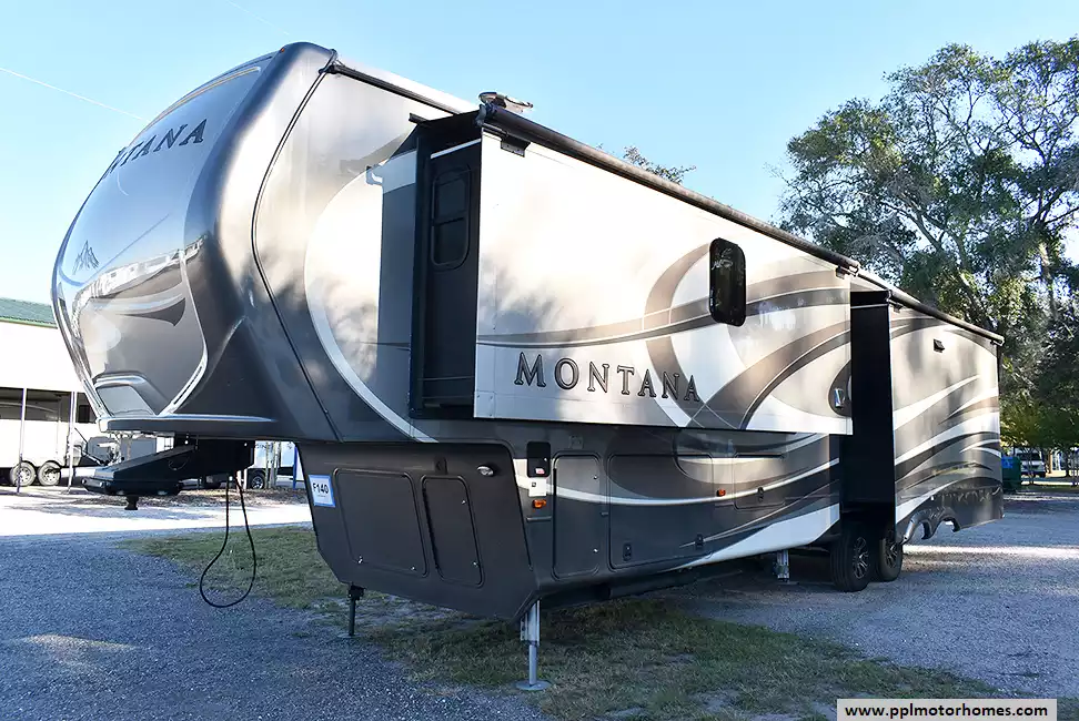 This 2017 Montana by Keystone 3721RL has a Hydraulic Landing Gear, 3 Slide-outs, 2 Ducted Air Conditioners, Residential Samsung Refrigerator, In-Fridge Ice Maker, Automatic Main Awning, Washer/Dryer Connections, Satellite Receiver, Outside Entertainment System, 2 TVs, Outside Shower, Fireplace, Microwave, 3 Burner Range, Oven