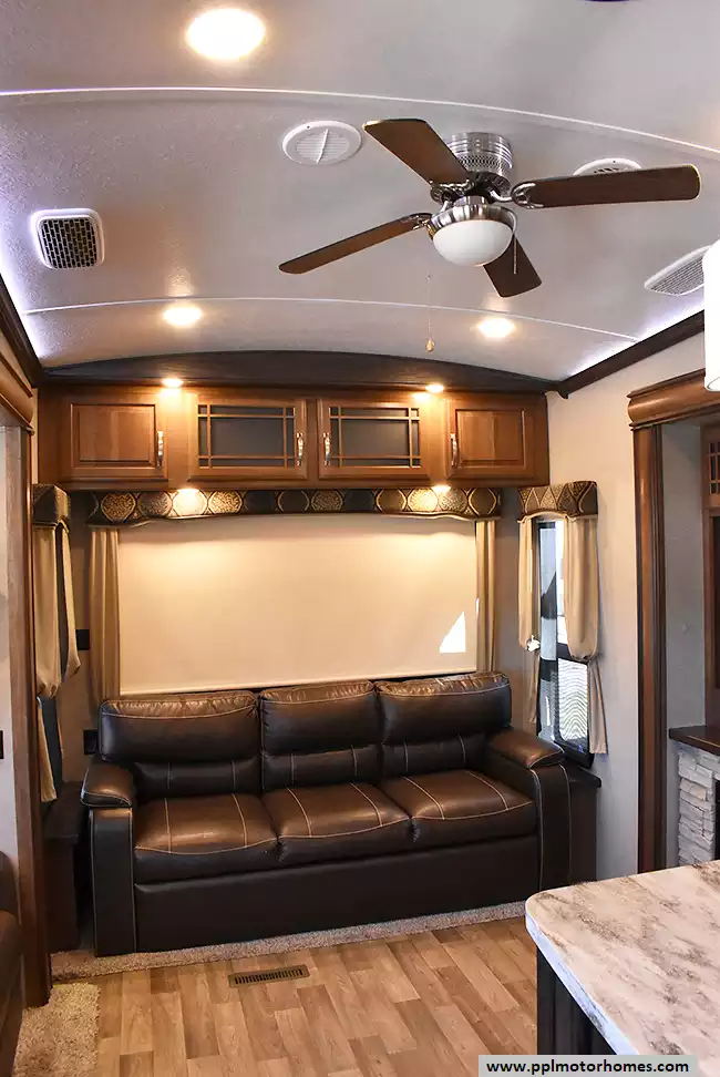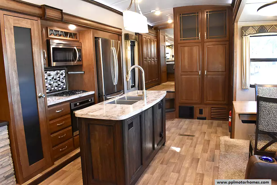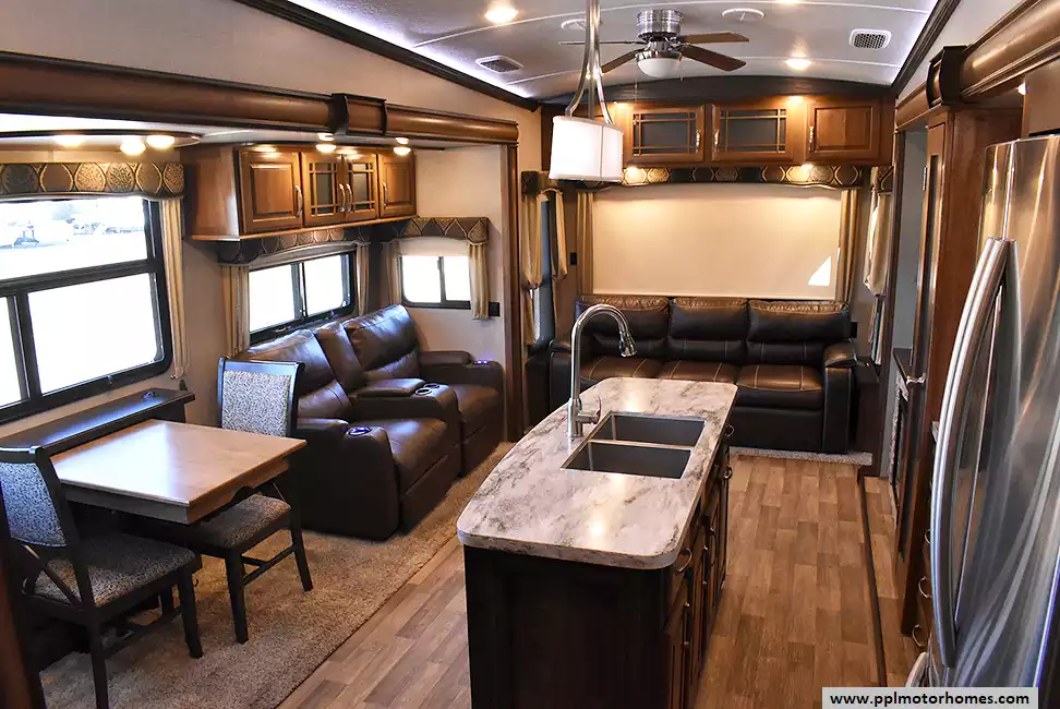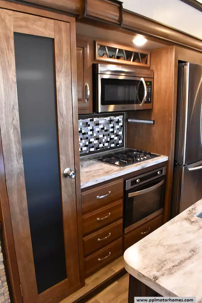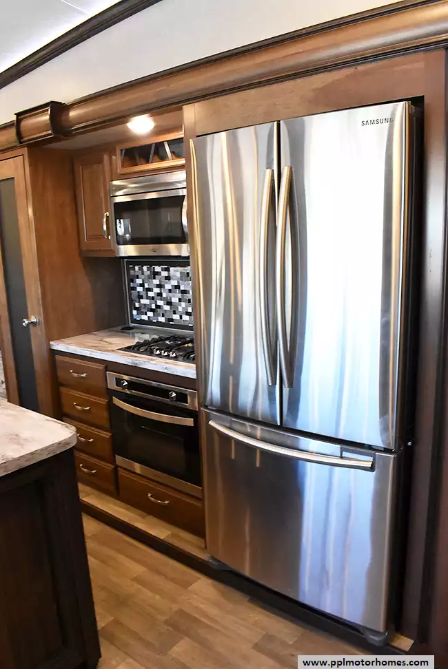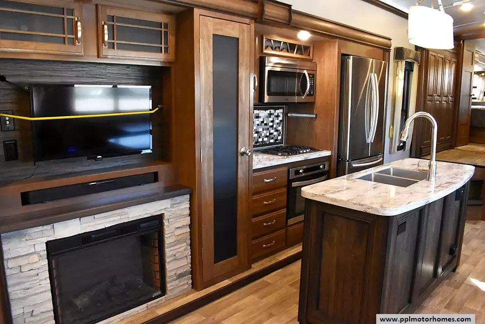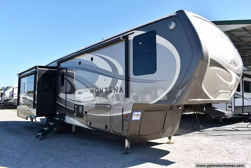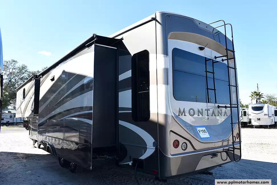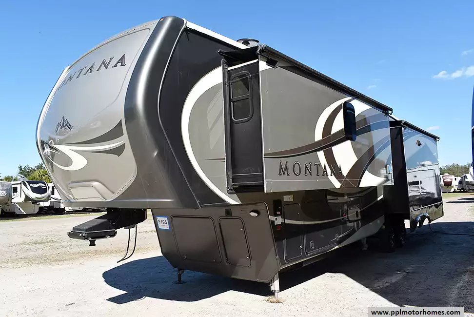 This 2017 Montana by Keystone 3721RL has a Hydraulic Landing Gear, 3 Slide-outs, 2 Ducted Air Conditioners, Residential Samsung Refrigerator, In-Fridge Ice Maker, Automatic Main Awning, Washer/Dryer Connections, Satellite Receiver, Outside Entertainment System, 2 TVs, Outside Shower, Fireplace, Microwave, 3 Burner Range, Oven