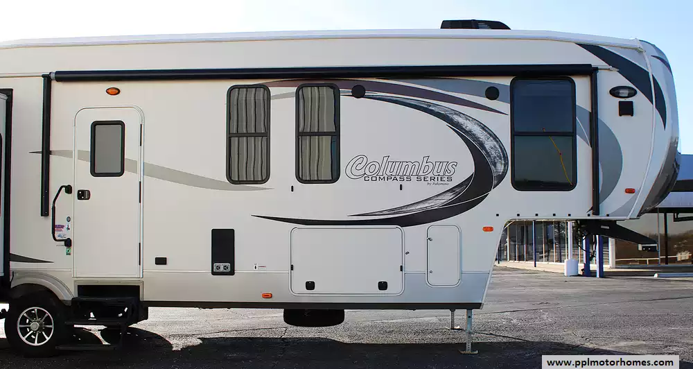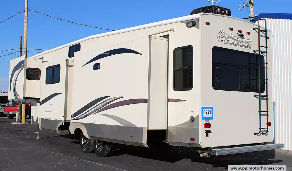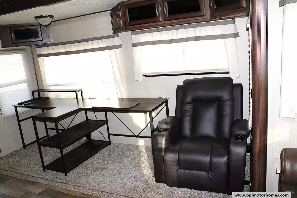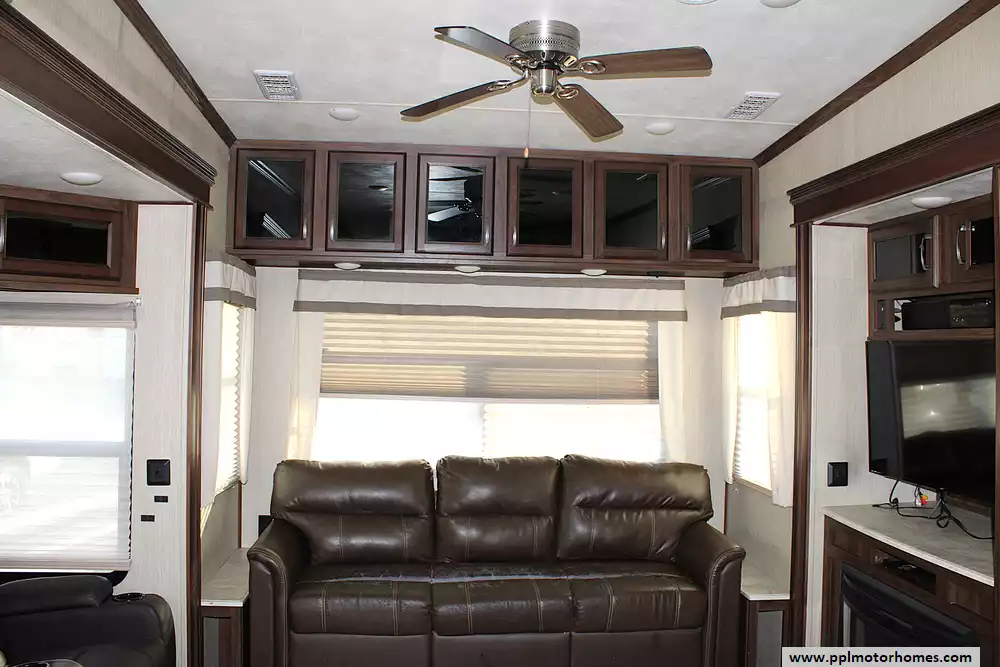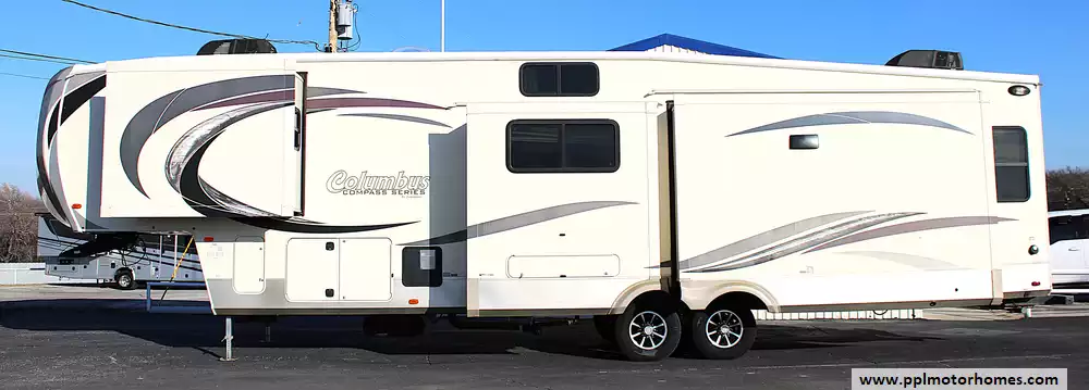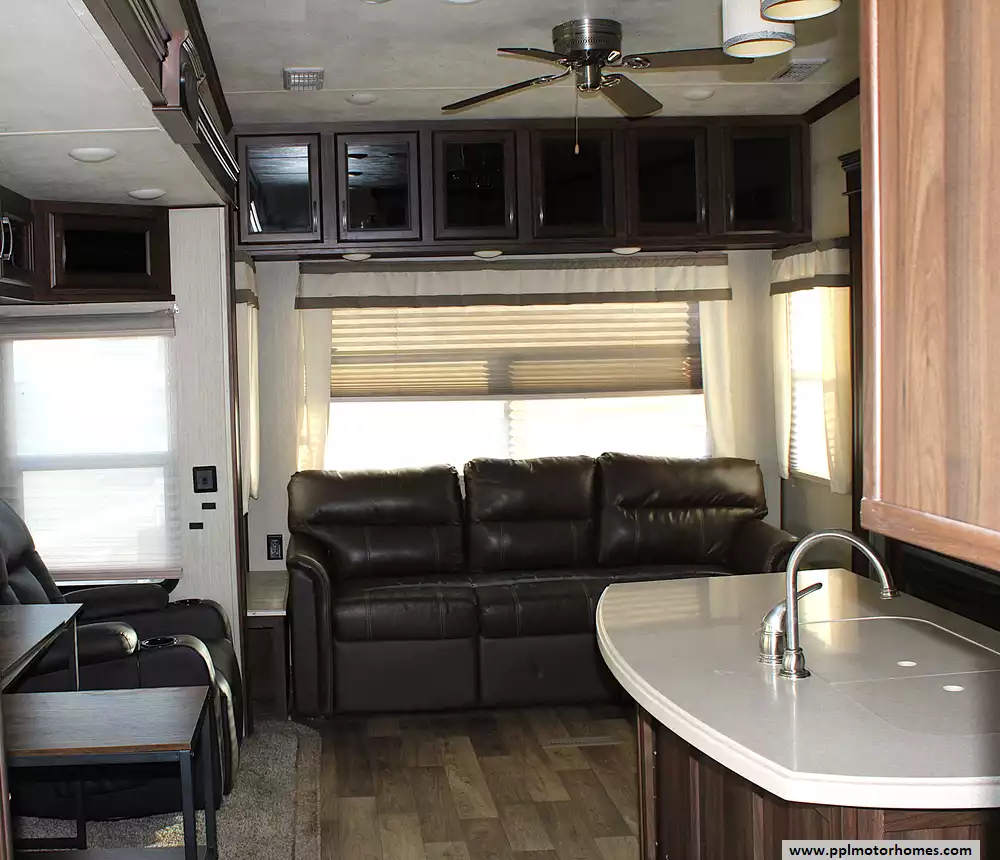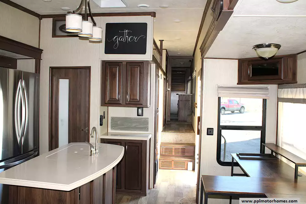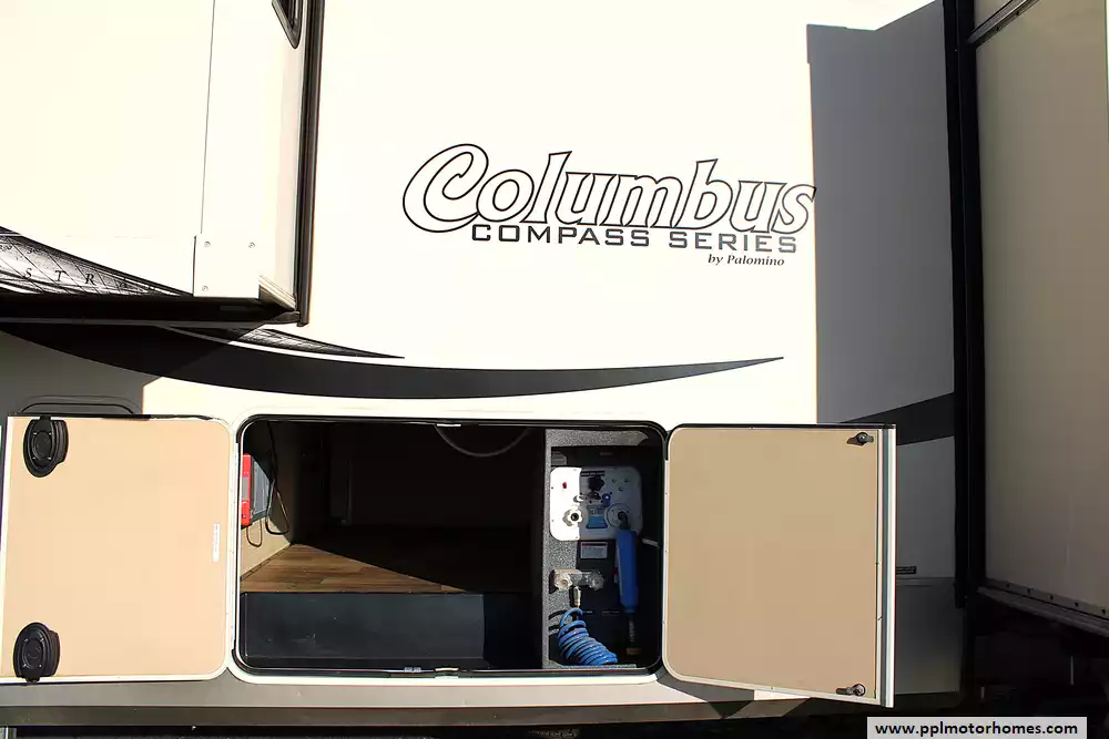 2017 Palomino Columbus 377MBC - a spacious, residential-style fifth wheel designed for families or extended stays. This sought-after mid-bunk floorplan includes a private bunkroom/office, making it ideal for traveling families or remote work. With sleeping accommodations in the front master bedroom, rear living area, and double bunks, this unit can comfortably sleep up to seven people. As a large luxury fifth wheel, it is intended to be towed by a heavy-duty one-ton dually pickup.