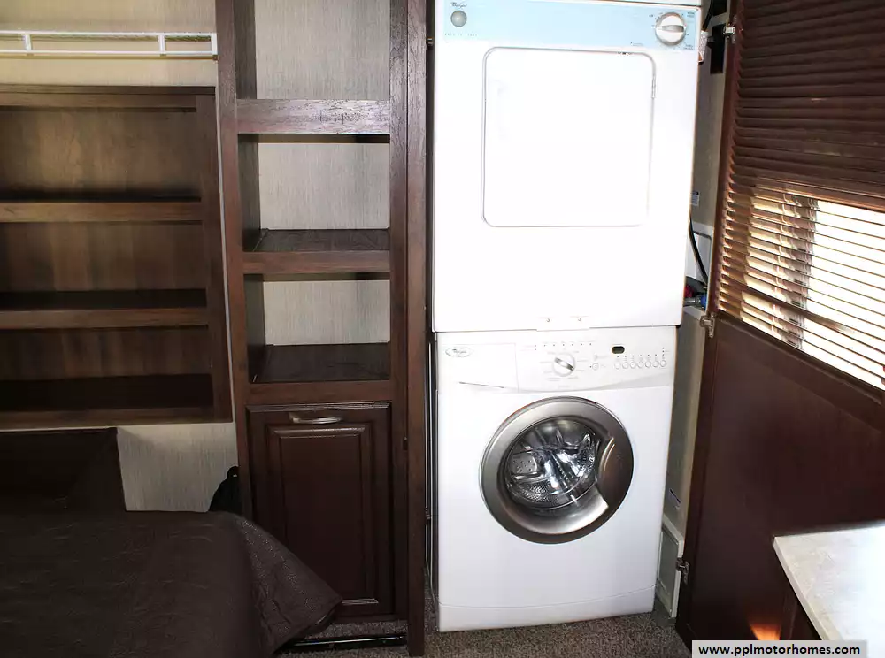 The interior offers a generous living area with multiple slide-outs, excellent storage, and a true residential feel throughout. The kitchen and living room provide ample space for entertaining, while the mid-bunk room adds versatility for kids, guests, or work-from-home needs. This unit is also equipped with a stackable washer and dryer, a valuable feature for full-time living or extended trips. In addition, the unit has a new roof, providing added peace of mind and long-term value.