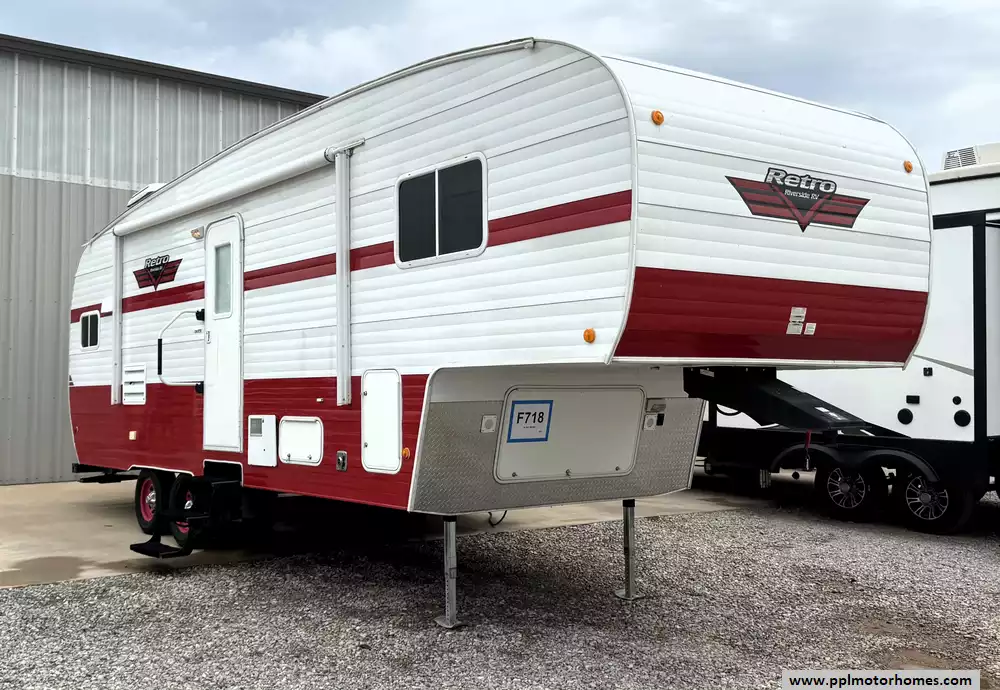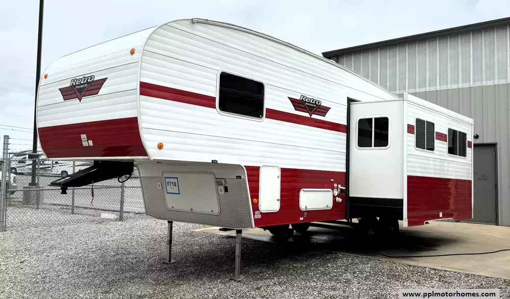 This 2017 Retro 526RK has an Electric Landing Gear, 1 Slide-out, 1 Ducted Air Conditioner, Double Door Gas/110v Dometic Refrigerator, Automatic Main Awning, TV, Microwave, 3 Burner Range, Oven