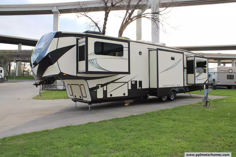 This 2017 Destination 37RD is a luxurious fifth-wheel RV designed to provide a spacious and comfortable living experience for travelers seeking high-end amenities on the road.Features Include...5 Slide-outs, 1 Non-Ducted And 1 Ducted Air Conditioner, Residential Lg Refrigerator, In-Fridge Ice Maker, Automatic Main Awning And Window Awning, Washer/Dryer Connections, Outside Entertainment System,2 TVs, DVD Player,Large Pantry,Shower with Bench, Outside Shower,Fireplace, Microwave,3 Burner Range,and Oven.It combines luxury,functionality,and ample space,making it an excellent choice for those seeking a premium fifth-wheel RV experience.
