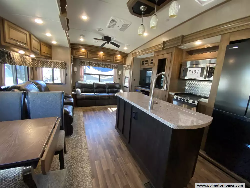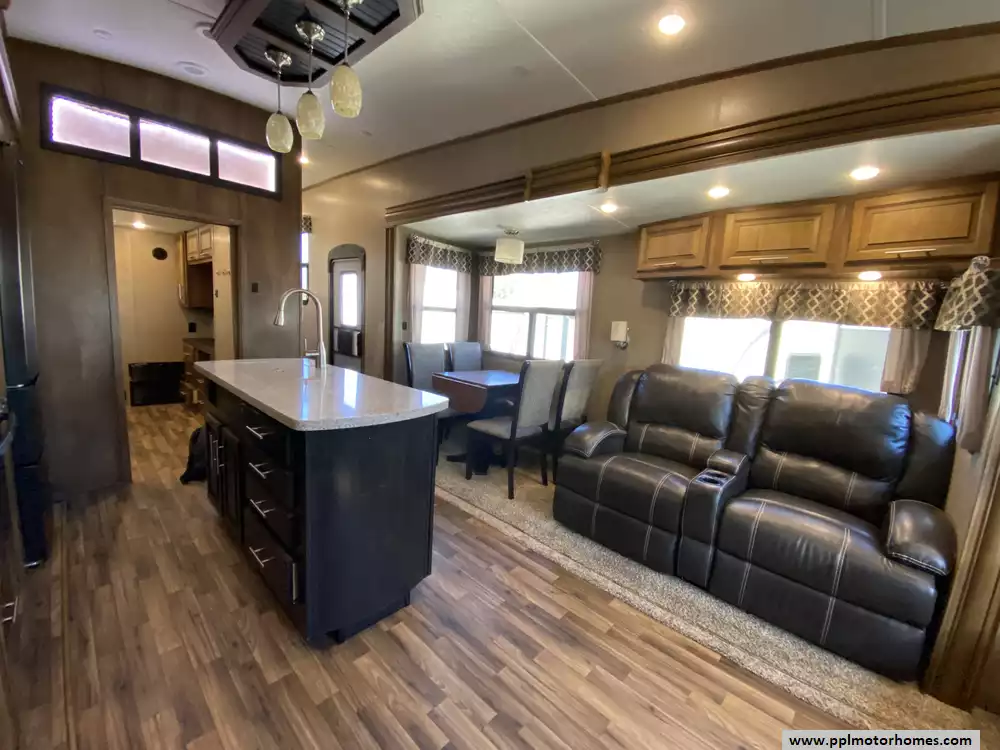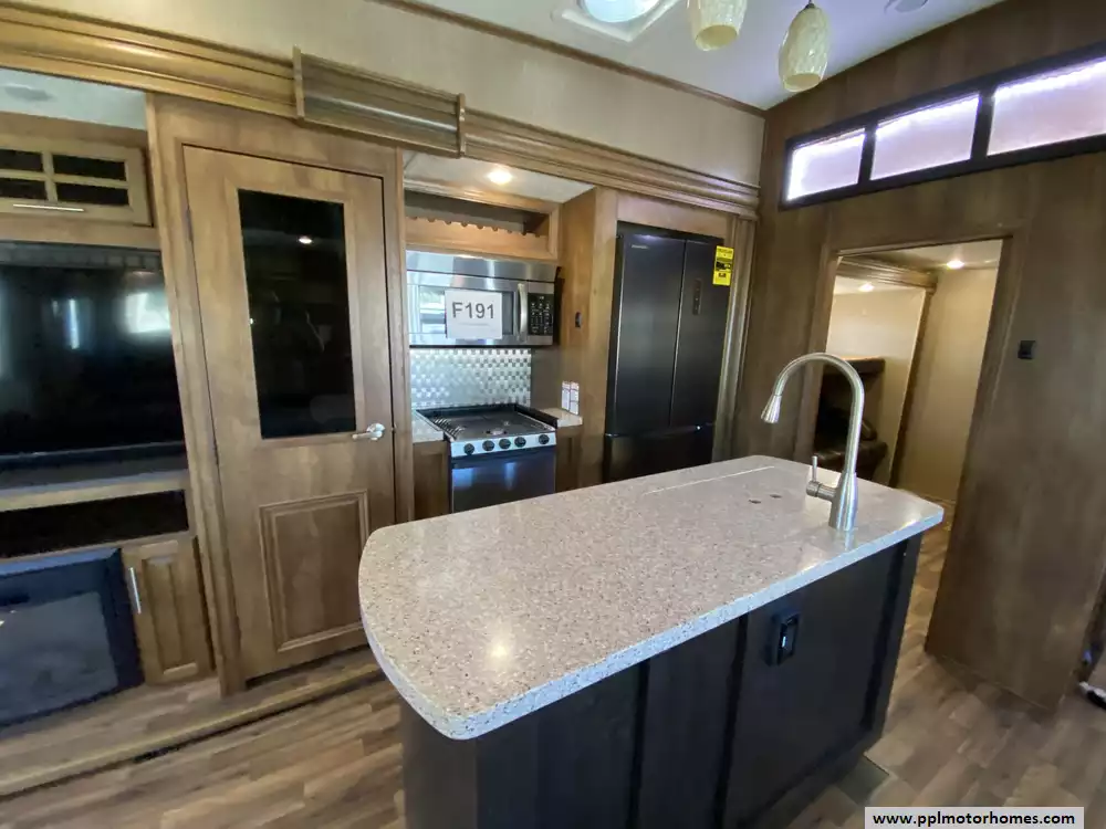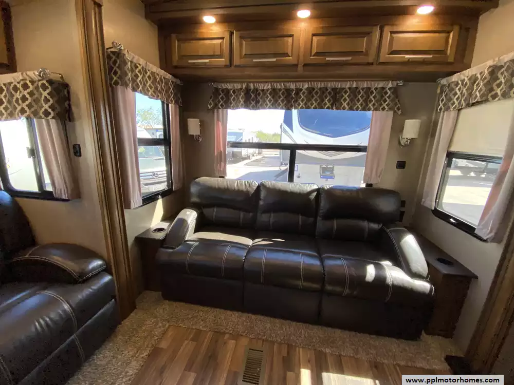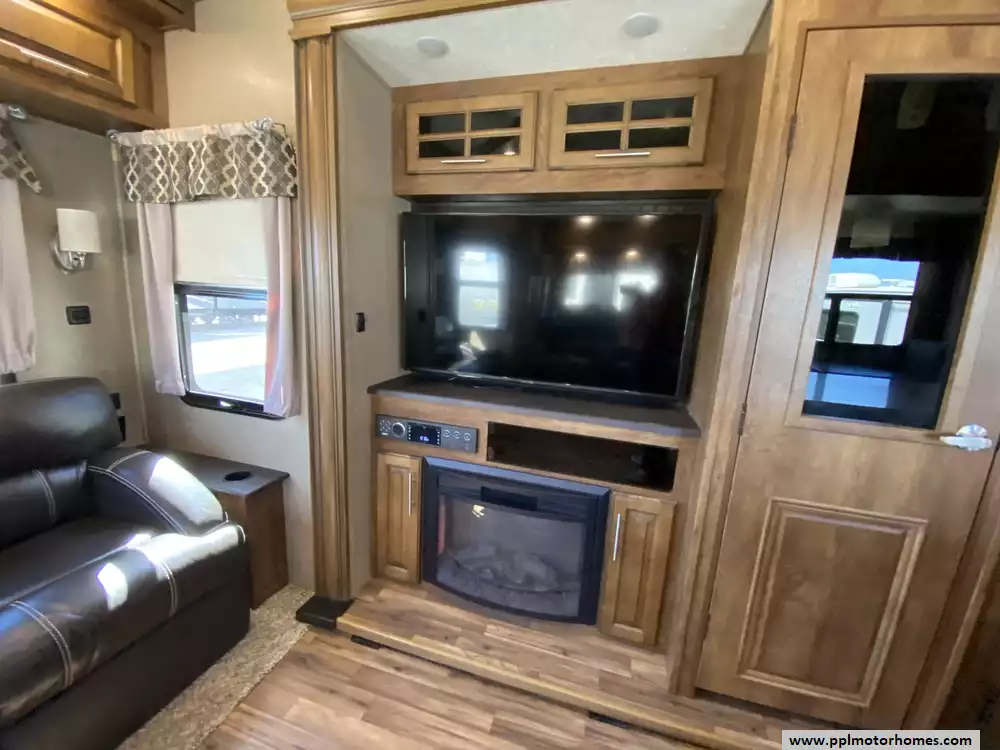 This 2018 Brookstone 395RL has an Electric Landing Gear, 4 Slide-outs, 2 Ducted Air Conditioners, Double Door 12v Everchill Refrigerator (Additional Refrigerator Present), Automatic Main Awning, Washer/Dryer Connections, Outside Speakers, 3 TVs, 2 DVD Players, Fireplace, Convection Microwave, 3 Burner Range, Oven