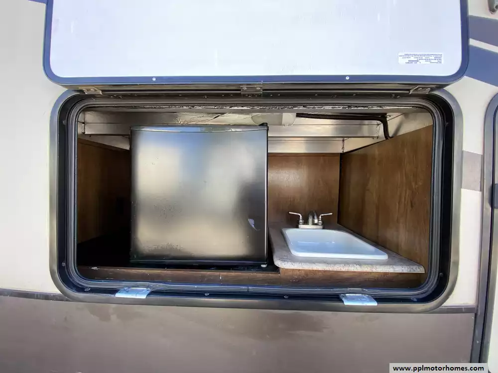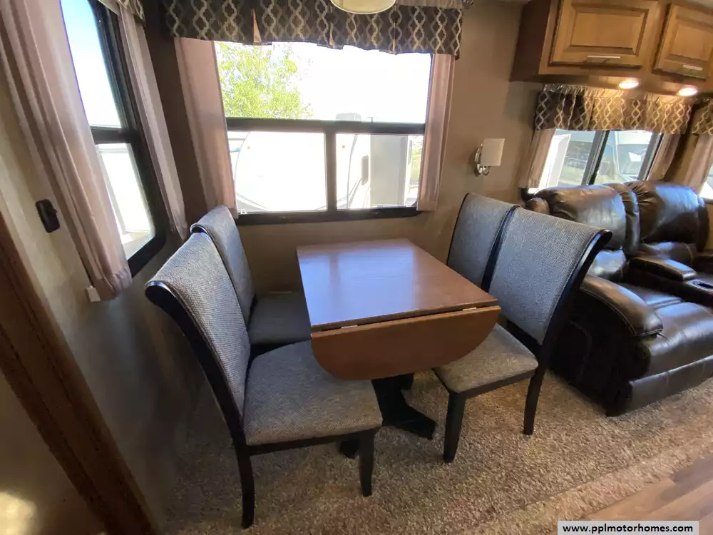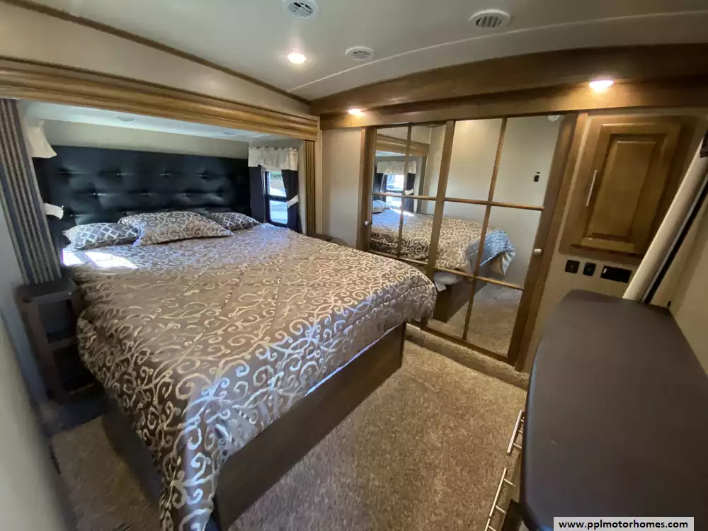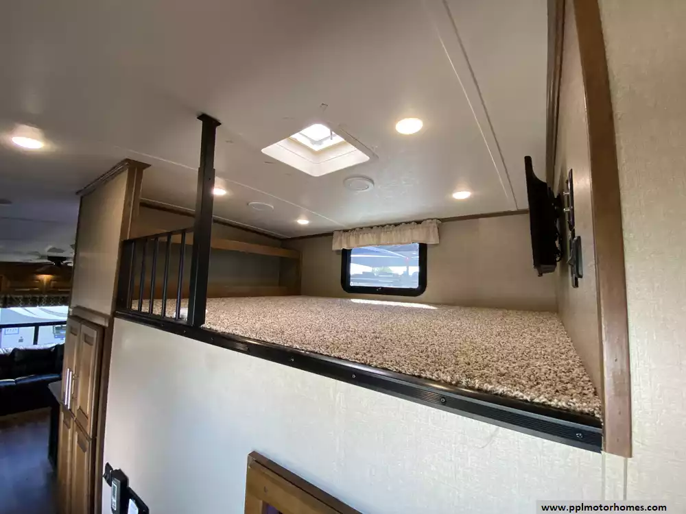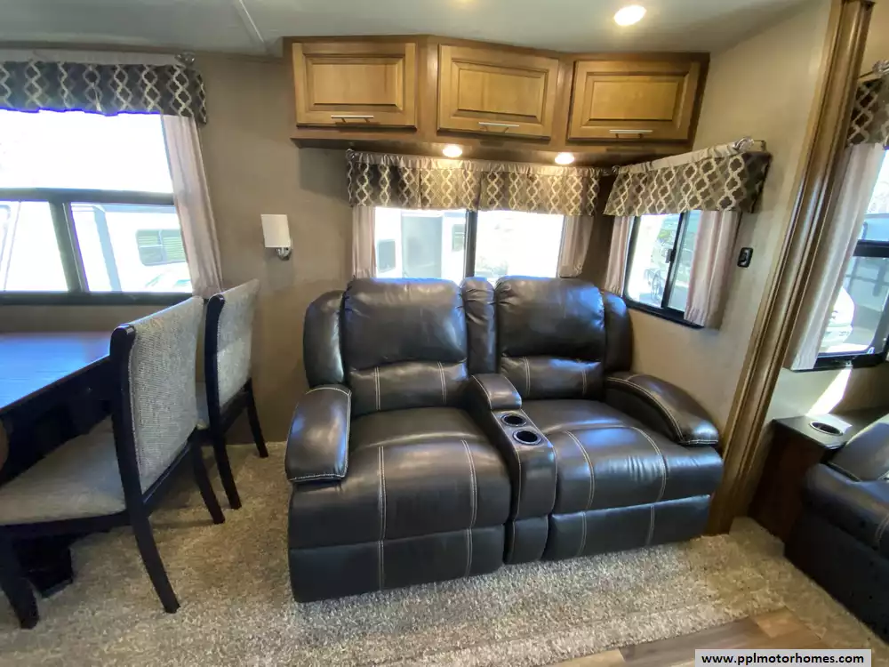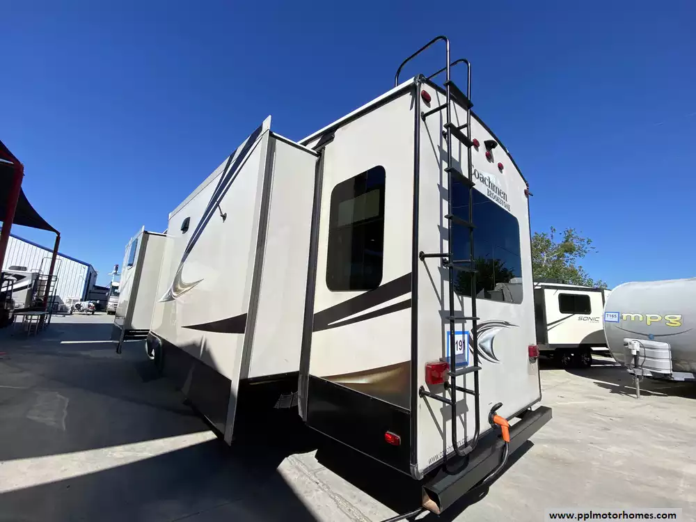 This 2018 Brookstone 395RL has an Electric Landing Gear, 4 Slide-outs, 2 Ducted Air Conditioners, Double Door 12v Everchill Refrigerator (Additional Refrigerator Present), Automatic Main Awning, Washer/Dryer Connections, Outside Speakers, 3 TVs, 2 DVD Players, Fireplace, Convection Microwave, 3 Burner Range, Oven