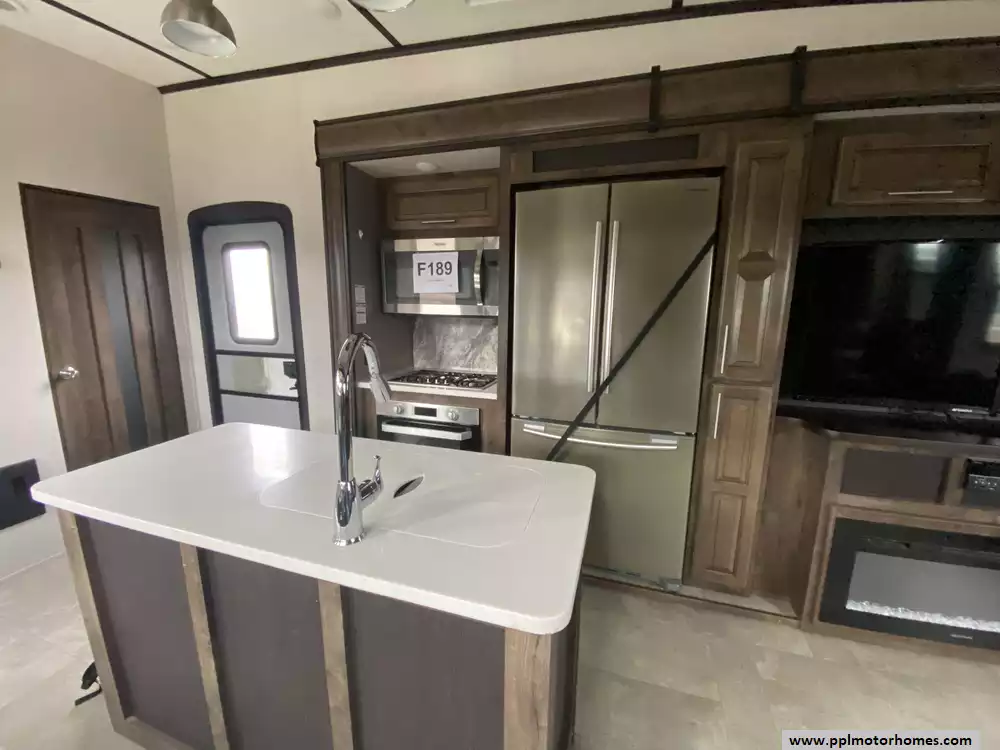 This 2018 Crossroads Cameo 3631RL has an Electric Landing Gear, 4 Slide-outs, 2 Ducted Air Conditioners, Double Door Residential Samsung Refrigerator (Additional Refrigerator Present), In-Fridge Ice Maker, Two Automatic Main Awning, Washer/Dryer Connections, Outside Speakers, 2 TVs, DVD Player, Outdoor Kitchen, Outside Shower, Fireplace in Livingroom and Fireplace in Master Bedroom , Microwave, 3 Burner Range, Oven