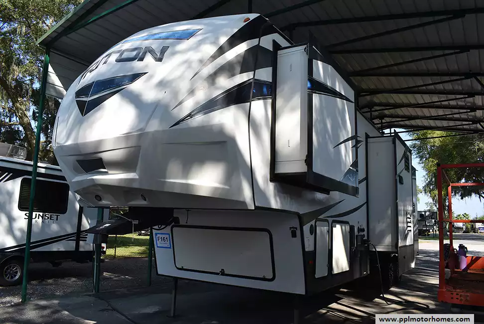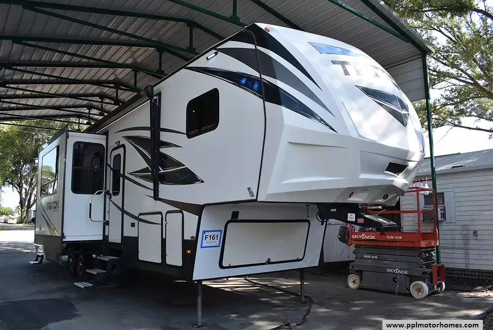This 2018 Voltage Triton 3551 has a Hydraulic Landing Gear, 3 Slide-outs, Onan Propane Generator, 2 Ducted Air Conditioners, Double Door Gas/12v Norcold Refrigerator, Automatic Main Awning, Outside Speakers, 3 TVs, DVD Player, Outside Shower, Fireplace, Microwave, 3 Burner Range, Oven