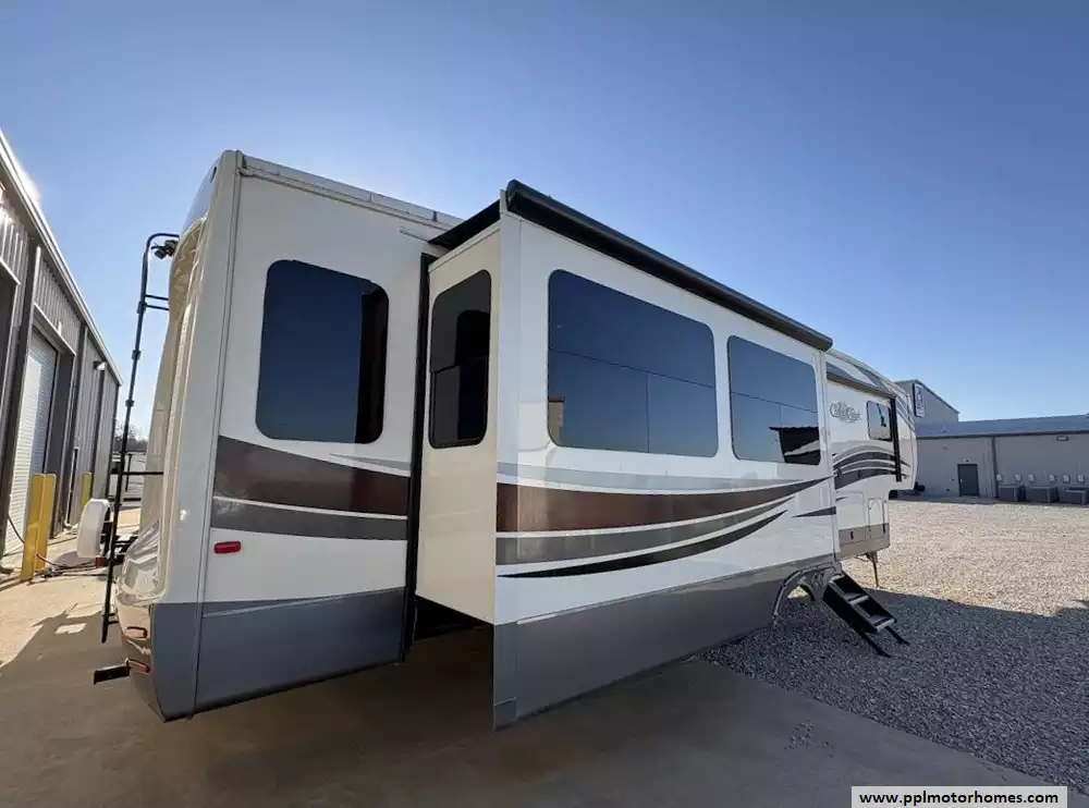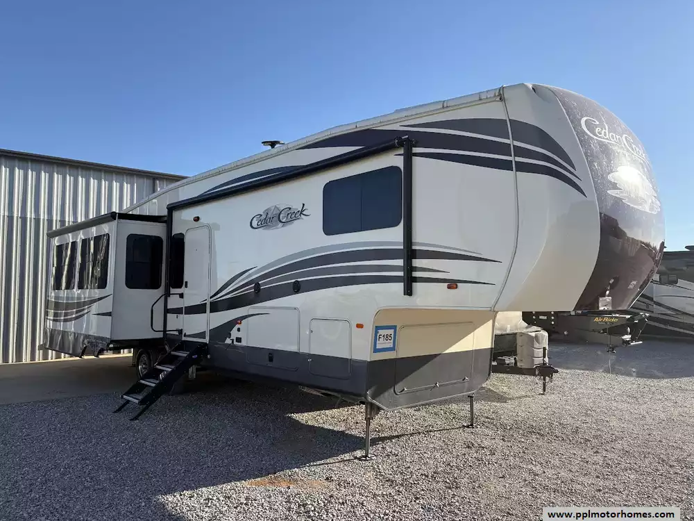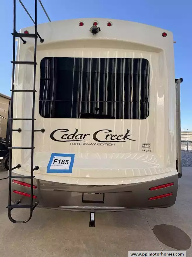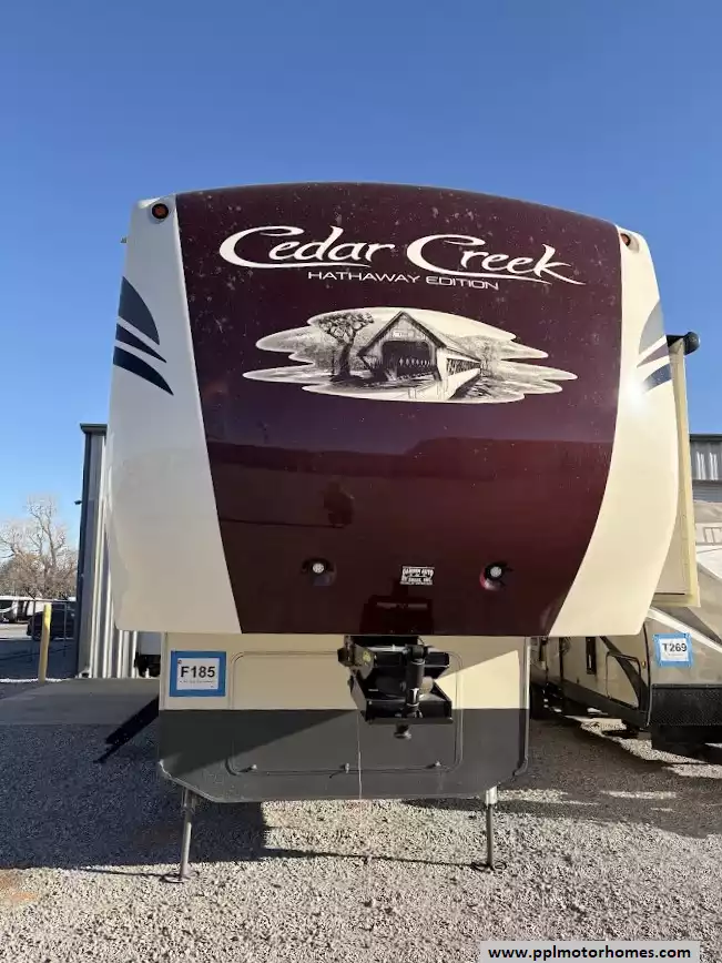 Experience the pinnacle of luxury travel in this 2018 Cedar Creek Hathaway 36CK2, a model renowned for its residential-style comfort and superior construction. Built with a signature all-aluminum superstructure and a premium high-gloss fiberglass exterior, this 41-foot fifth wheel is designed to withstand the road while providing the insulation needed for extended-season adventures. The exterior is engineered for effortless setup and enjoyment, featuring a heavy-duty hydraulic landing gear system, three spacious slide-outs, and a comprehensive suite of automatic awnings covering the main entry, windows, and doors. With heated tanks for peace of mind in cooler climates, outside speakers for entertainment, and an outdoor shower, this RV is as functional as it is refined.