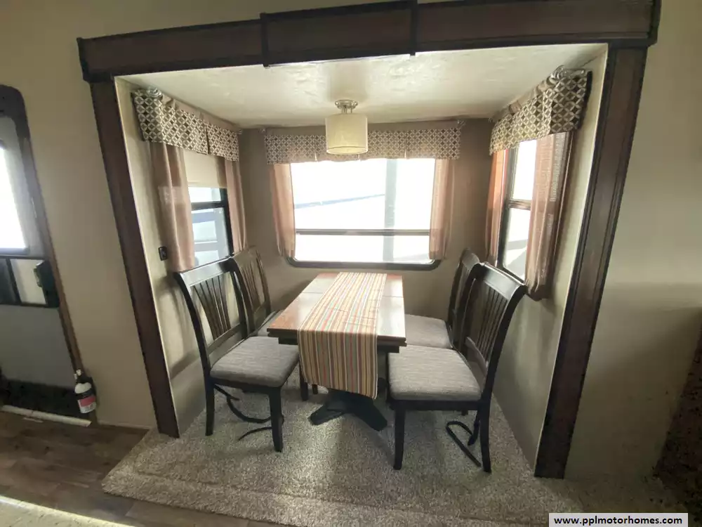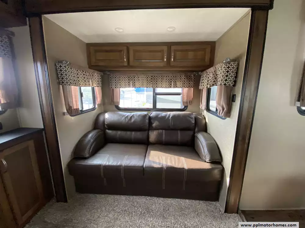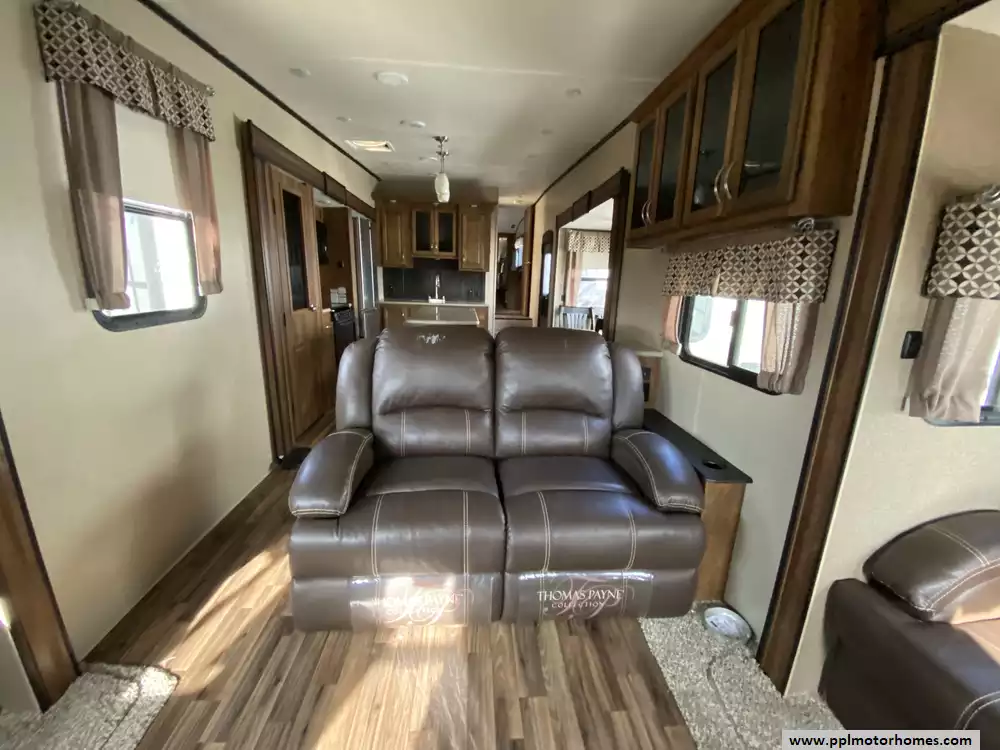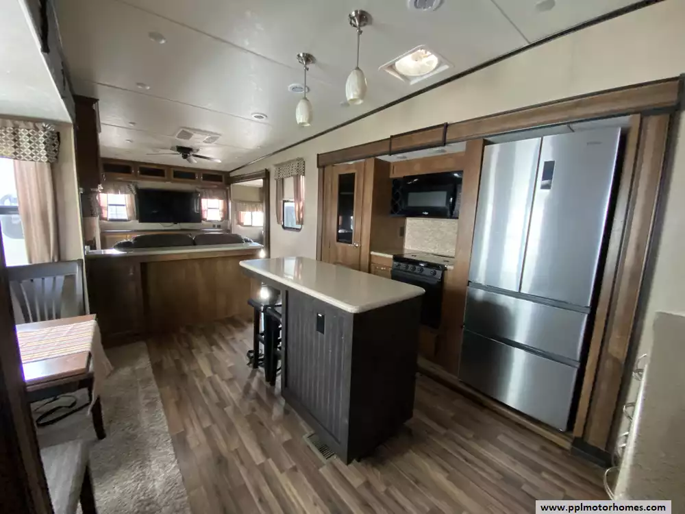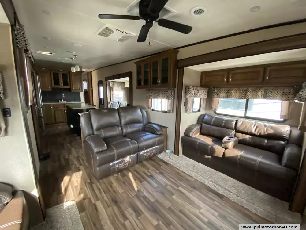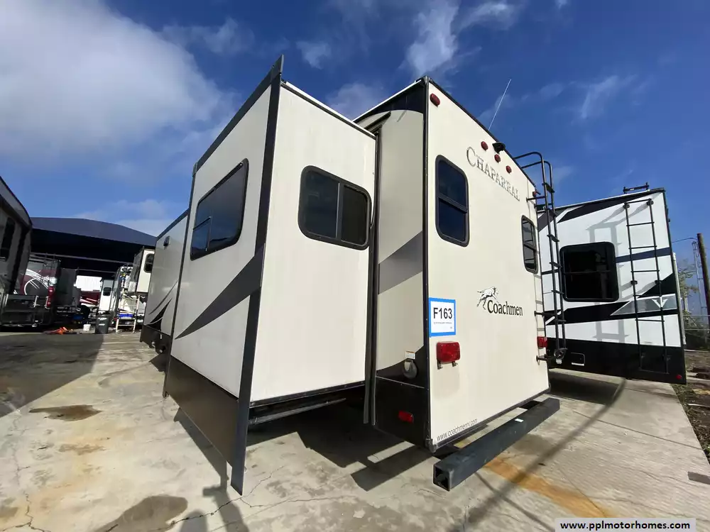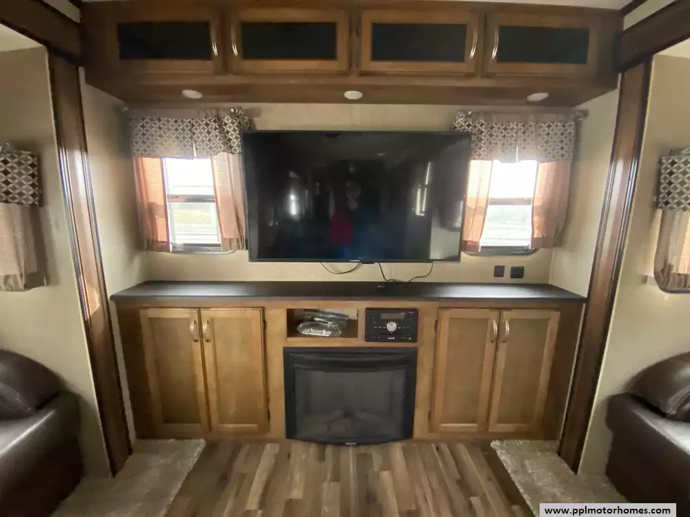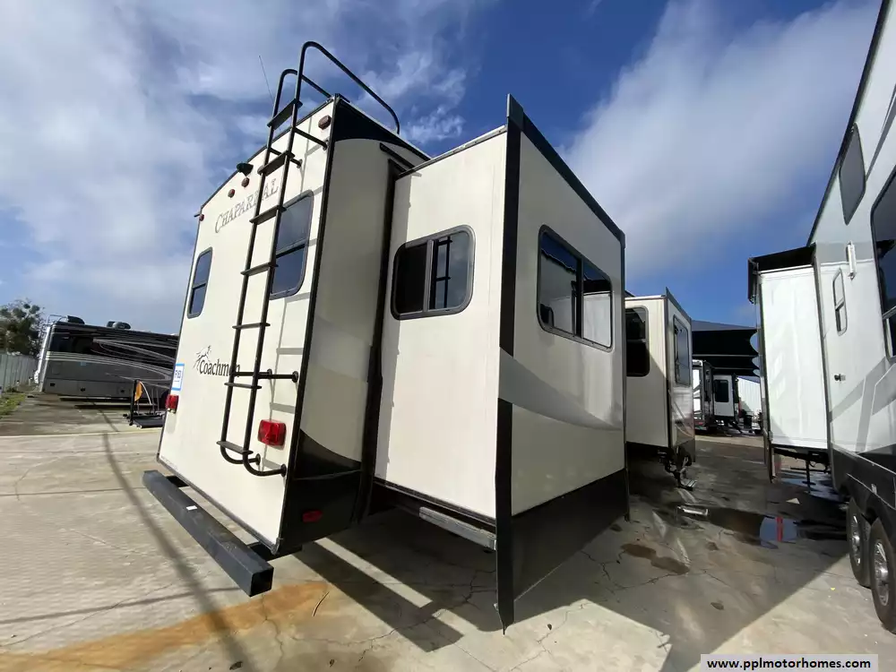 This 2018 Coachmen Chaparral 381RD has an Electric Landing Gear, 5 Slide-outs, 2 Ducted Air Conditioners, Single Door 110v Residential Refrigerator, Automatic Main Awning, Washer/Dryer Connections, Outside Stereo, 2 TVs, DVD Player, Outside Shower, Fireplace, Microwave, 3 Burner Range, Oven