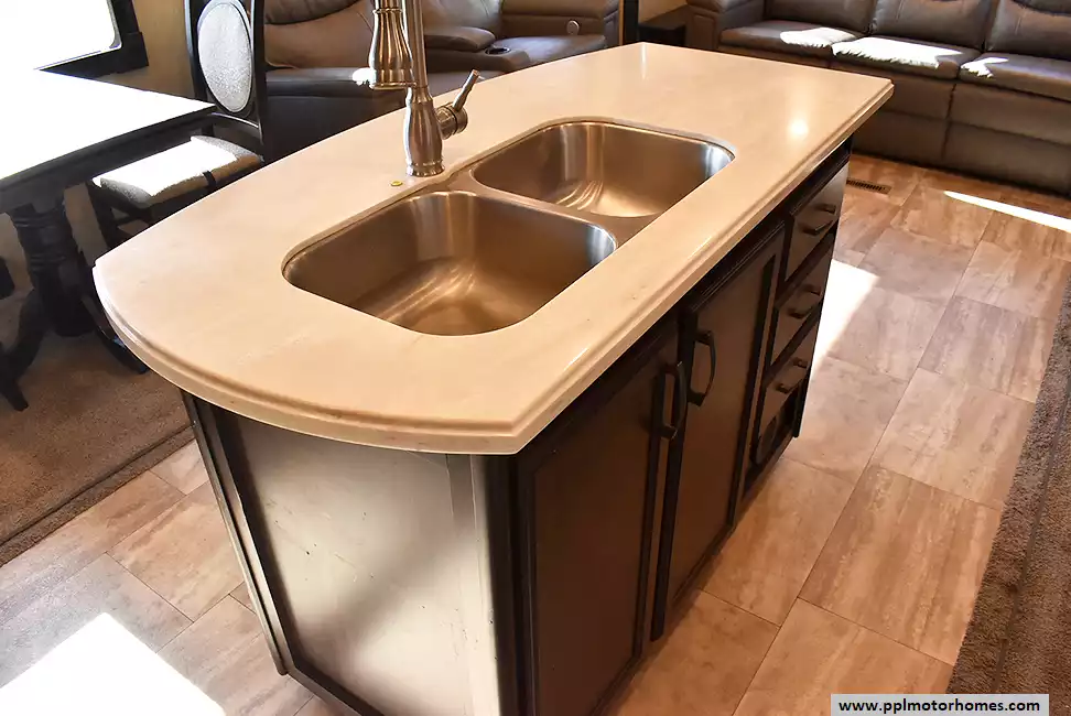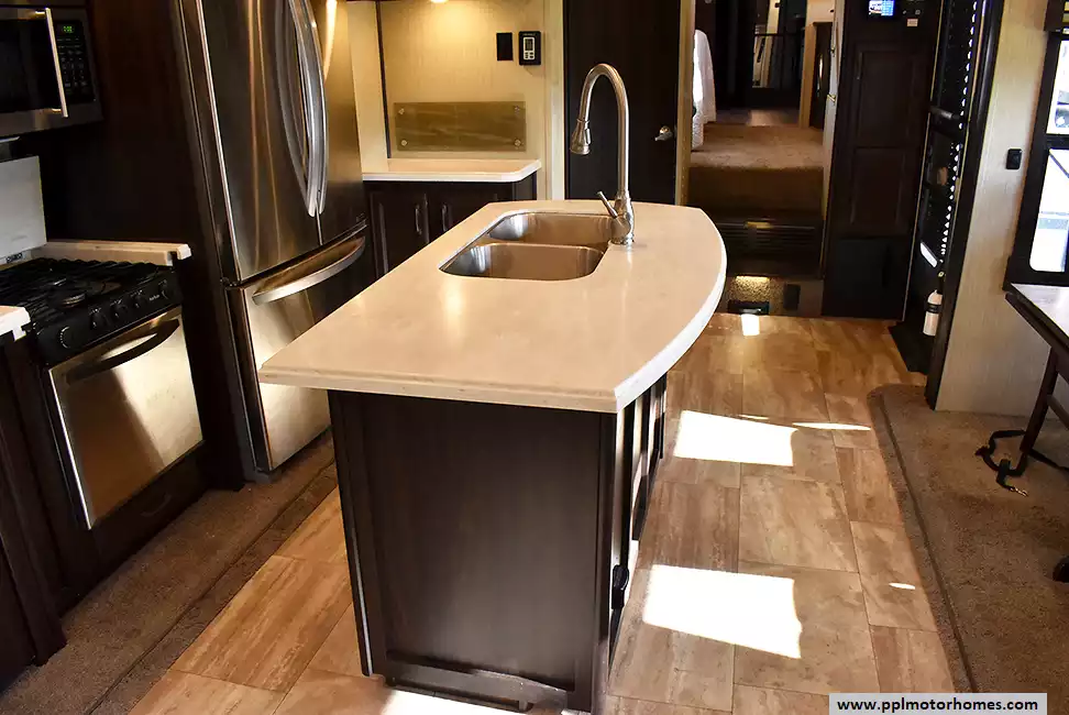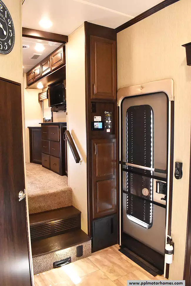 This 2018 Columbus 383FB has a Hydraulic Landing Gear, 4 Slide-outs, 2 Ducted Air Conditioners, 110v Residential Lg Refrigerator, Automatic Main Awning And Slide Awning, Washer/Dryer Connections, Outside Speakers, 2 TVs, Fireplace, Central Vacuum, Convection Microwave, 3 Burner Range, Oven