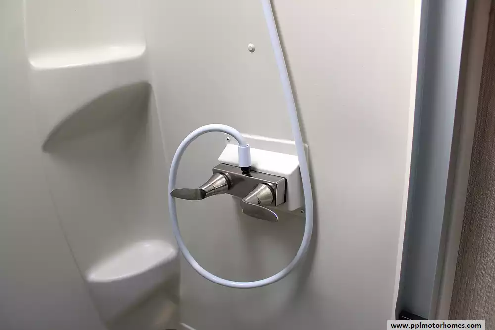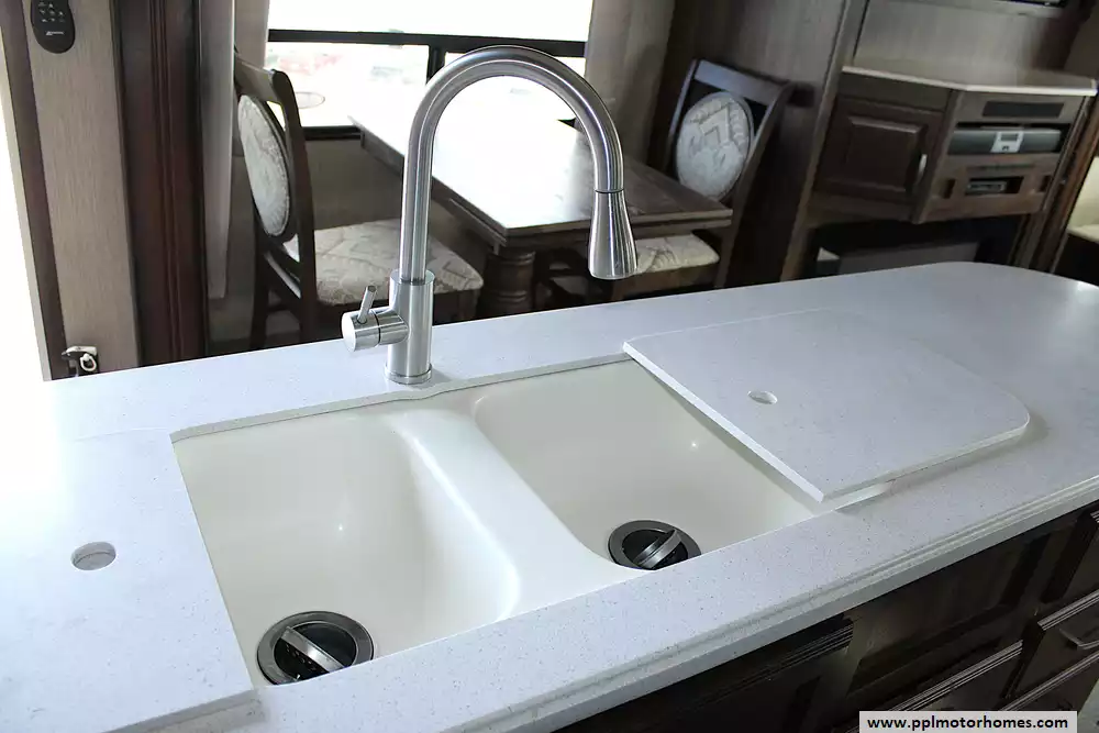 The kitchen is designed for both convenience and style, offering generous counter space, residential appliances, pantry storage, and a freestanding dinette for meals or entertaining. Thoughtful storage solutions are found throughout the unit, including overhead cabinetry, wardrobe space, and bathroom storage, giving you everything you need for longer trips or even full-time living. The spacious bathroom features a large shower with seating and skylight, while the front bedroom provides a relaxing retreat with ample closet space and dresser storage. Many models also include washer/dryer prep for added convenience on extended adventures.