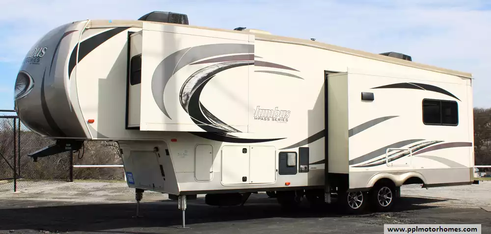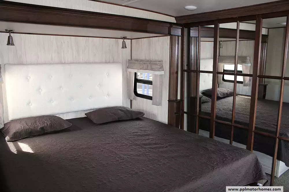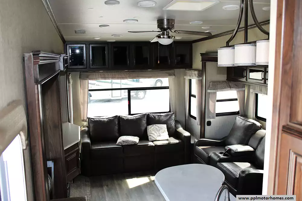 2018 Palomino 298RLC, a beautifully appointed fifth wheel that blends luxury features with practical functionality. With three slide-outs and a rear living floorplan, this coach opens up into a bright, inviting space featuring comfortable seating, an entertainment center with fireplace, and large panoramic windows that make every campsite feel like home. The private front bedroom with a queen bed plus convertible living room sleeping allows this unit to comfortably sleep up to 4 people, making it perfect for couples or extended stays with guests.