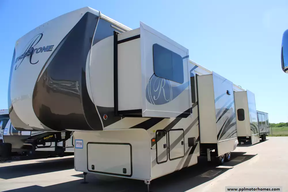 The 2018 Forest River RiverStone 39FL is a luxurious fifth-wheel RV designed for full-time living or extended travel. Measuring approximately 43 feet in length and equipped with five slide-outs, it offers expansive interior space. The front living area features dual leather recliners, a 65" LED TV, and a 5,200 BTU electric fireplace, creating a cozy environment. The kitchen boasts high-end amenities, including a full-size 18 cu. ft. French door refrigerator, a 3.7 cu. ft. oven with a 4-burner range, and solid surface countertops. A king-size bed is standard in the master suite, but this model features a queen mattress and complemented by a spacious bathroom with a shower featuring a seat. Additional comforts include dual 15,000 BTU air conditioners, a 40,000 BTU furnace, and a 20-foot power awning. Other highlights include tinted windows, 6-point hydraulic auto leveling, generator prep, bedroom fireplace, rooftop solar prep, and a brand-new roof membrane. The RV is built with durable materials, featuring aluminum framing and fiberglass sidewalls, and rides on 17.5" tires with aluminum rims. With a gross vehicle weight rating (GVWR) of 19,065 lbs and a cargo capacity of 3,121 lbs, the RiverStone 39FL is both robust and well-equipped for extended journeys! This Riverstone is eligible for PPL's financing options.