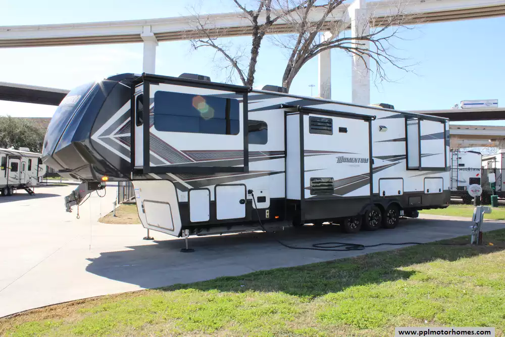 This 2018 Momentum 376TH is a luxurious and innovative fifth-wheel toy hauler designed for adventurers and outdoor enthusiasts.This model combines spacious living quarters with a versatile garage area,making it ideal for those who enjoy bringing along recreational vehicles or gear on their travels.Features Include...Hydraulic Landing Gear, Onan Gasoline Generator, 5 Slide-outs, 3 Ducted Air Conditioners, 4 Door Gas/110v Norcold Refrigerator, Automatic Main Awning And Slide Awning,Washer/Dryer,Tire Monitor,Back Up Camera and Monitor,Tankless Water Heater,Mor Ryde Equalizers, Outside Speakers, 2 TVs, Outside Shower, Microwave, 3 Burner Range,and Oven.It's designed to provide a memorable and enjoyable camping experience, whether for weekend getaways or extended trips.