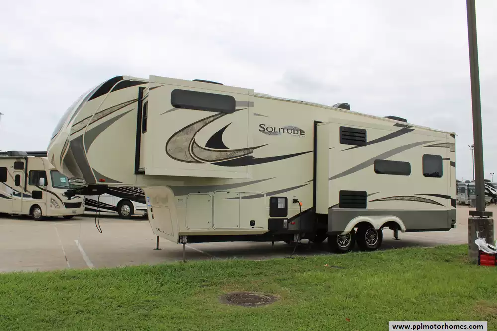This 2018 Solitude 310GK a fifth-wheel RV designed with upscale, extended-stay comfort in mind. Features Include...Hydraulic Landing Gear, 3 Slide-outs, 2 Ducted Air Conditioners, 4 Door 110v Norcold Refrigerator, Automatic Main Awning And Window Awning, Washer/Dryer Connections, Outside Speakers, 2 TVs, Outside Shower, Fireplace, Convection Microwave, 4 Burner Range, and Oven. The 2018 Solitude 310GK presents a spacious, upscale layout ideal for long-term travel or full-time RV living.