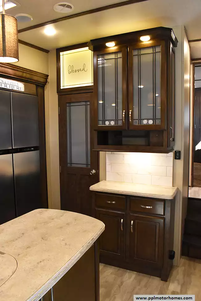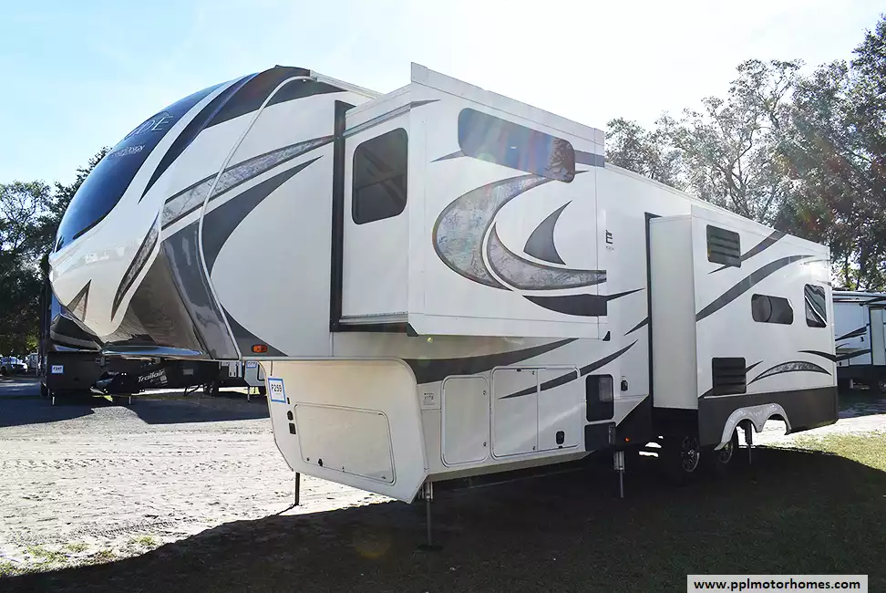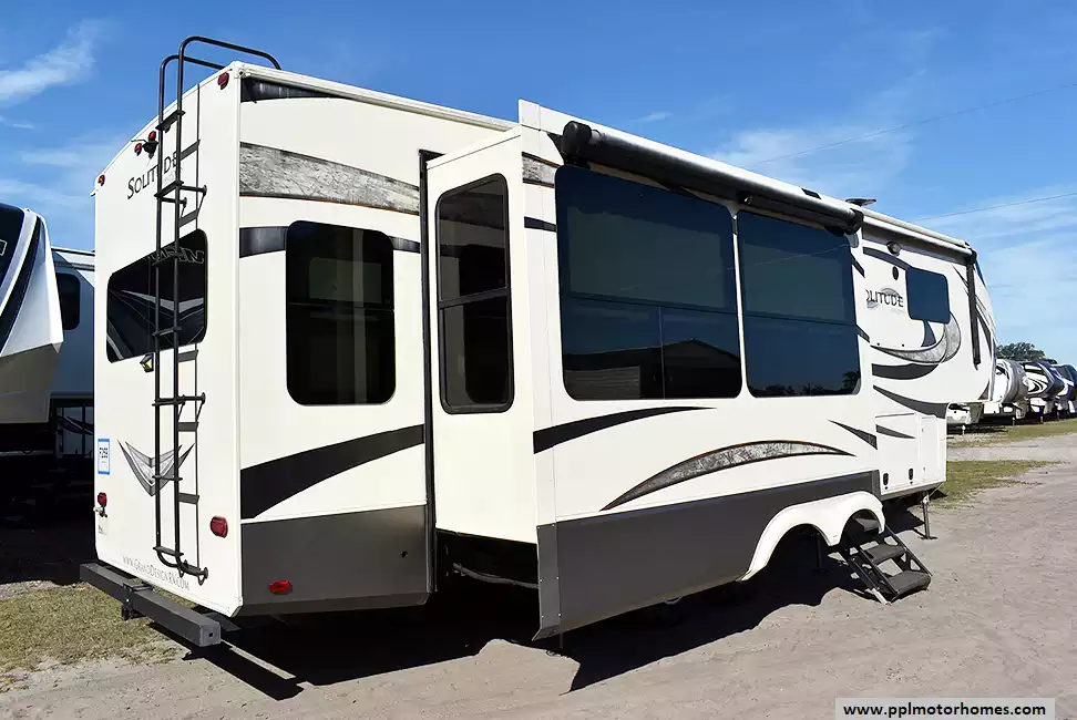 This 2018 Solitude 310GK has a Hydraulic Landing Gear, 3 Slide-outs, 2 Ducted Air Conditioners, 4 Door Gas/12v Norcold Refrigerator, Automatic Main Awning, Washer/Dryer Connections, Outside Speakers, 2 TVs, Outside Shower, Fireplace, Microwave, 3 Burner Range, Oven