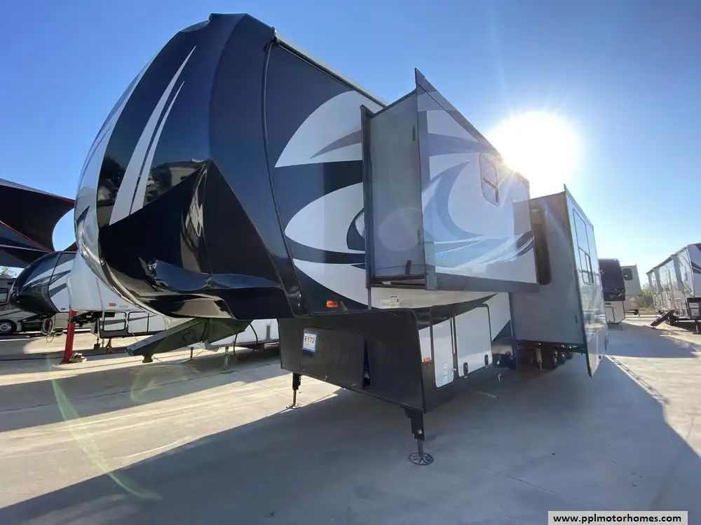 This 2018 Cyclone 4115 has a Hydraulic Landing Gear, 2 Slide-outs, Kohler Diesel Generator, 3 Ducted Air Conditioners, Double Door 110v Residential Furrion Refrigerator, Automatic Main Awning, Washer/Dryer Connections, Satellite Dish, Outside Entertainment System, 3 TVs, 3 DVD Players, Outside Shower, Fireplace, Central Vacuum, Convection Microwave, 3 Burner Range