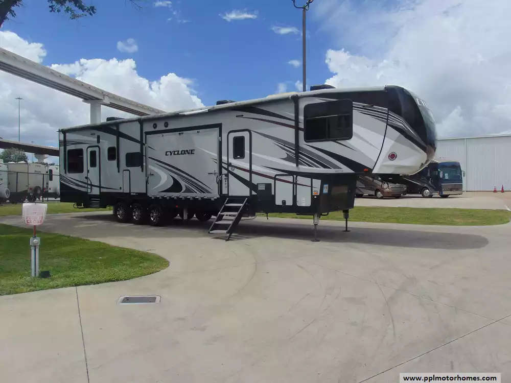 This 2018 Cyclone 4270 is a luxurious fifth-wheel toy hauler designed to cater to outdoor enthusiasts who seek adventure without compromising on comfort and style.Features Include...2 Slide-outs, Onan Gas Generator, Residential Hisense Refrigerator, Automatic Main Awning, Washer/Dryer Connections, Heated Tanks,2 Floating Patios,MorRyde Steps,Filling Station, Outside Speakers, 3 TVs, Outside Shower, Convection Microwave, 3 Burner Range,and Oven.Its robust construction, spacious and well-appointed interior, and versatile garage space make it an ideal choice for those who want to enjoy the best of both worlds.