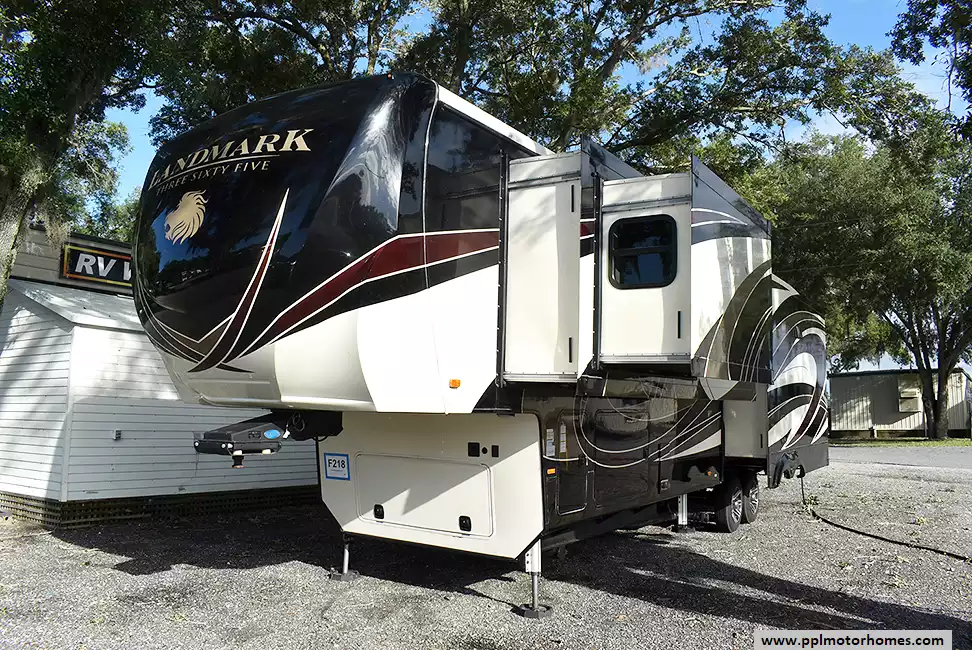 This 2018 Heartland Landmark 365 Oshkosh is a luxurious fifth wheel designed for ultimate comfort and convenience. Featuring a spacious floor plan, it includes a gourmet kitchen with high-end appliances, a large living area with a fireplace and theater seating, and a master suite with a king-size bed and ample storage. The Oshkosh model also boasts a luxurious bathroom with a walk-in shower and elegant finishes throughout, making it perfect for extended stays and full-time RV living.