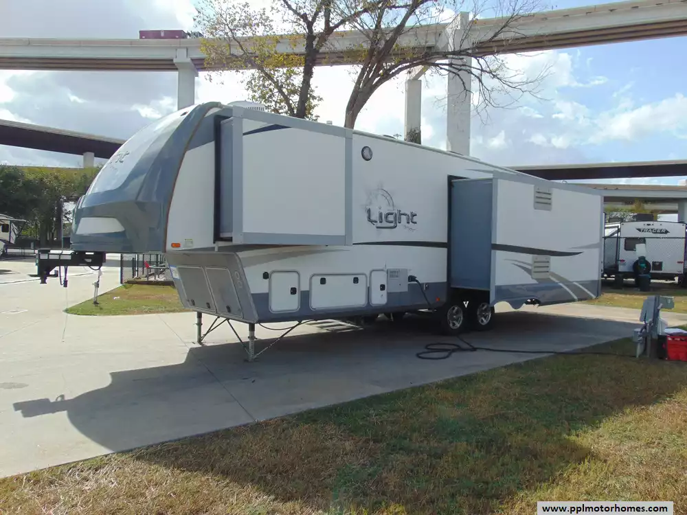 This 2018 Light 319RLS is designed to offer a balance of comfort,functionality,and towing ease.It's manageable for mid-sized trucks while providing ample interior space.The "Light" series emphasizes lightweight,durable materials and a streamlined design,making it easier to tow and maneuver compared to heavier fifth wheels. Features Include...3 Slide-outs, 1 Non-Ducted And 1 Ducted Air Conditioner, Double Door Gas/110v Norcold Refrigerator, Automatic Main Awning, Washer/Dryer Connections, Outside Speakers, 2 TVs, DVD Player, Fireplace, Microwave, 3 Burner Range,and Oven.This is a versatile, comfortable fifth-wheel trailer ideal for travelers seeking a lightweight option with spacious interiors and quality amenities for extended adventures.