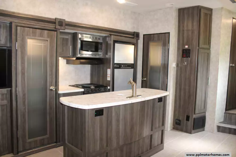 Specs: Length: 33.5 ft., Width: 8.1 ft., Height: 10.11 ft., Interior Height: 6.10 ft., Payload Capacity: 2,117 lbs., Total Fresh Water Tank Capacity: 51 gal., Total Grey Tank Capacity: 58 gal., Total Black Water Tank Capacity: 29 gal.
