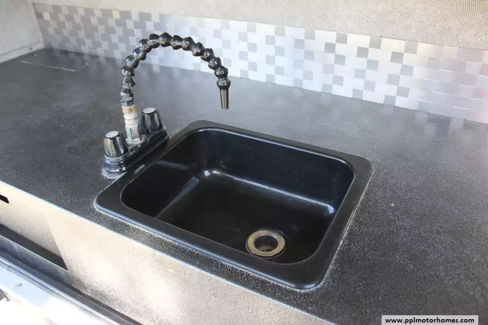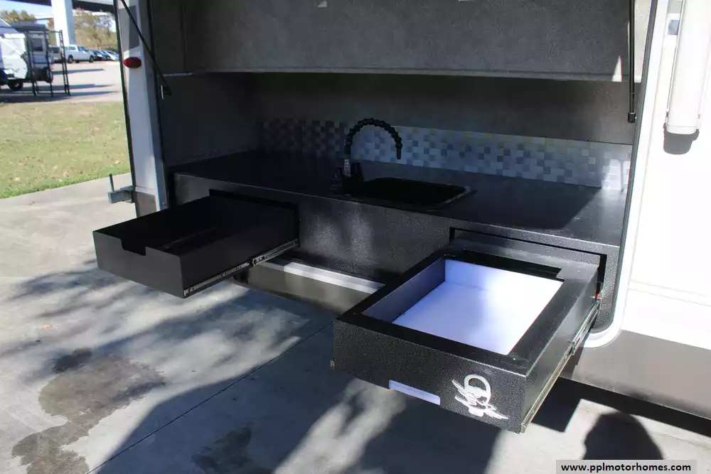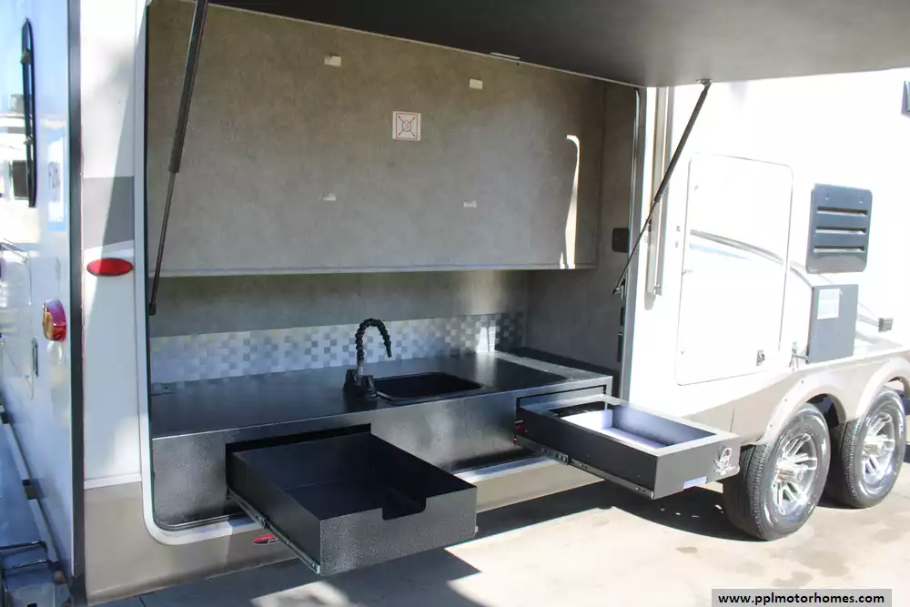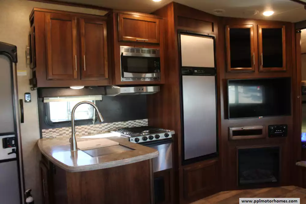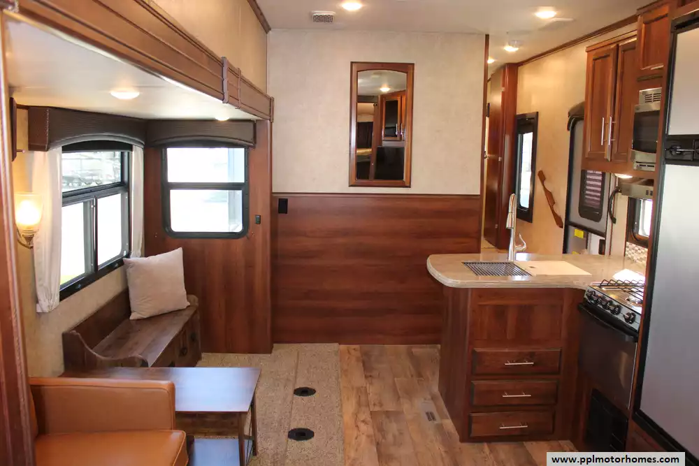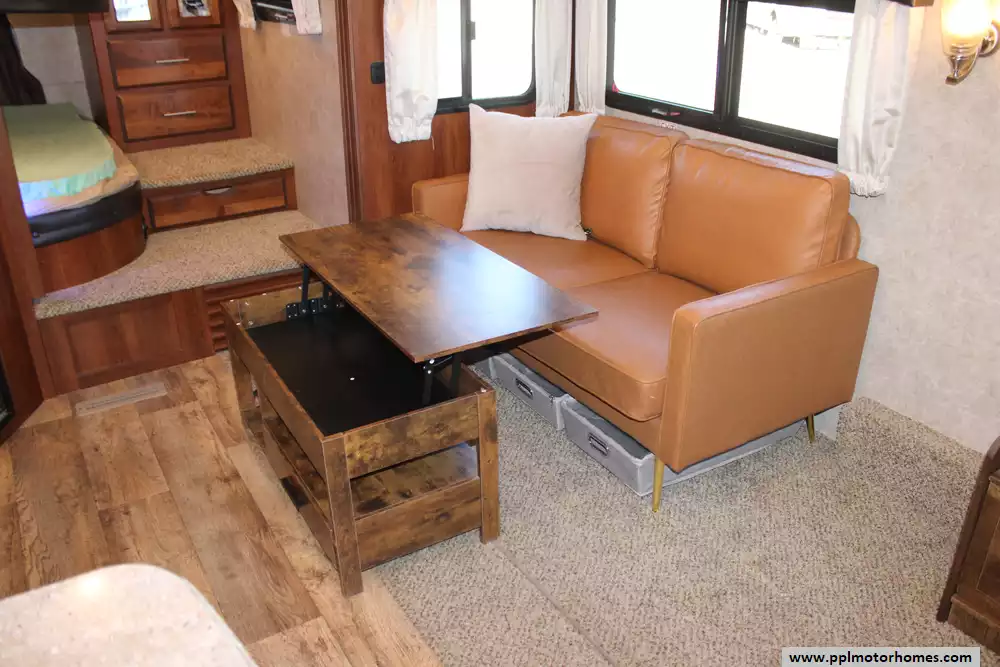 Specs: Length: 34.9 ft., Width: 8 ft., Height: 12.41 ft., Interior Height: 6.25 ft., Payload Capacity: 1,475 lbs., Total Fresh Water Tank Capacity: 43 gal., Total Gray Water Tank Capacity: 73.5 gal., Total Black Water Tank Capacity: 32.5 gal.