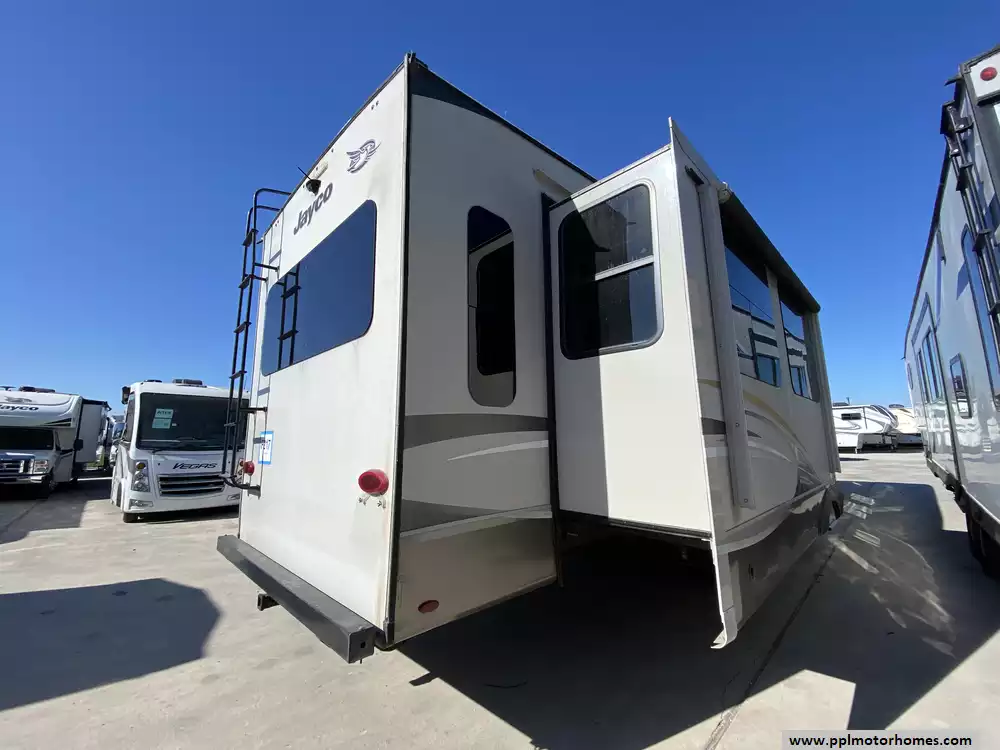 This 2018 Jayco Eagle 355MBQF has an Electric Landing Gear, 4 Slide-outs, 2 Ducted Air Conditioners, Double Door 110v Residential Whirlpool Refrigerator, In-Fridge Ice Maker, Automatic Main Awning And Window Awning, Winegard, Outside Speakers, 2 TVs, DVD Player, Outdoor Grill, Outdoor Kitchen, Outside Shower, Microwave, 3 Burner Range, Oven