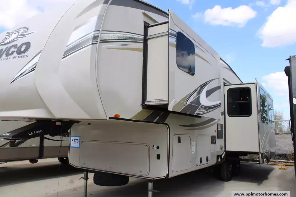 This 2018 Jayco Eagle 28.5 RSTS has an Electric Landing Gear, 3 Slide-outs, 2 Ducted Air Conditioners, Double Door Gas/110v Dometic Refrigerator, Automatic Main Awning, Outside Speakers, 2 TVs, DVD Player, Outdoor Grill, Fireplace, Microwave, 3 Burner Range, Oven