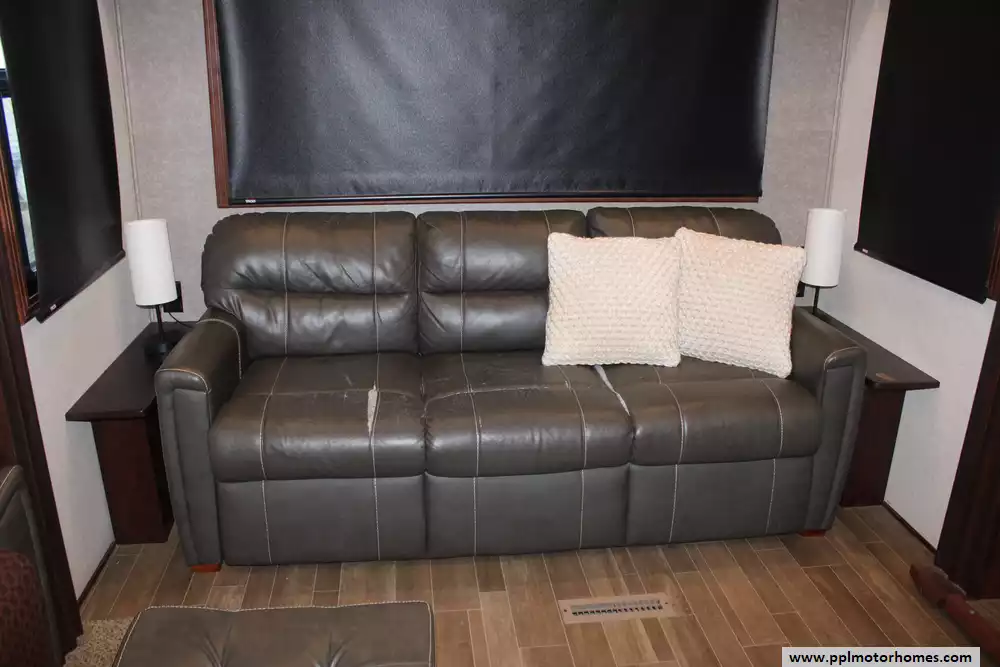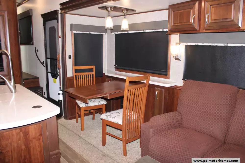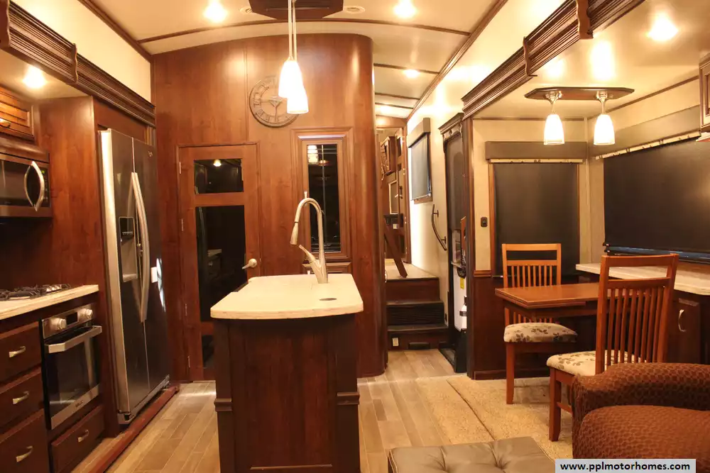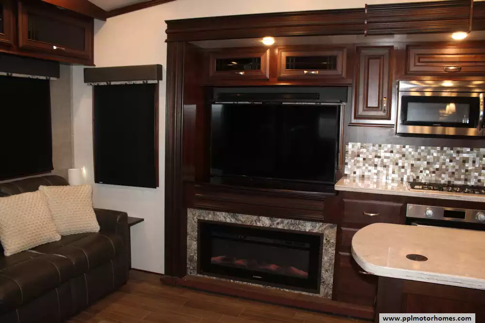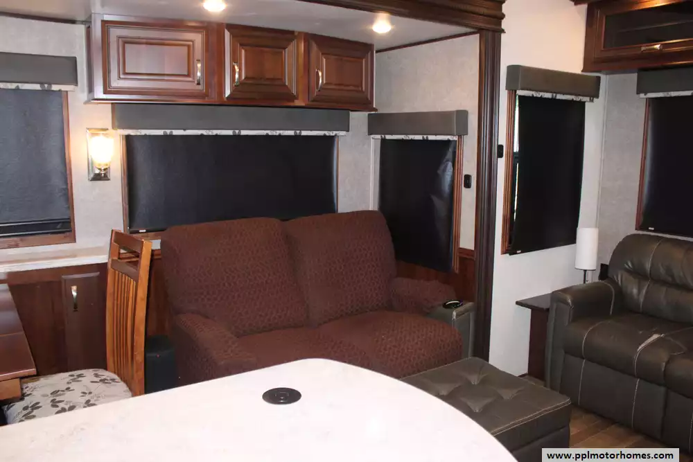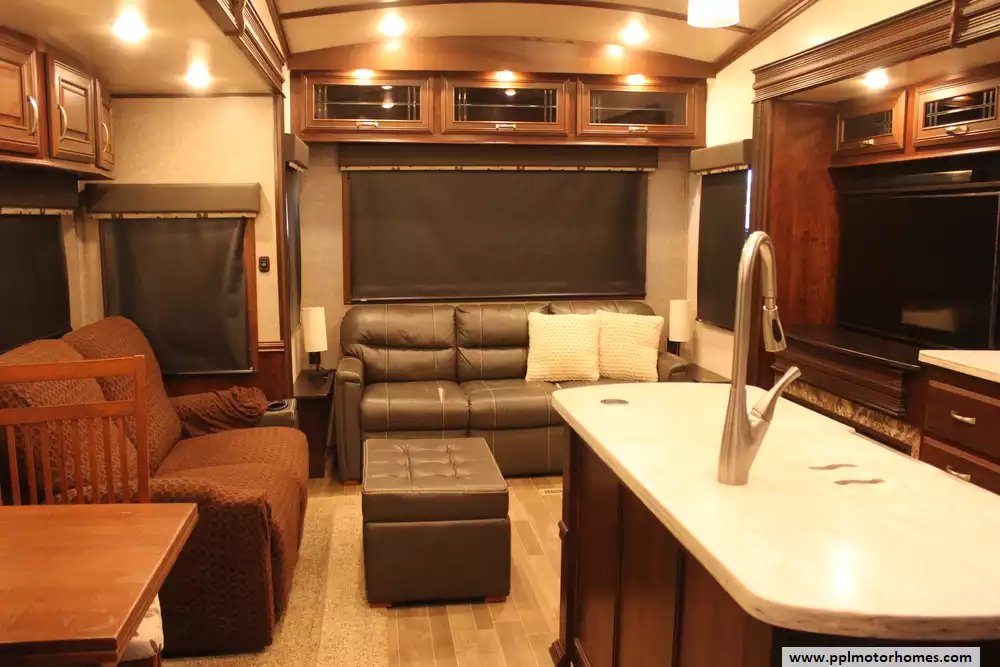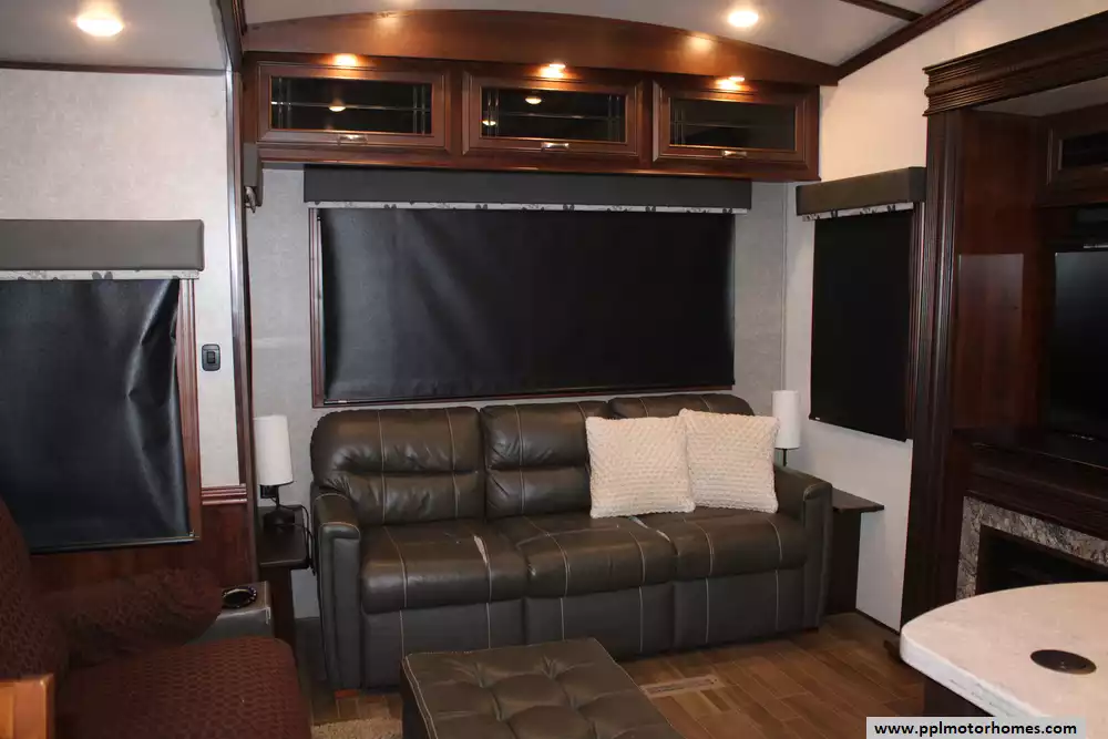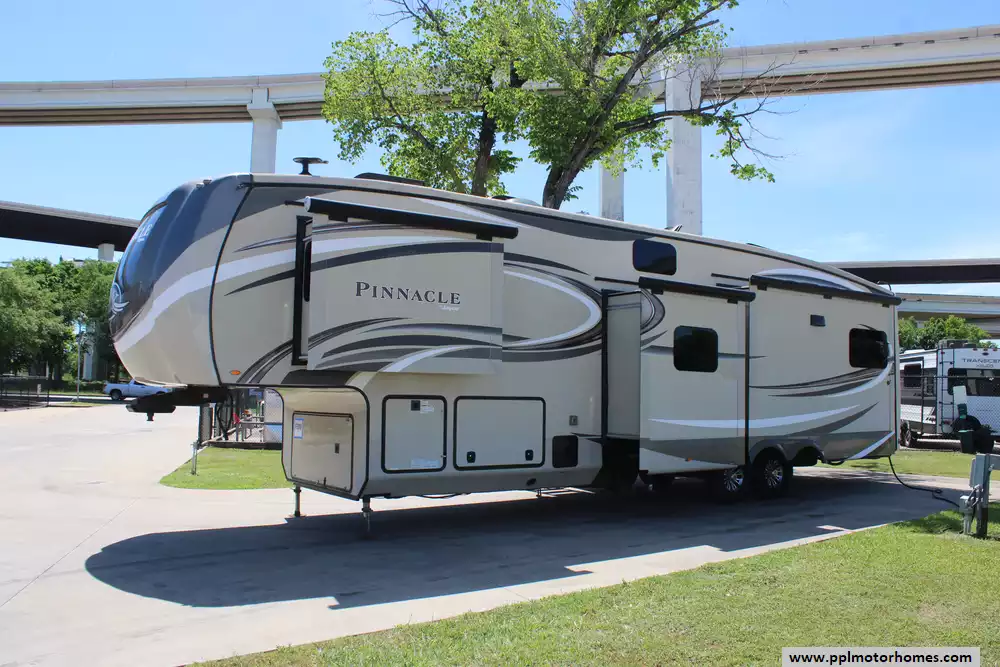 Experience the pinnacle of luxury living with this 2018 Pinnacle 37MDQS, a 41-foot fifth wheel engineered for the discerning traveler. Built with a durable fiberglass body and a robust rubber roof, this four-slide-out coach is celebrated for its residential-grade construction and highly sought-after mid-den floorplan. This versatile layout provides a private bonus room that is perfect for a home office or a guest suite, while the high ceilings and wide-body design create an exceptionally spacious atmosphere. Outside, the automatic main and slide awnings offer effortless shade, complemented by an outside entertainment system and a convenient outside shower for the ultimate outdoor living experience.