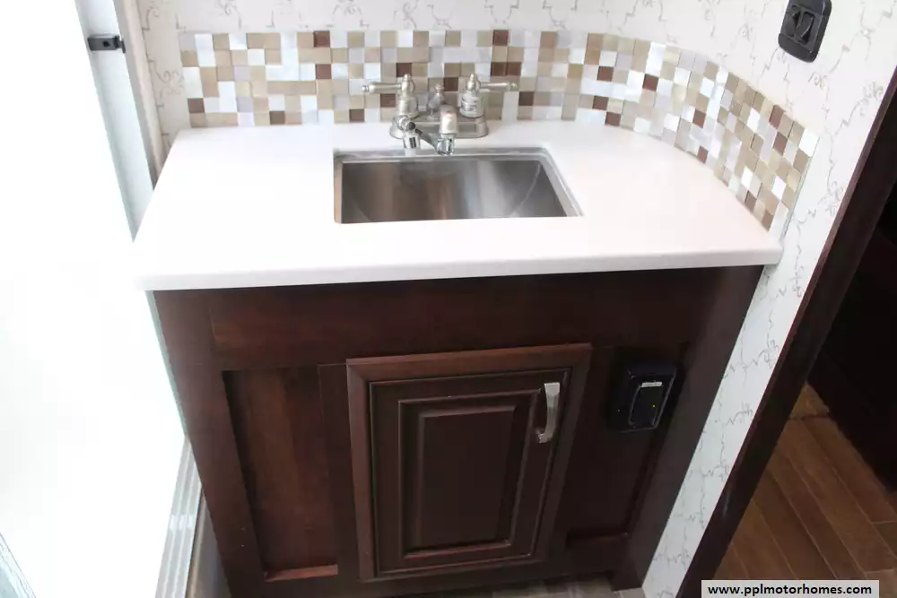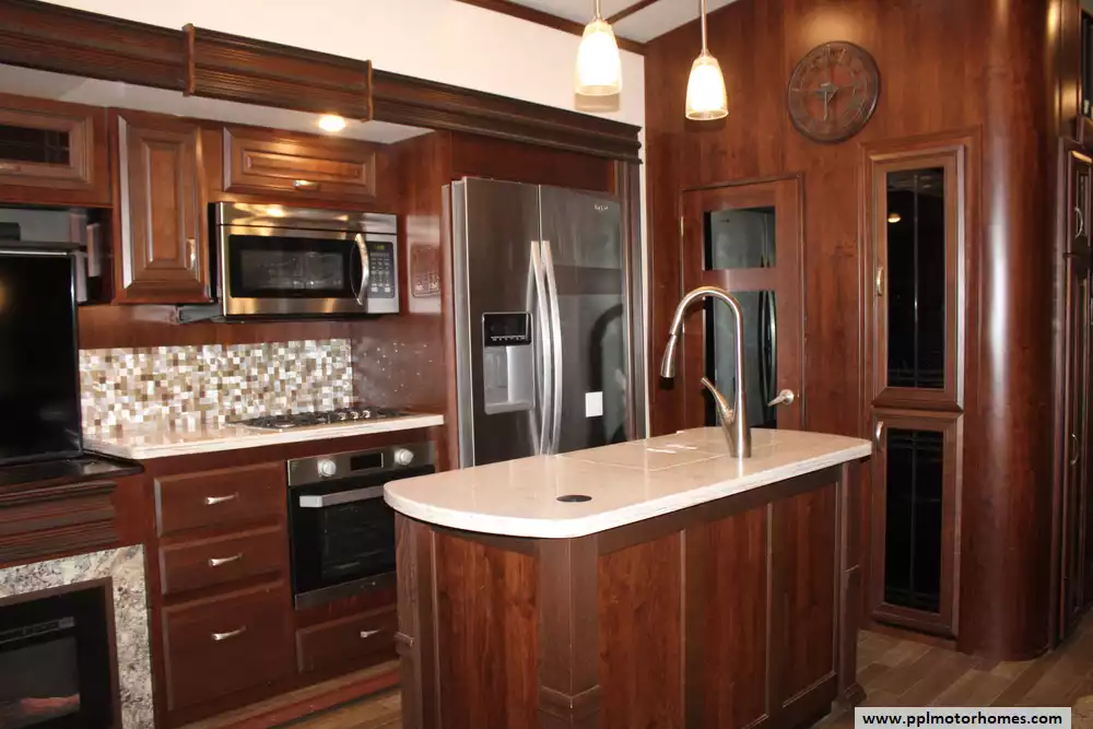 Specs: Length: 41.7 ft., Width: 8.5 ft., Height: 13.33 ft., Interior Height: 6.92 ft..Payload Capacity: 2,985 lbs., Total Fresh Water Tank Capacity: 85 gal., Total Grey Tank Capacity: 87 gal., Total Black Water Tank Capacity: 50 gal.